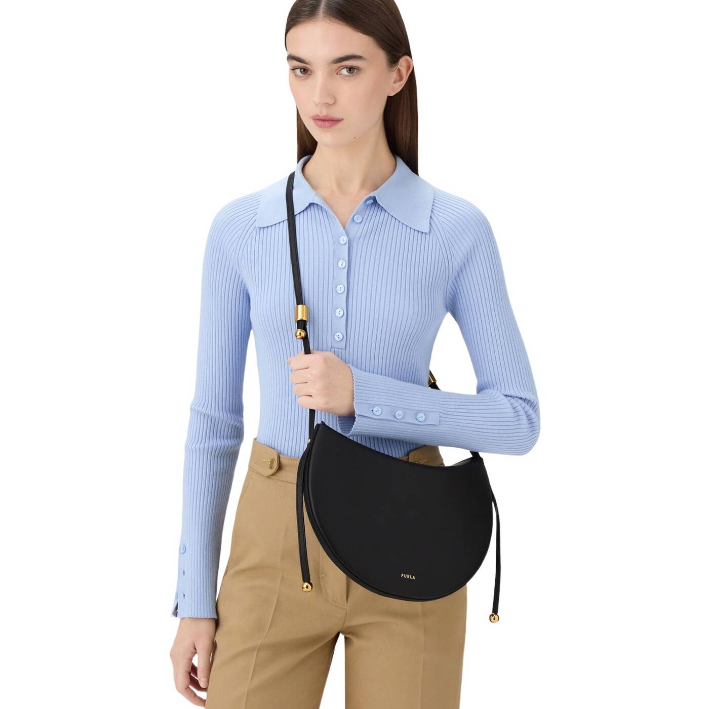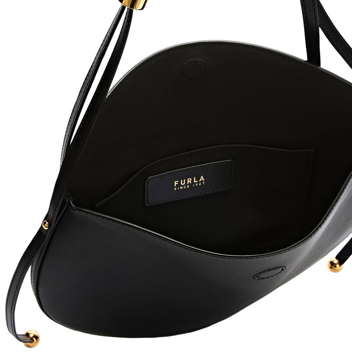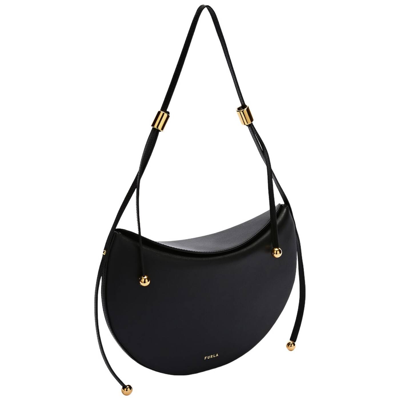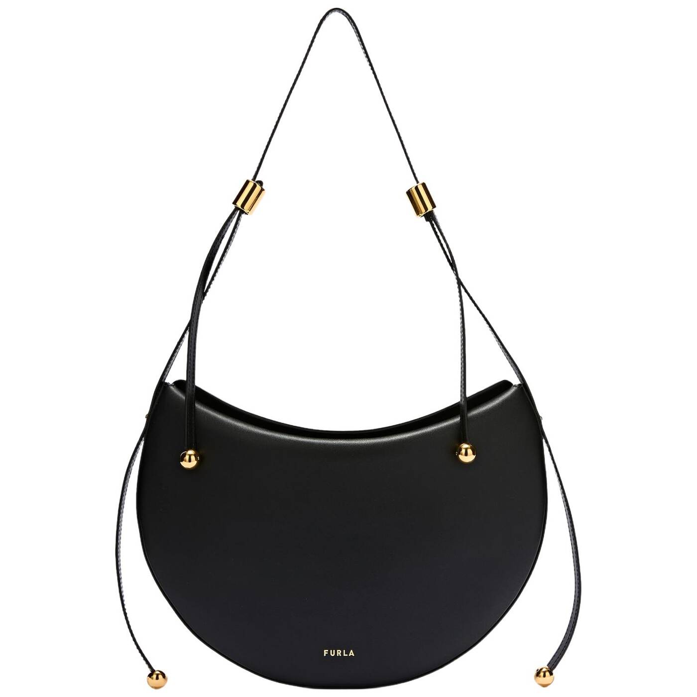 Die Furla Moonstone Schultertasche weist eine moderne Sattelform auf, und ihr Design aus Kalbsleder besticht durch klare, abgerundete Linien. Ein verstellbarer, fester Schulterriemen bietet verschiedene Styling-Optionen, während die zylindrische Hardware und zwei Sfera-Elemente für einen Hauch Originalität sorgen.