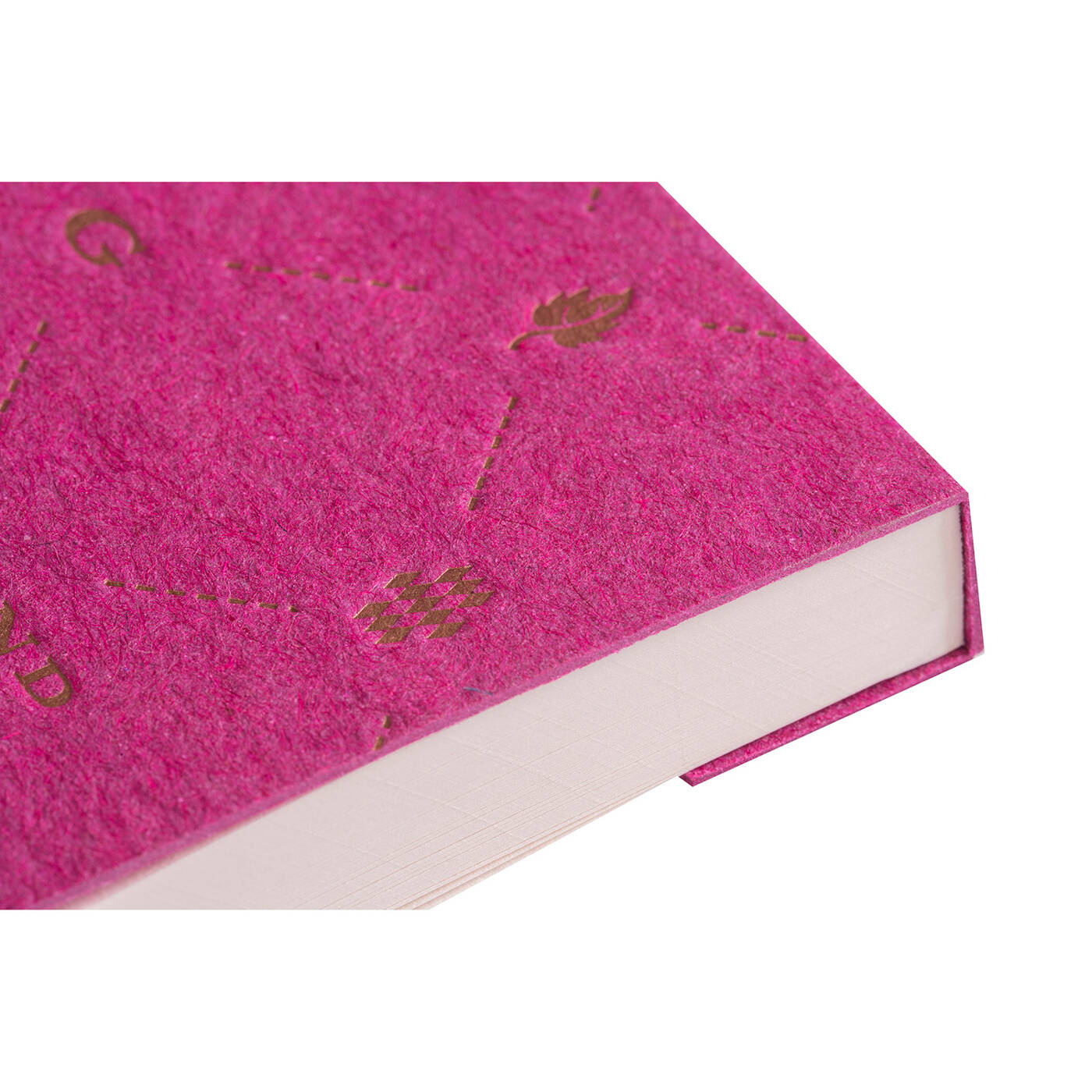 • Cover aus einem leuchtend pinkem Naturmaterial wurde im Buchdruck veredelt
