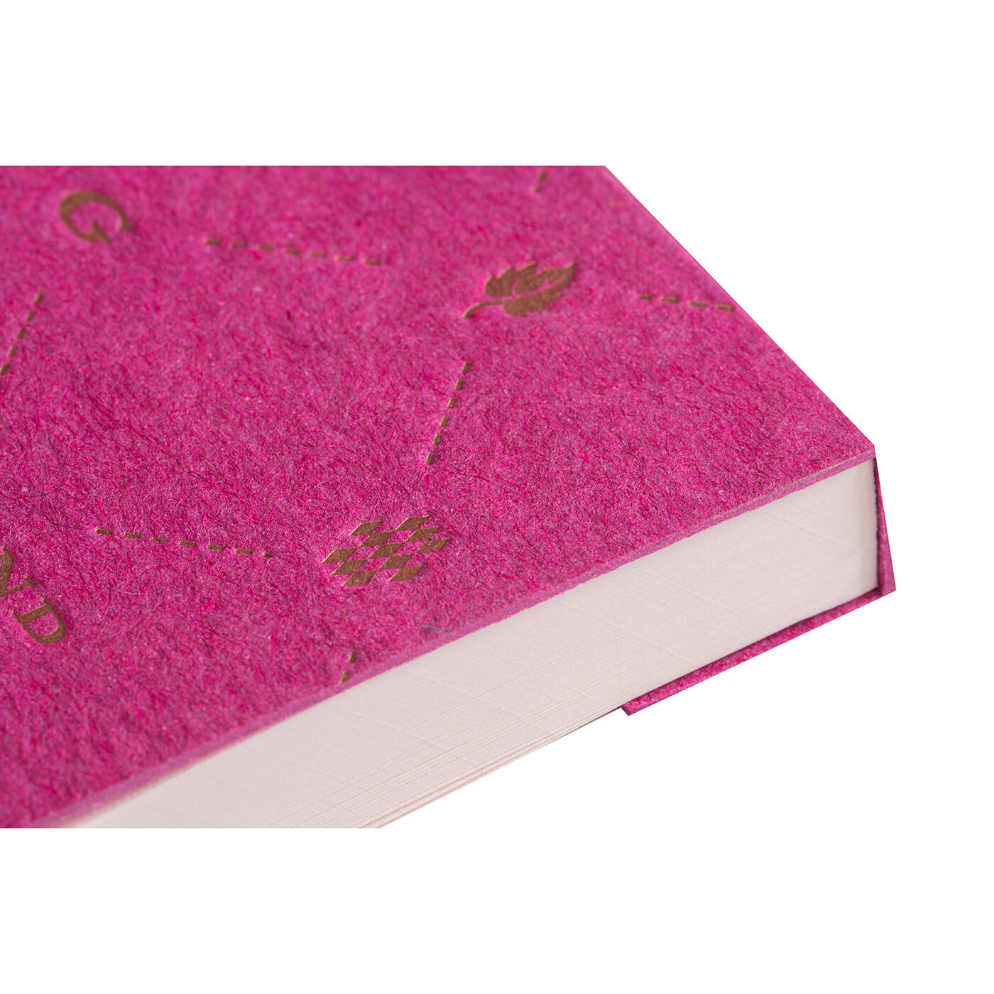• Cover aus einem leuchtend pinkem Naturmaterial wurde im Buchdruck veredelt