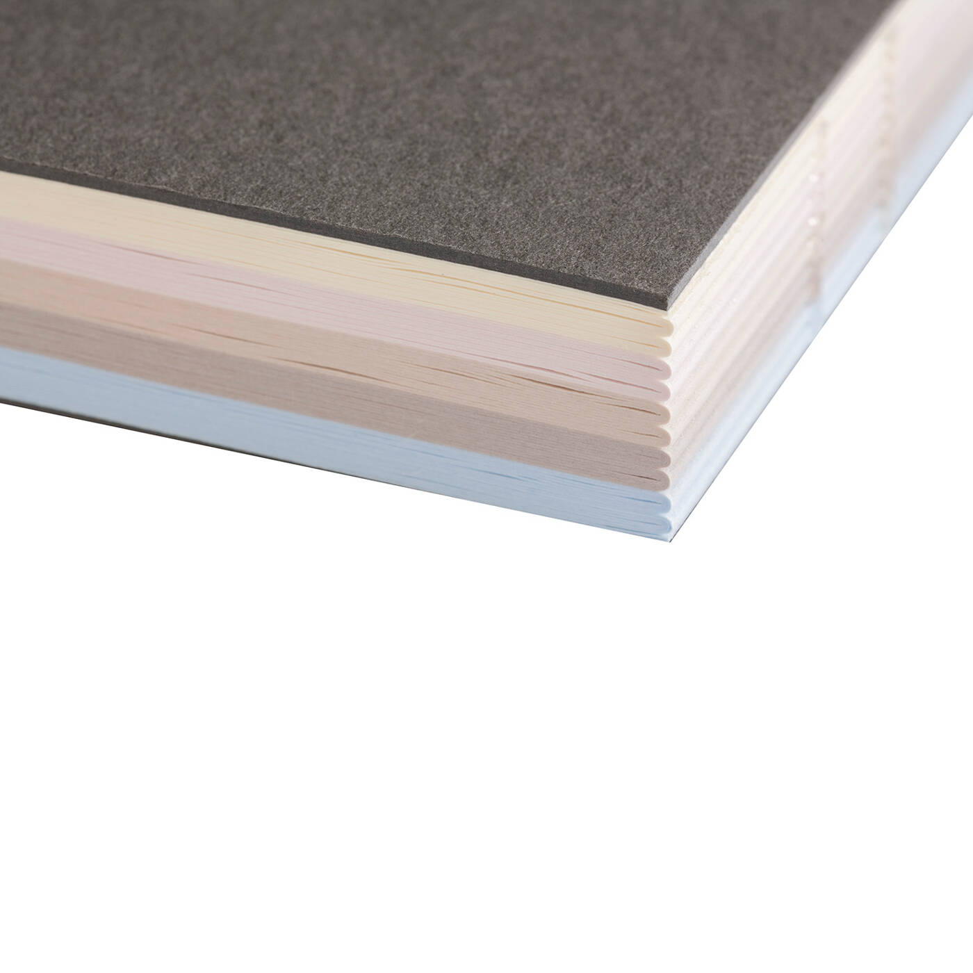 • Offene, handgearbeitete Fadenbindung, die die Registerseiten des Innenblocks fest zusammenhält