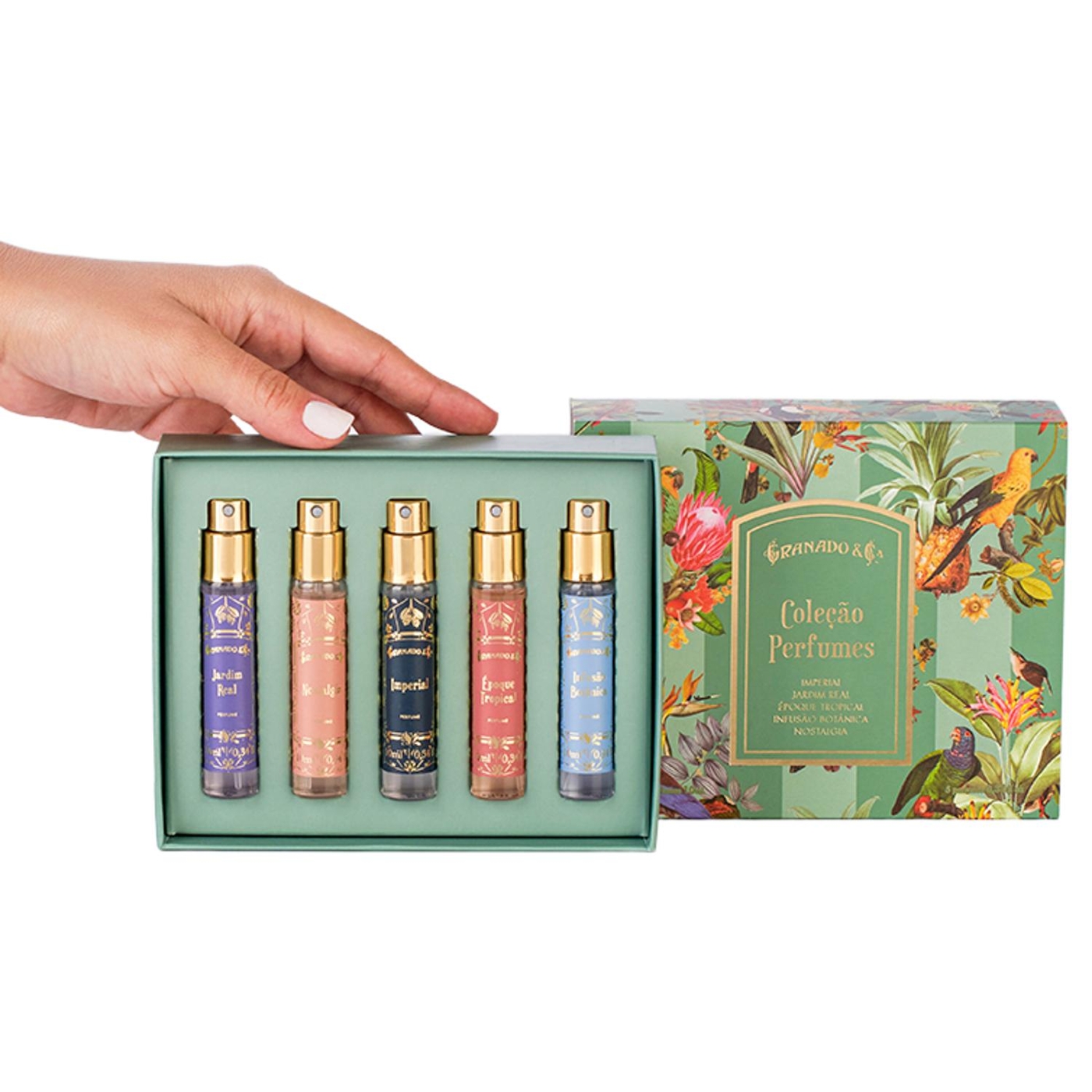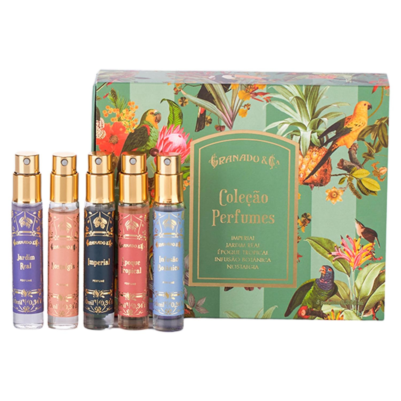 Die Kollektion Tropical Birds ist inspiriert vom Parfümuniversum von Granado mit einer botanischen Illustration im Vintage-Stil, die Elemente der brasilianischen Fauna und Flora hervorhebt, dargestellt in imposanten und äußerst eleganten Kits und Sets. Das Set Perfumes Vintage Collection präsentiert die wichtigsten Parfums der Linie in einer exklusiven Größe!