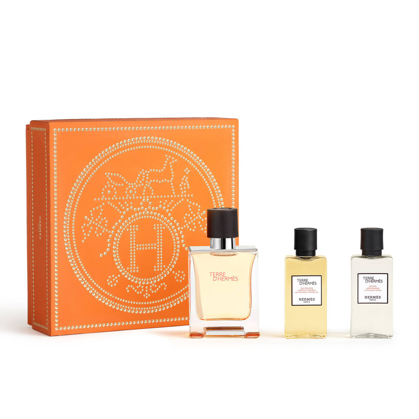Die Geschenkbox enthält ein Eau de Toilette Terre d’Hermès im 50-ml-Flakon, 40 ml Duschgel für Körper und Haar und 40 ml Aftershave-Lotion.