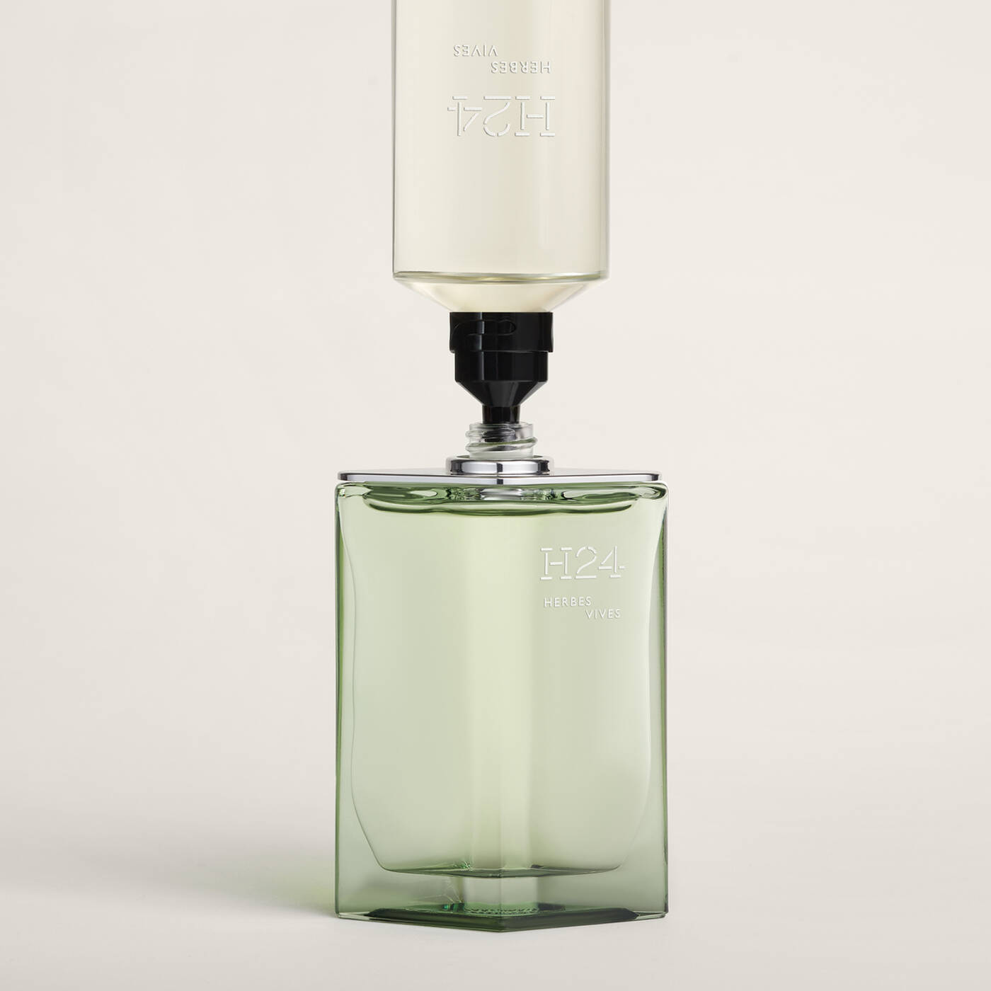 Dank des Nachfüllflakons Eau de Parfum H24 Herbes Vives können die 100- und 50-ml-Flakons wieder befüllt werden. Ein Objekt, das geschaffen wurde, um zu bleiben, und zugleich eine umweltbewusste Geste.