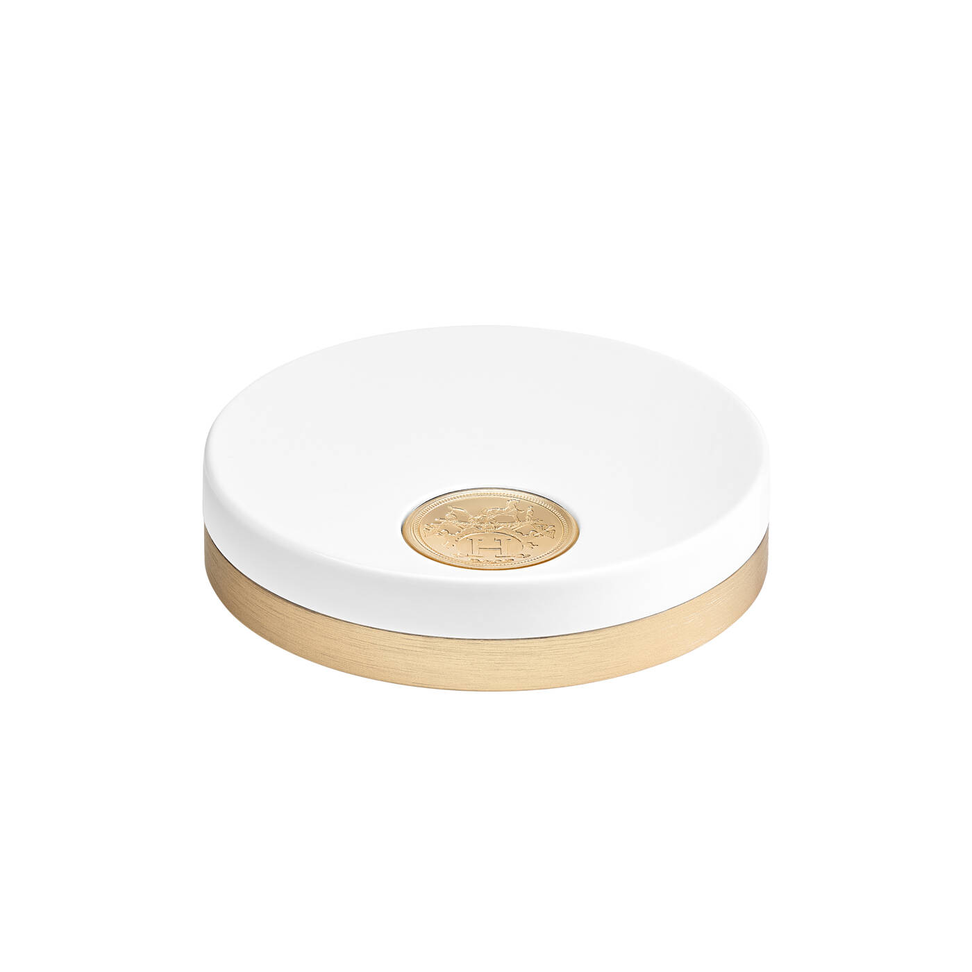 Mit seinem runden Gehäuse und dem exzentrisch versetzten Spiegel zeichnet sich dieses von Pierre Hardy entworfene Objekt in Weiß und Gold durch seine Leichtigkeit aus, da es für den Gebrauch unterwegs konzipiert wurde. In der orangefarbenen Box steckt der Inbegriff eines Hermès-Objekts.