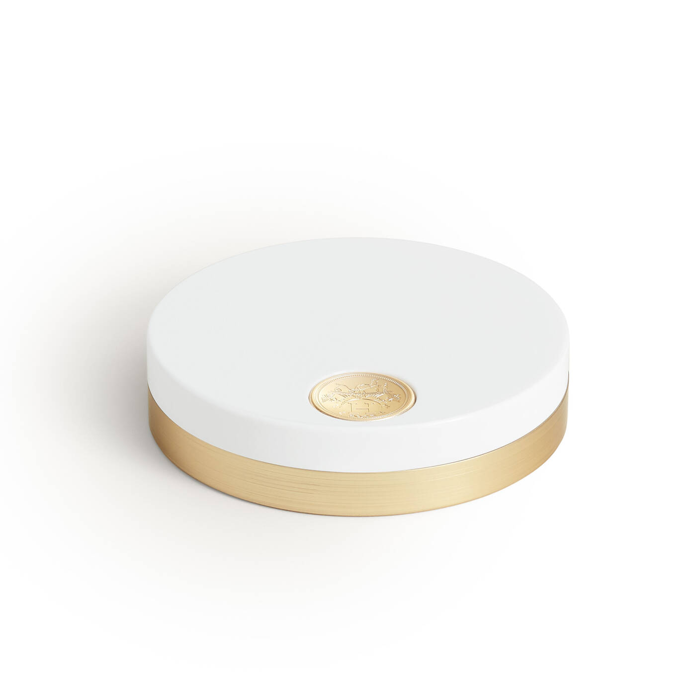 Die Details und Farben des Motivs sorgen für ein subtiles, elegantes Design. Die kompakte Oberfläche des Puders ist eine wahre technische Meisterleistung und eine Ode an die von Hermès zelebrierte Kunst der Lederintarsienarbeit. Das runde, in strahlendem Weiß und Gold gehaltene Gehäuse wurde von Pierre Hardy entworfen und zeichnet sich durch seine großzügige Form aus.