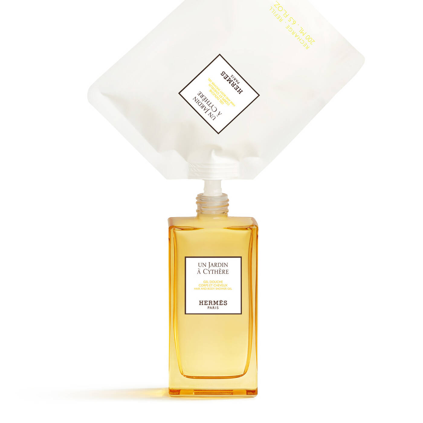 Die geraden Linien des Flakons erstrahlen in leuchtendem Gelb, der emblematischen Farbe des Eau de Toilette Un Jardin à Cythère, und weisen zwei charakteristische Elemente von Hermès auf: den H-förmigen Boden und den "Clou de Selle“-Sattlernagel, der auf den Pumpkopf graviert ist.