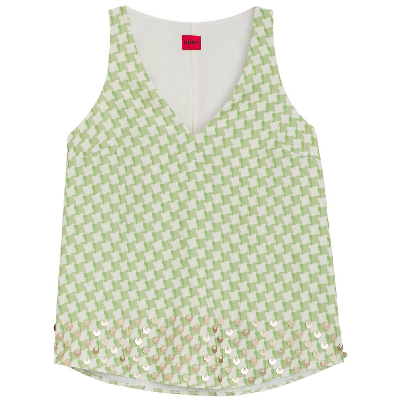 Festliches hugo top mit geometrischem statement-print, dessen saum mit pailletten verziert ist. aus softem kreppgewebe. tiefer v-ausschnitt.