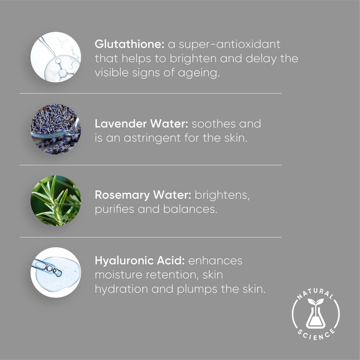 Der wichtigste Inhaltsstoff, Glutathion, hat sich in unseren wissenschaftlichen Studien als starkes Antioxidans erwiesen. Es verzögert Zellschäden und schützt die Haut-DNA, um die Zeichen der Hautalterung zu der Hautalterung zu reduzieren. Glutathion erhöht außerdem den Feuchtigkeitsgehalt der Haut und hilft dabei, dunkle Flecken aufzuhellen und die Haut zum Strahlen zu bringen.