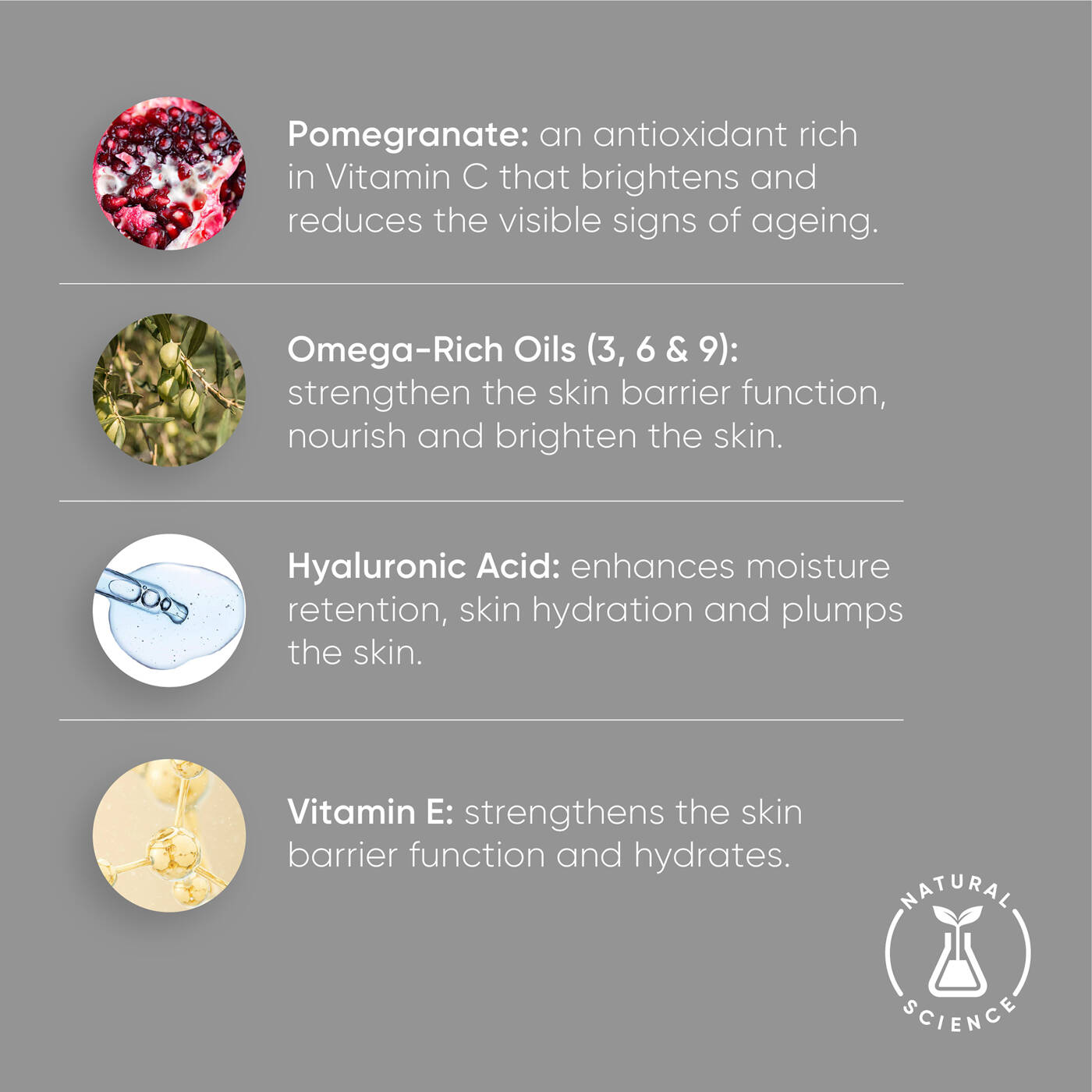 Enthaltenes Jojobaöl und ein Multi-Öl-Omega-Komplex nähren und unterstützen die Hautbarriere gegen Umweltstress. Hyaluronsäure in Kombination mit einem beruhigenden Komplex aus Granatapfel, Pro-Vitamin B5, Vitamin E und Aloe-Blatt-Saft pflegen und bewahren den Feuchtigkeitsgehalt der Haut.