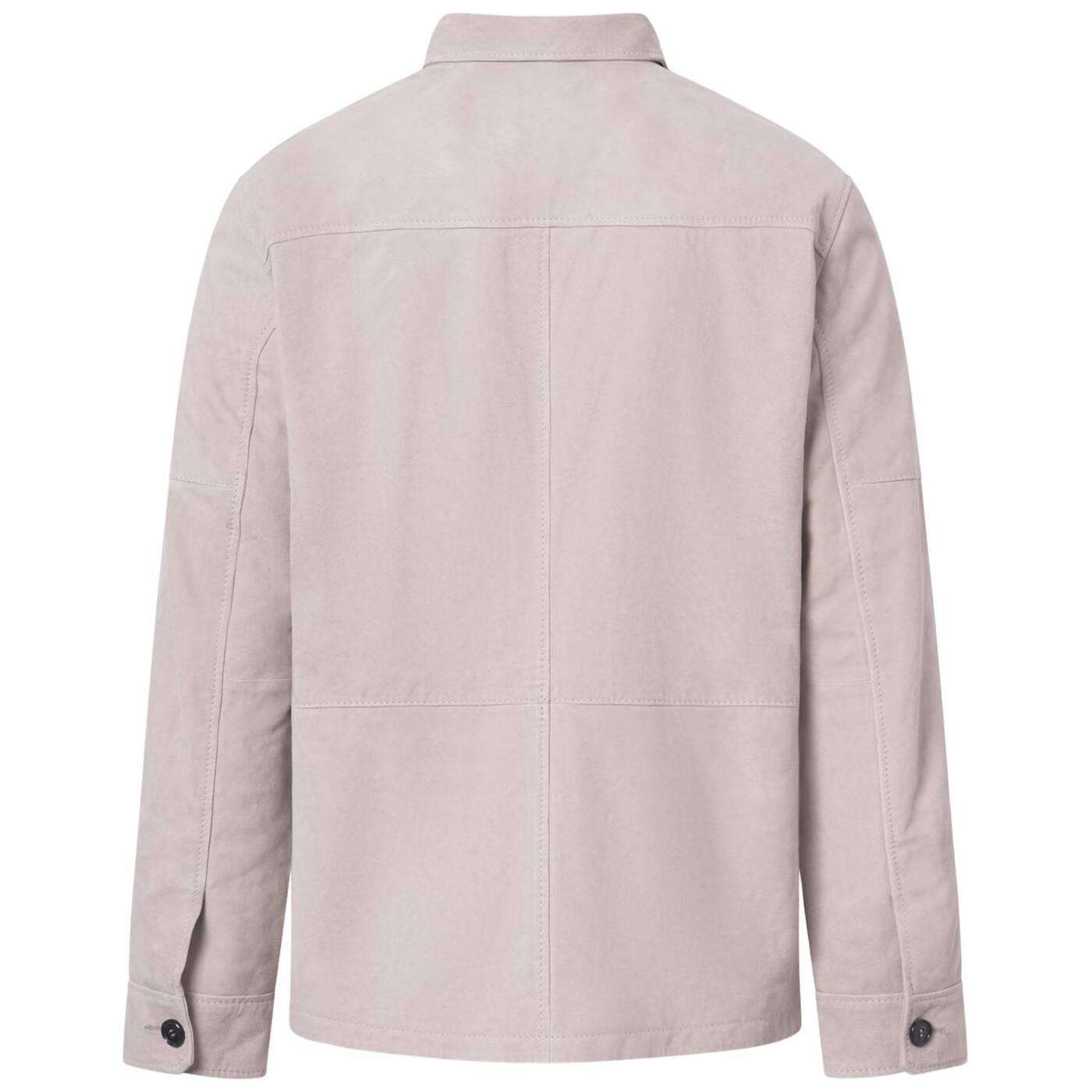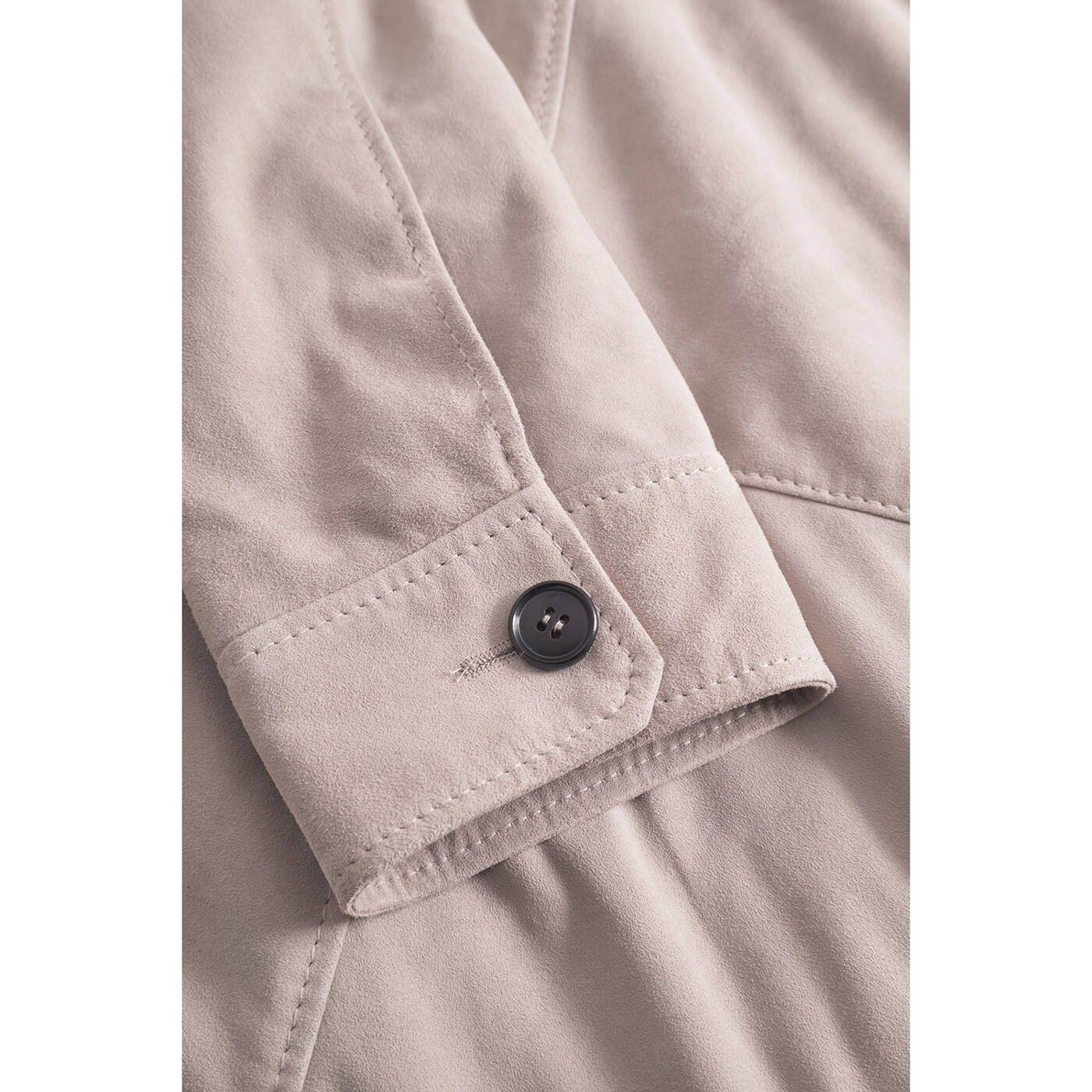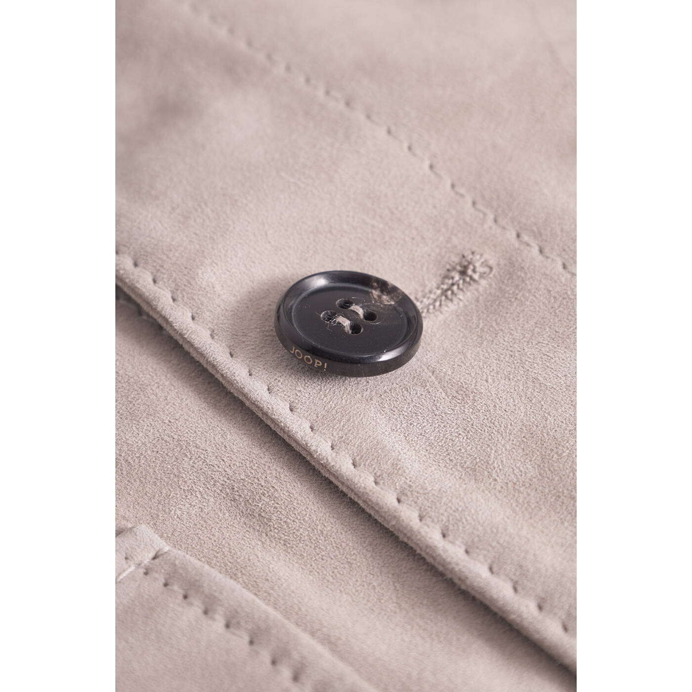 Die Jacke ist aus Ziegenleder, hat einen rechteckigen Kragen und eine durchgeknöpfte Reihe von Knöpfen am Vorderteil. Auf der Brust befinden sich auf beiden Seiten große Taschen.