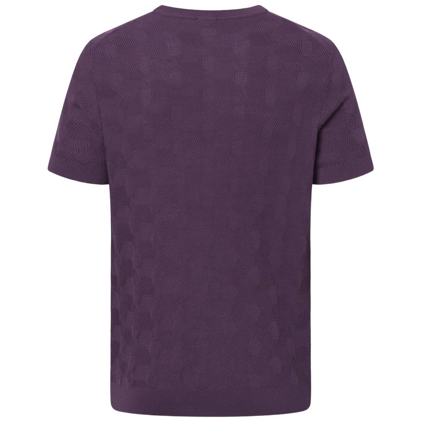 Das T-Shirt hat einen runden Halsausschnitt und eine gleichmäßige, texturierte Oberfläche mit einem feinen Muster.Die Ärmel sind kurze Rippärmel.