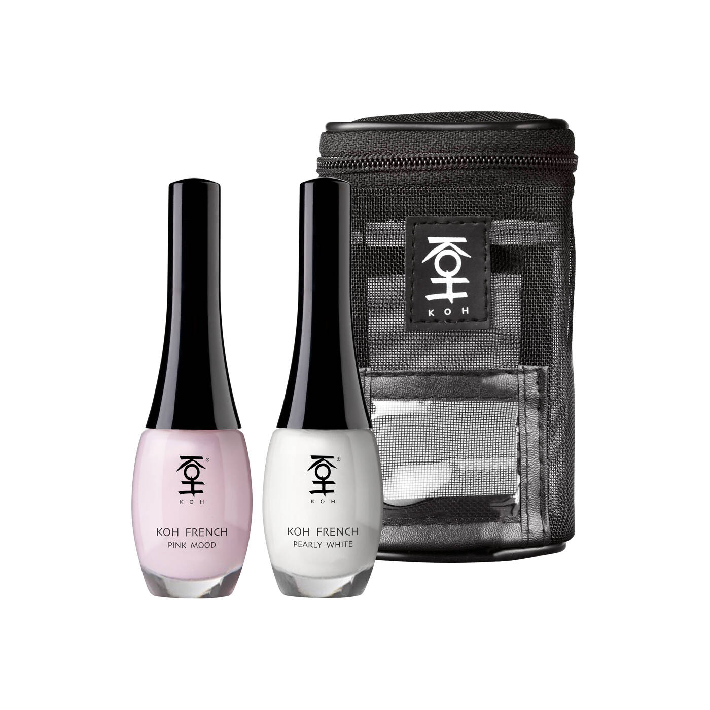 Tragen Sie einen der drei KOH-Basislacke auf. Dann erst den Nagelrand weiß lackieren und dann den farbigen Lack über den gesamten Nagel streichen. Schließlich einer der KOH-Decklacke für zusätzlichen Schutz.