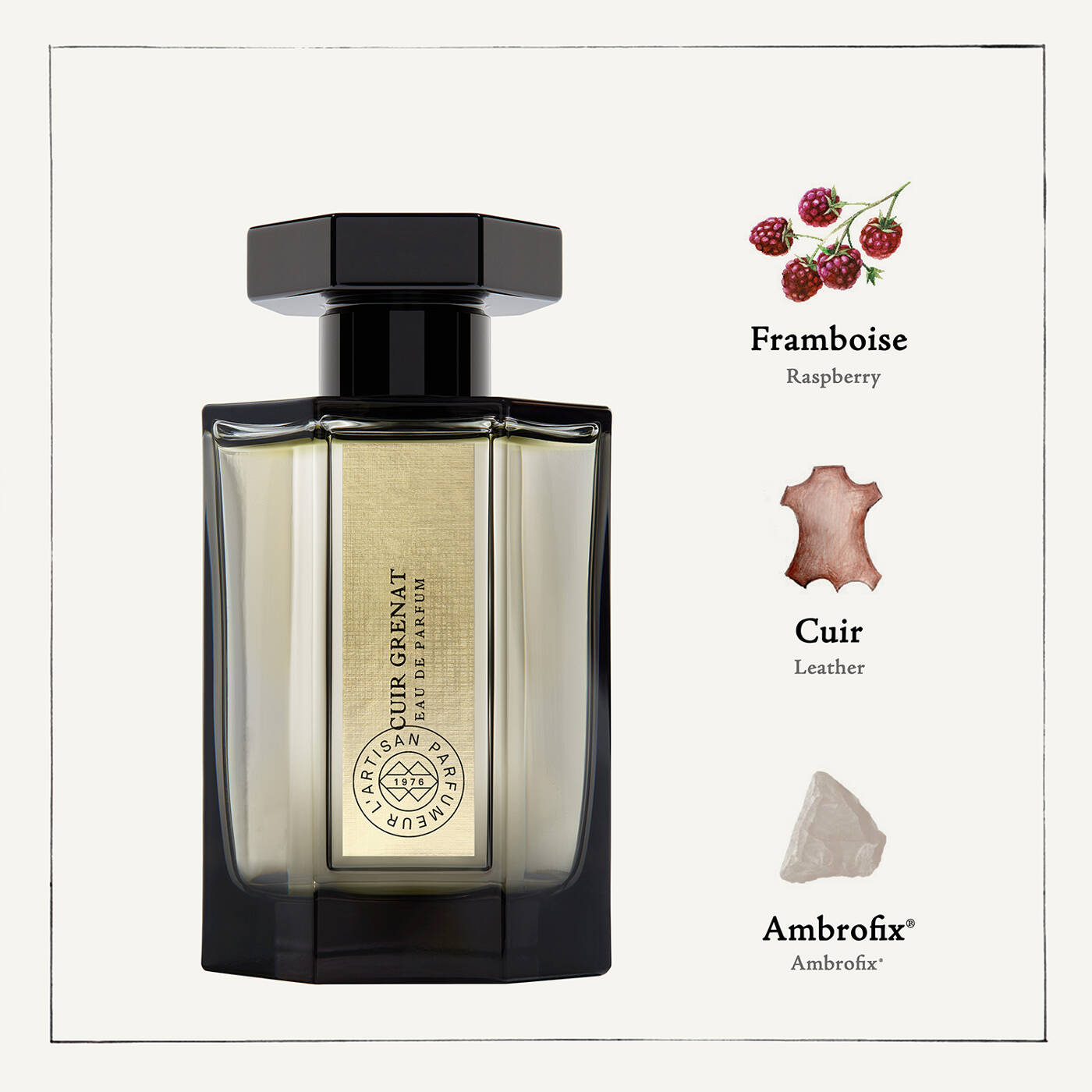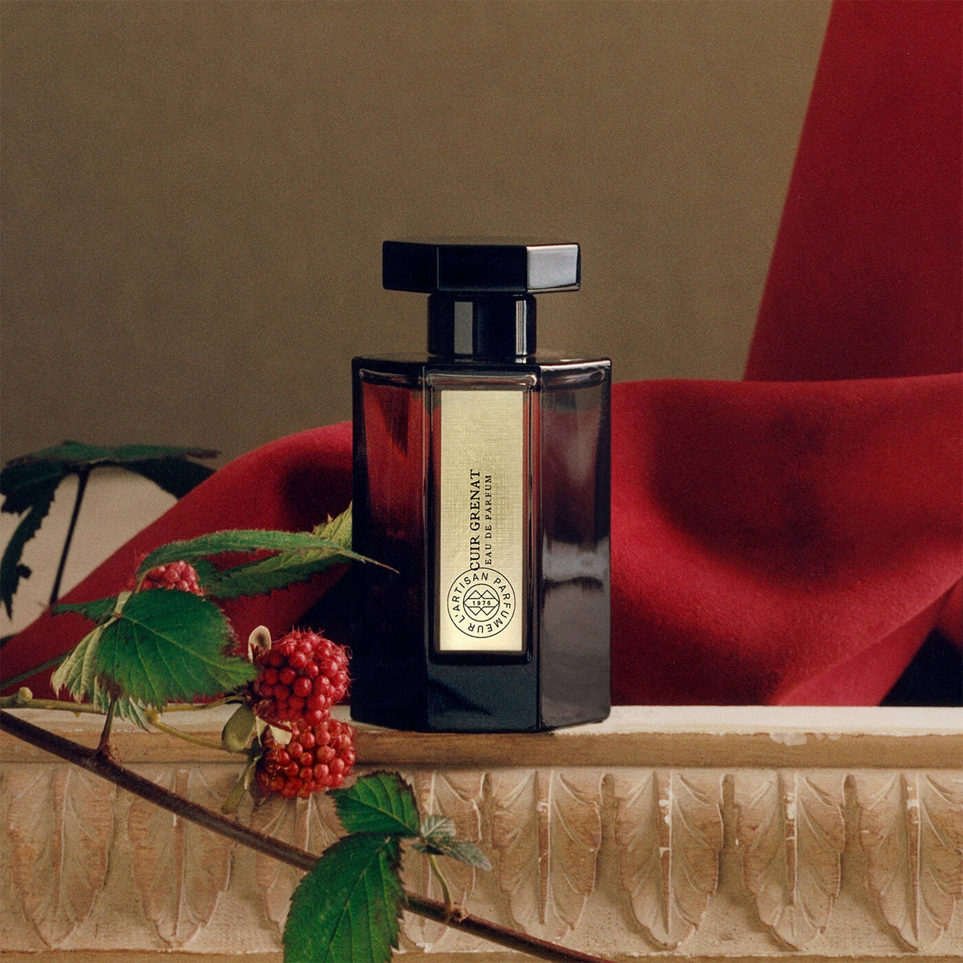 Als Christophe Raynaud Marokko erkundete, stieß er auf die Werkstatt eines Lederverarbeiters. Der aromatische Duft von echtem Leder lag in der Luft, als er die sorgfältige Arbeit des Handwerkers an dem leuchtend roten Leder beobachtete. Der schummrige Raum stand in starkem Kontrast zu dem hellen Licht draußen. Wie von Sinnen wusste er, dass er einen Duft kreieren musste, der das Zusammenspiel von Licht und Schatten mit einem Duo aus Leder und Himbeere erforscht. Mit Cuir Grenat wollte der Parfümeur einen Duft kreieren, der das Gefühl der Berührung vermittelt. So kann man Himbeere und Leder nicht nur riechen, sondern auch sehen; sie sind beides, Aromen und Düfte, die unerwartete Gegensätze und Gemeinsamkeiten aufweisen.