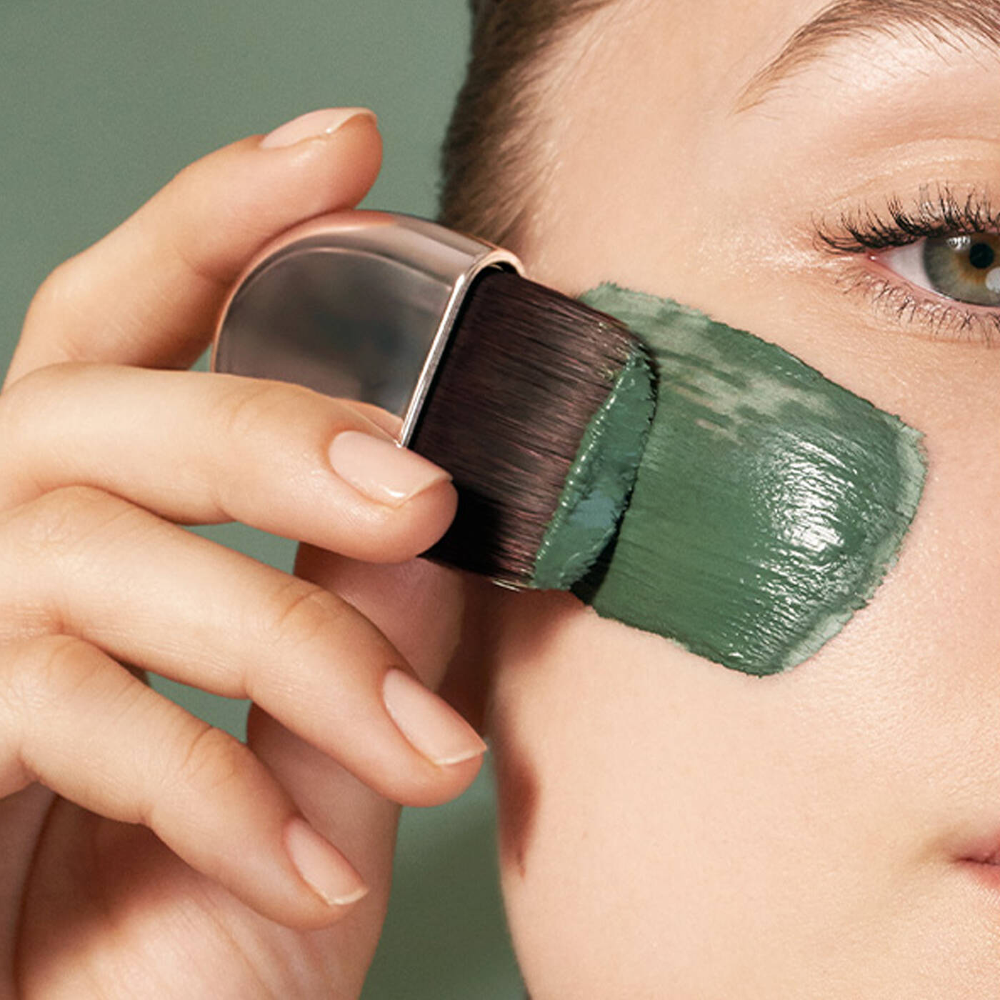 - 10 Minuten lang trocknen lassen, bis die Farbe der Maske von einem tiefen Seetanggrün zu einem helleren Farbton übergeht, und nehmen Sie sie dann mit dem beiliegenden, von Meeressteinen inspirierten Schwamm ab.