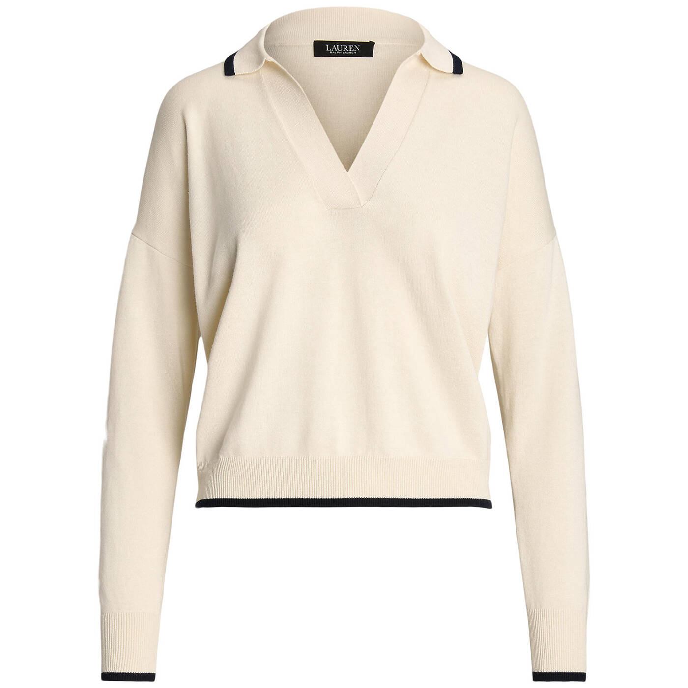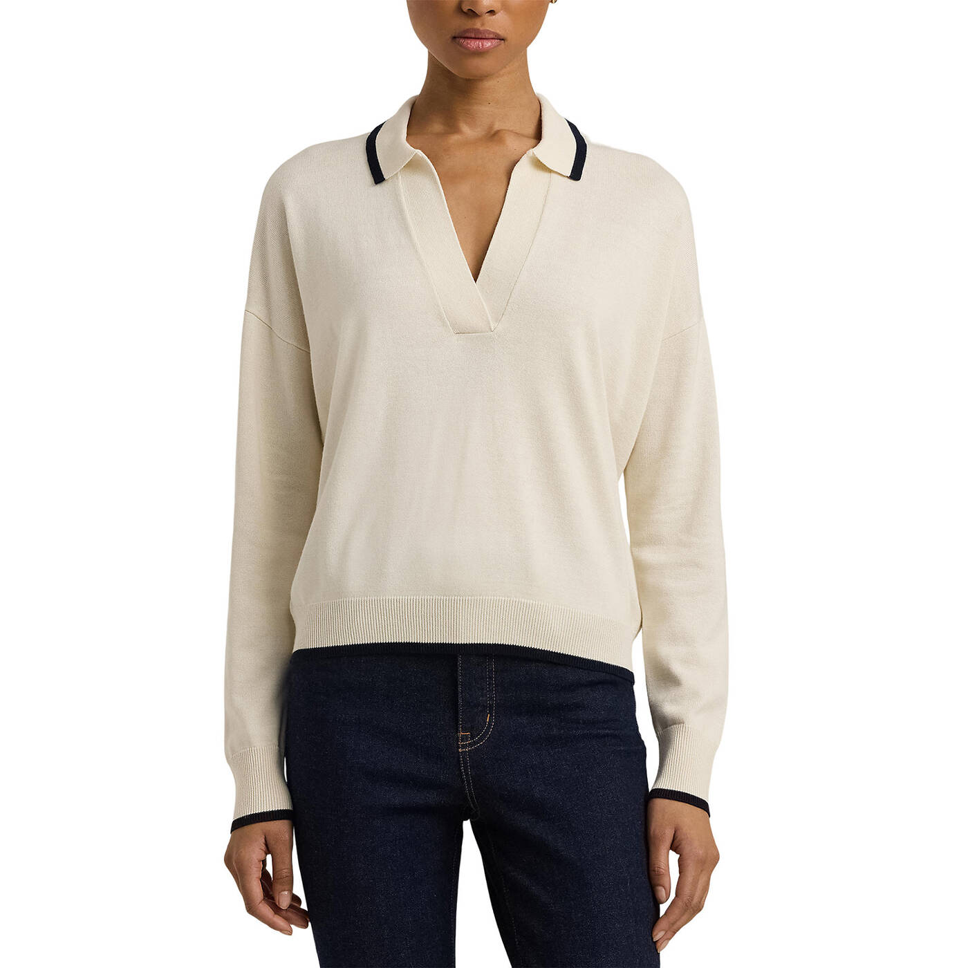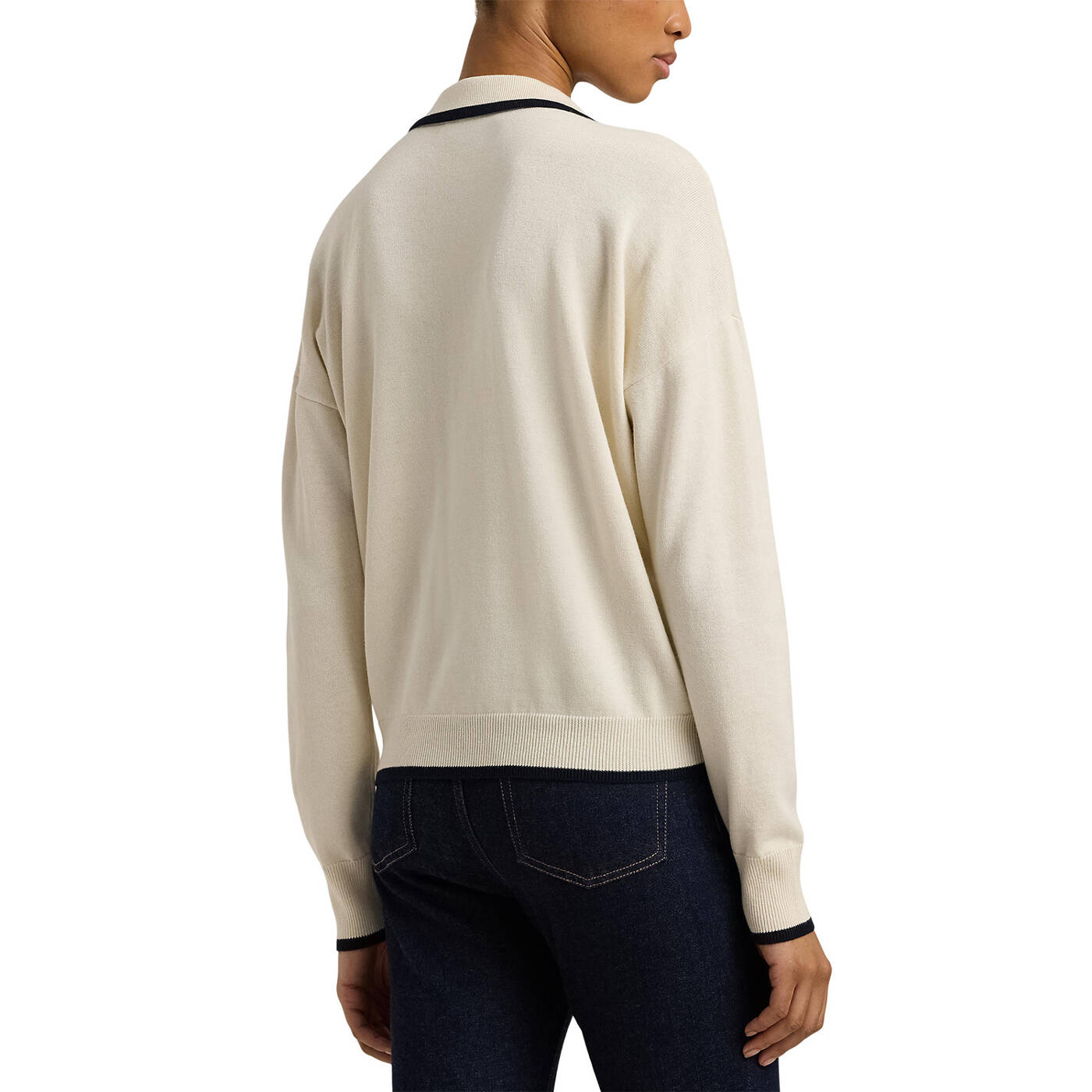 - Offener Polokragen mit farblich abgesetztem Saum