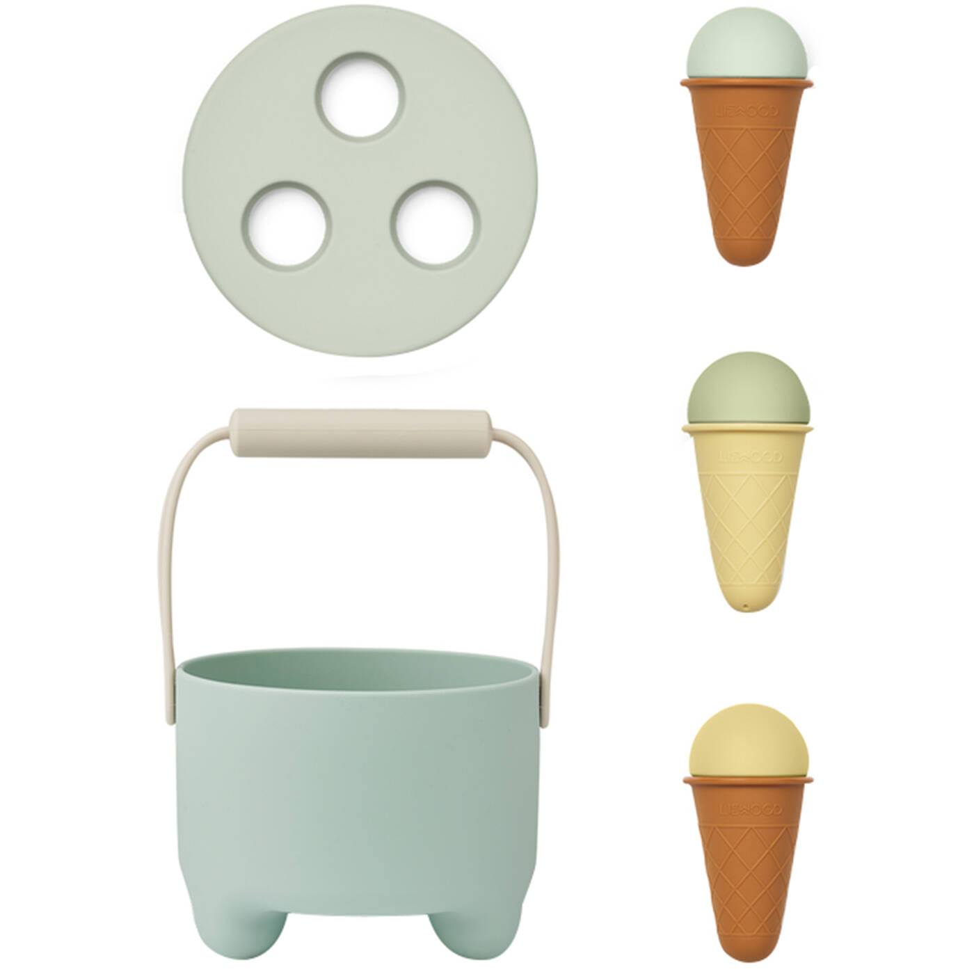 - Das Spielset enthält einen Eimer, einen Eiscreme-Halter und drei Eiscremes, die sich auseinander und zusammensetzen lassen