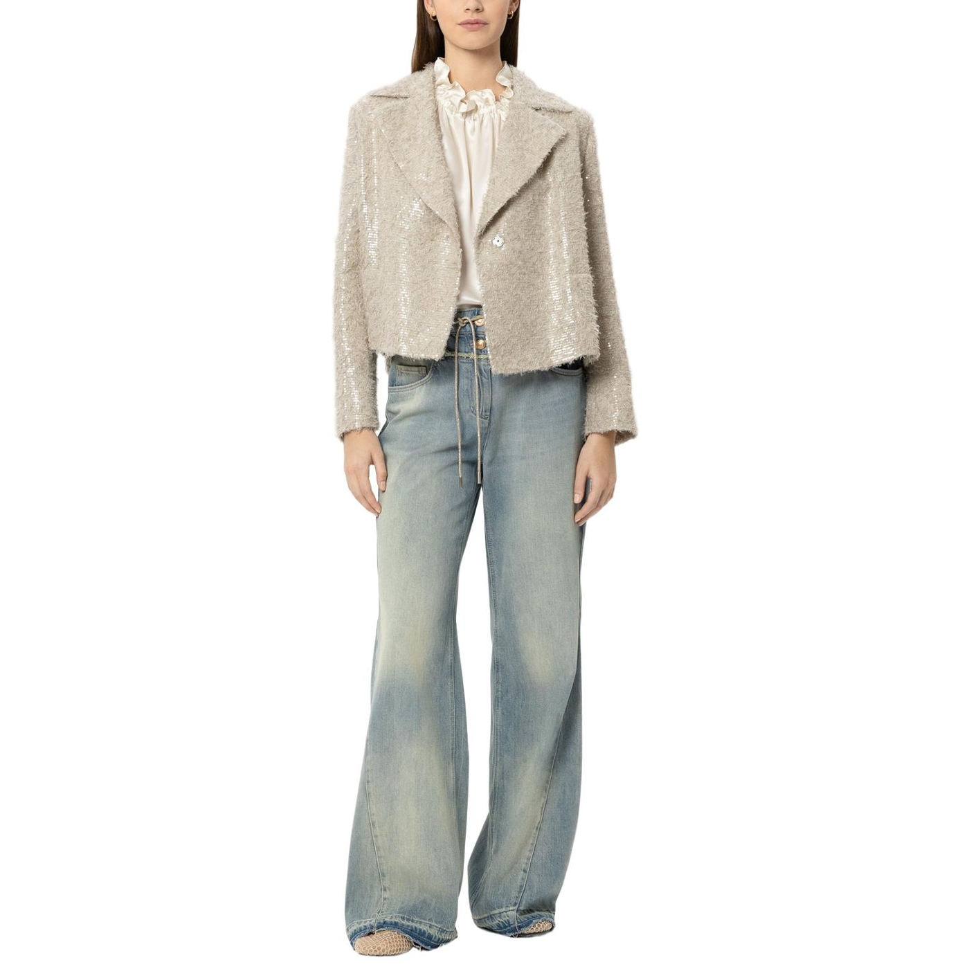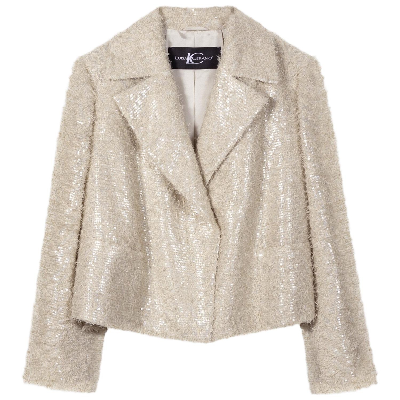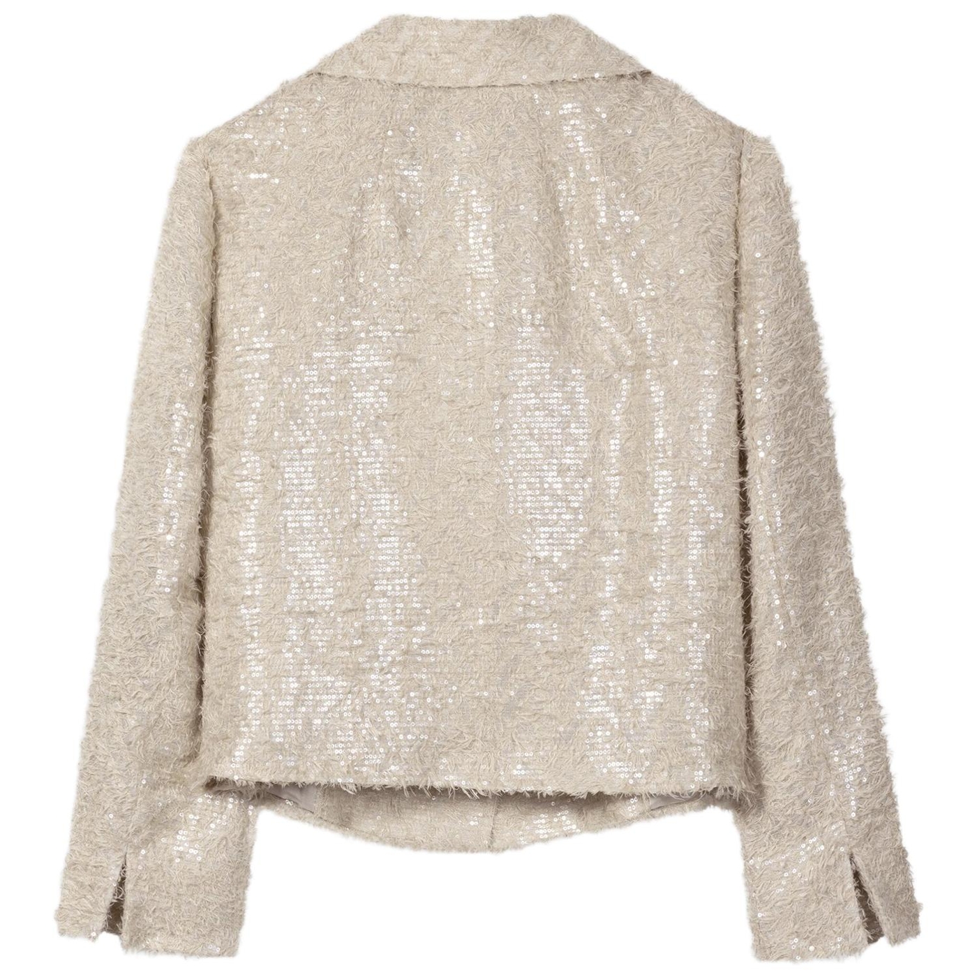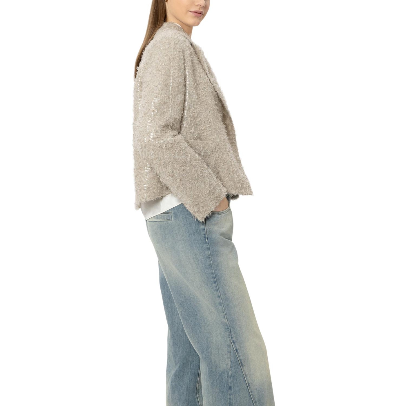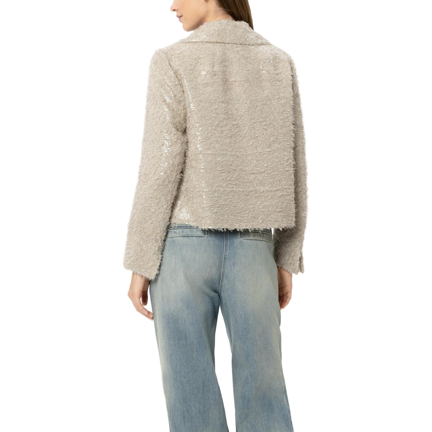 Kurze cabanjacke aus edlem fil coupé mit glänzenden pailletten in tonigem design. die jacke ist kastig geschnitten und verfügt über einen großen reverskragen sowie aufgesetzte eingrifftaschen.