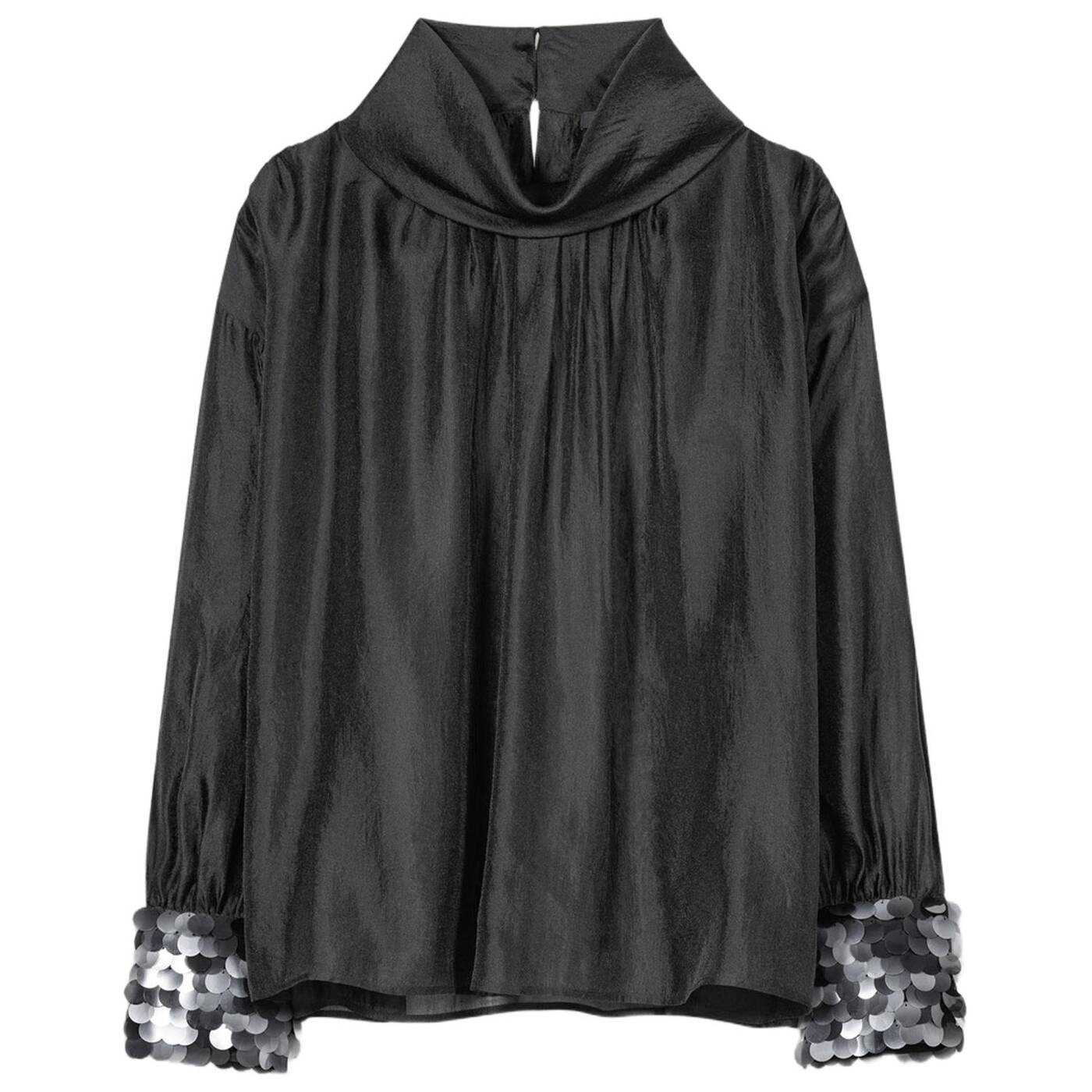 • Weiter Rollkragen mit Knöpfen auf der Rückseite