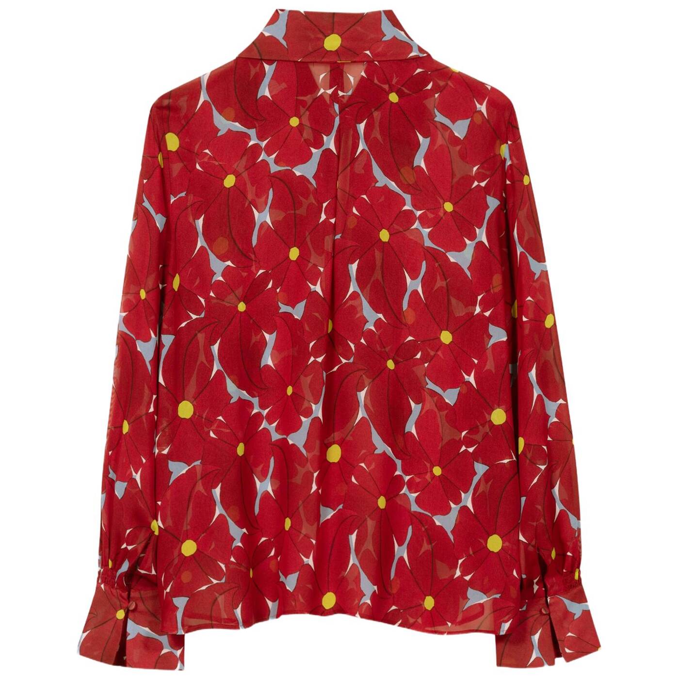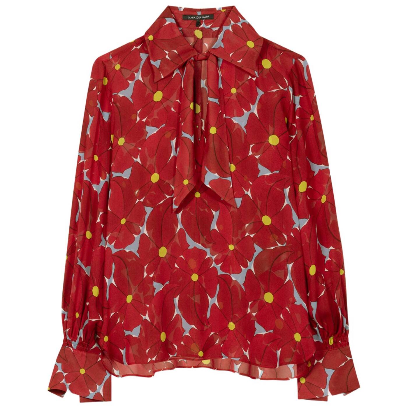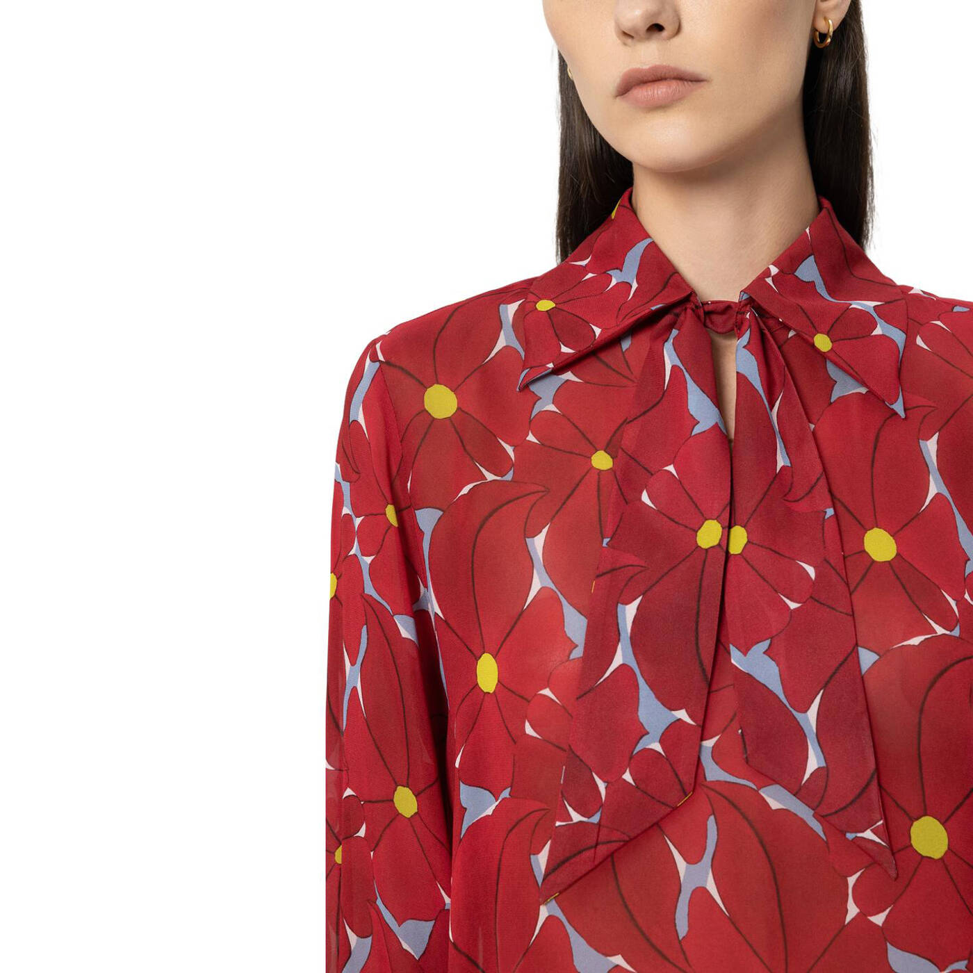 Bluse mit exklusivem flower-print aus leichter, semitransparenter viskose. den ausschnitt ziert ein hemdkragen und eine variable schluppe zum binden. an den ärmeln befinden sich gesmokte details und stoffüberzogene knöpfe.