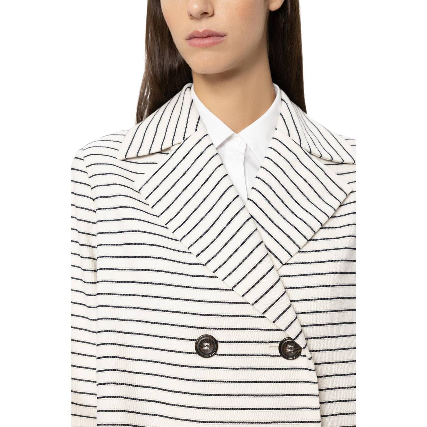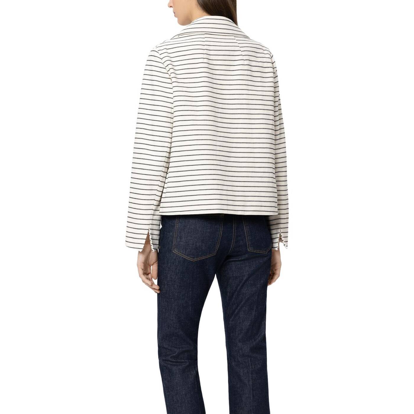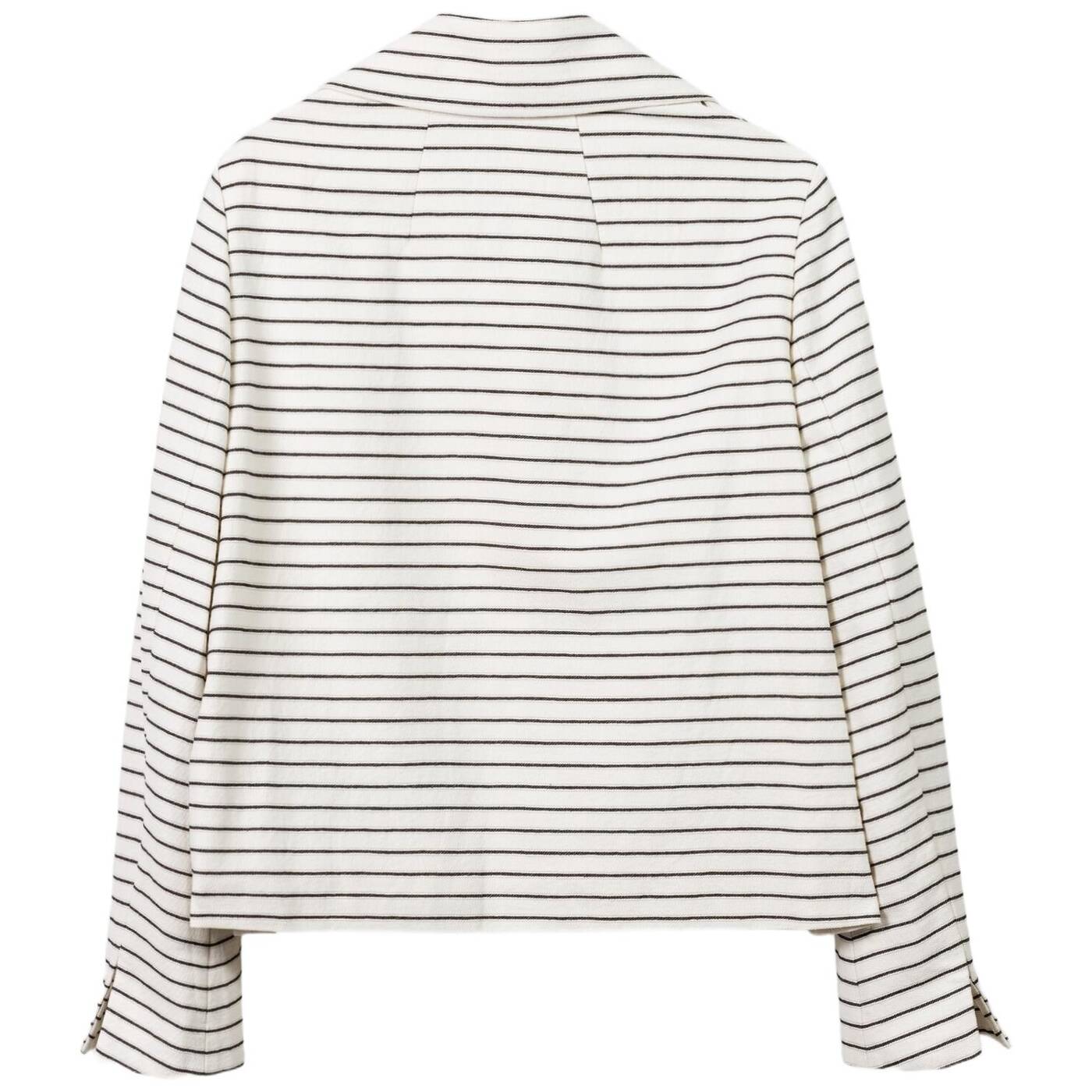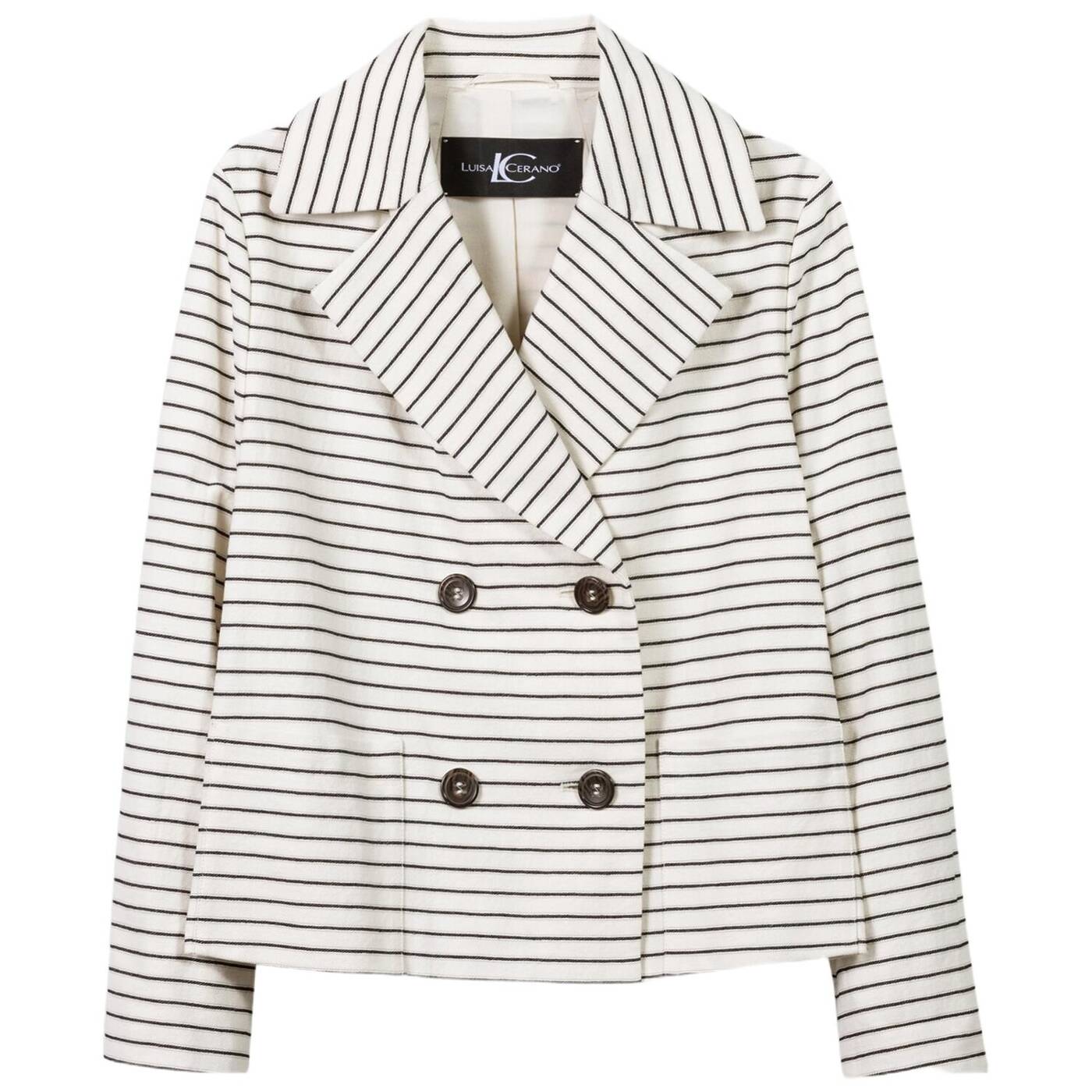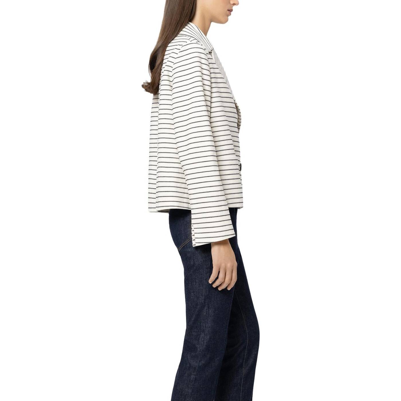 Verkürzte, doppelreihige cabanjacke mit streifen-dessin und breitem reverskragen. die jacke ist komplett gefüttert und besitzt zwei aufgesetzte taschen. die ärmelabschlüsse sind seitlich geschlitzt und lassen sich dadurch leicht umschlagen.