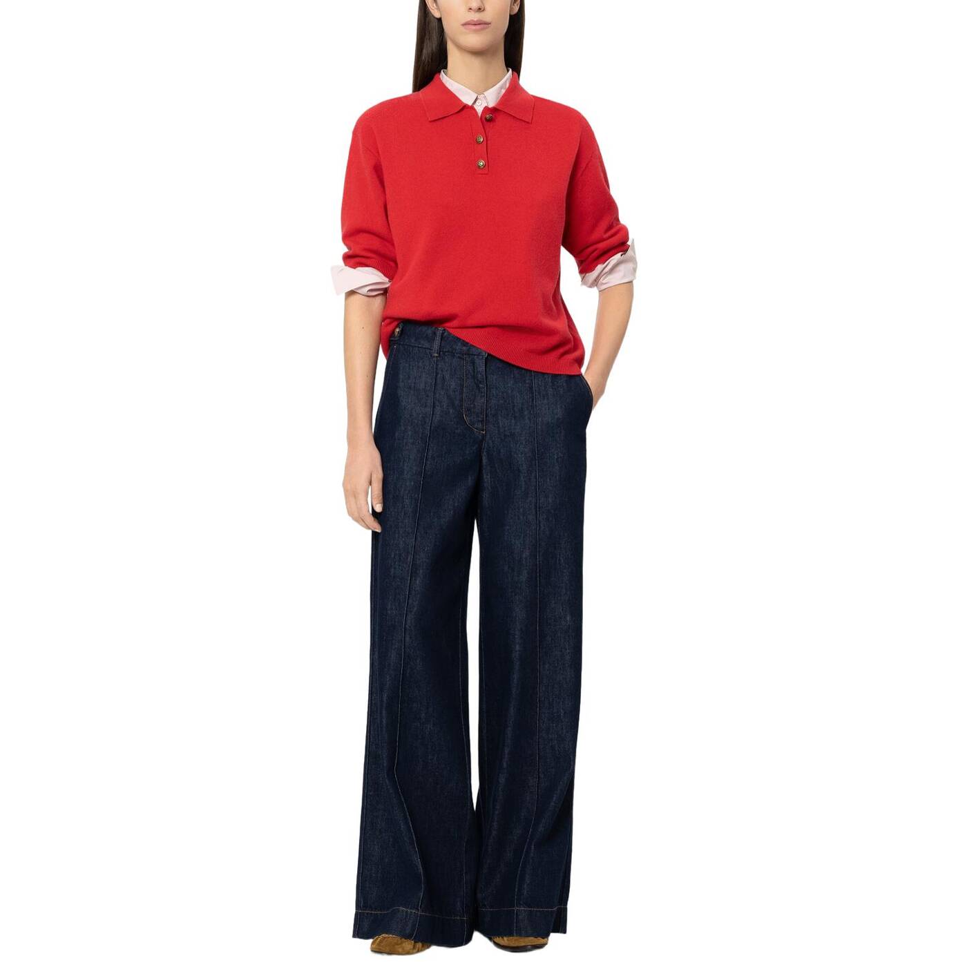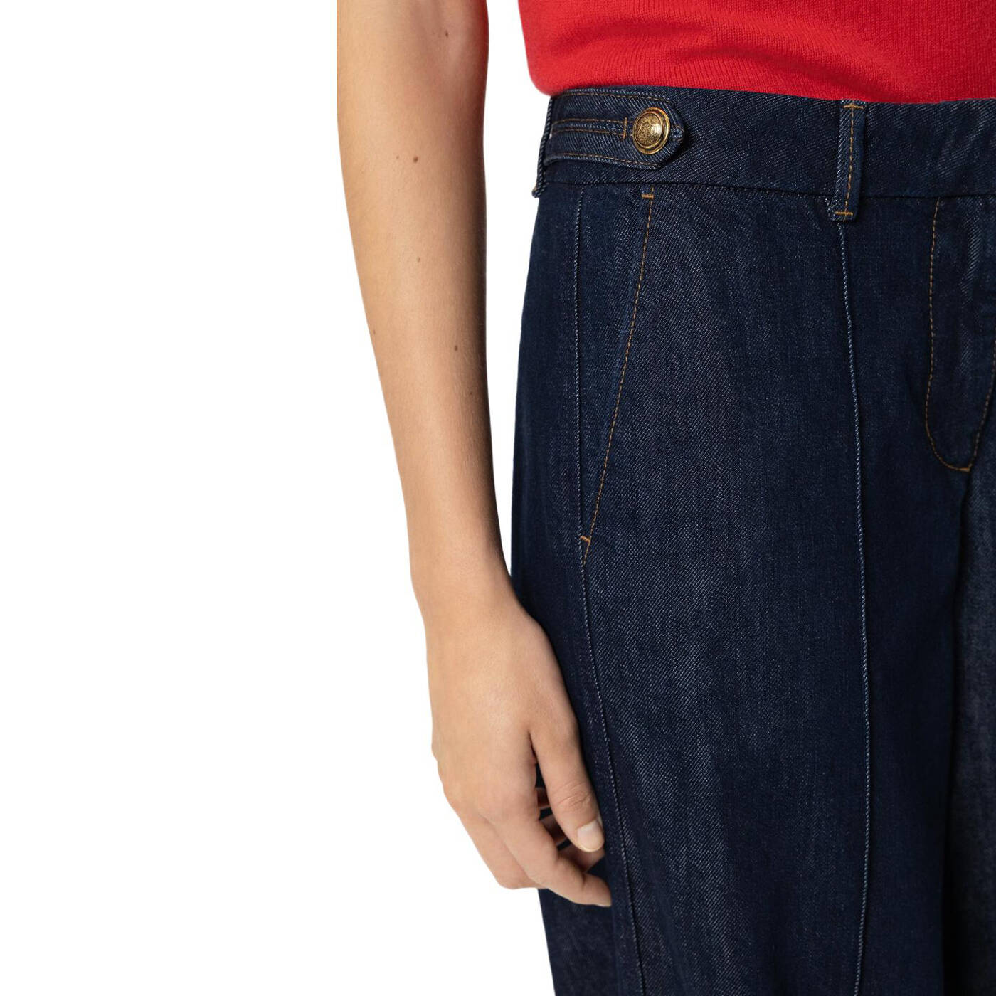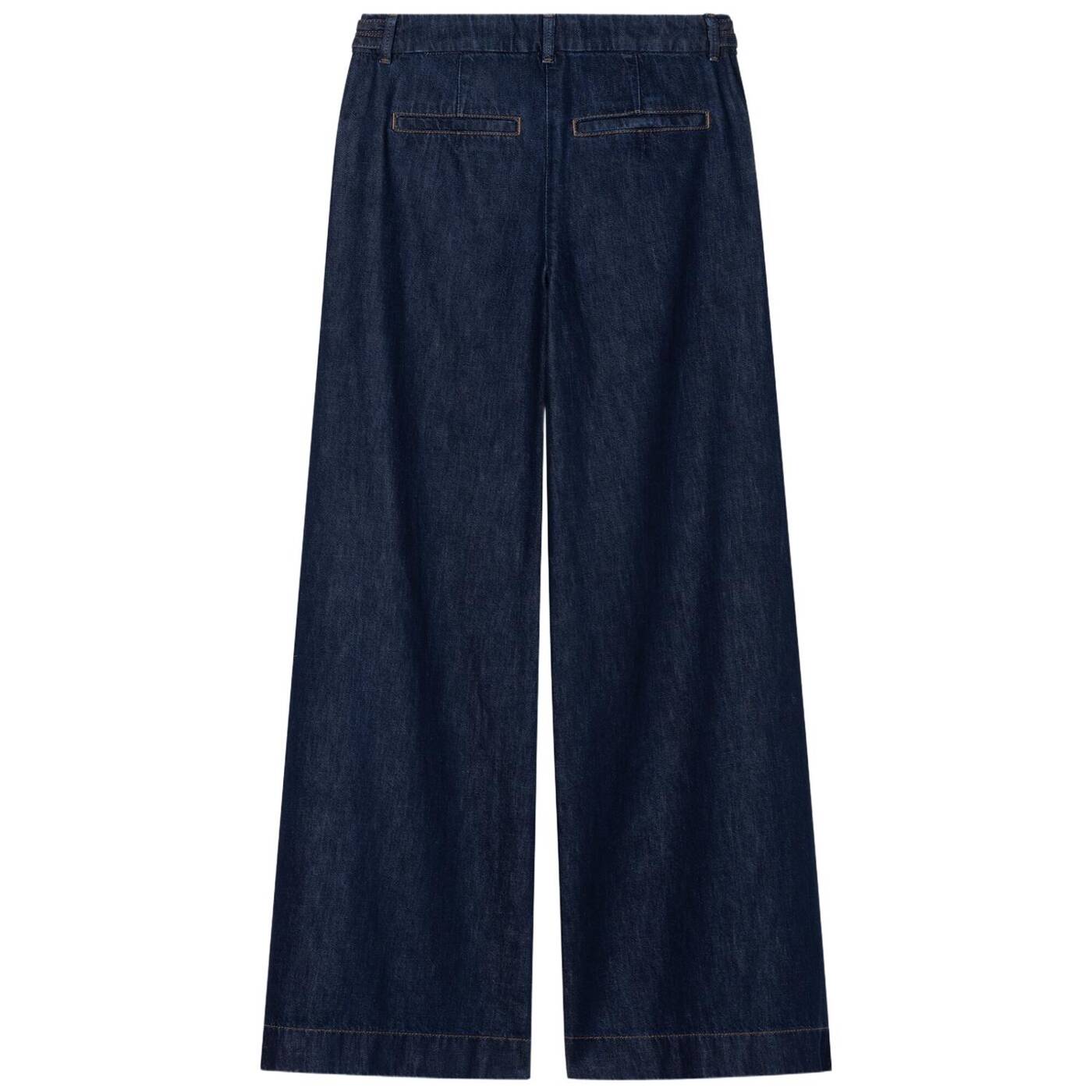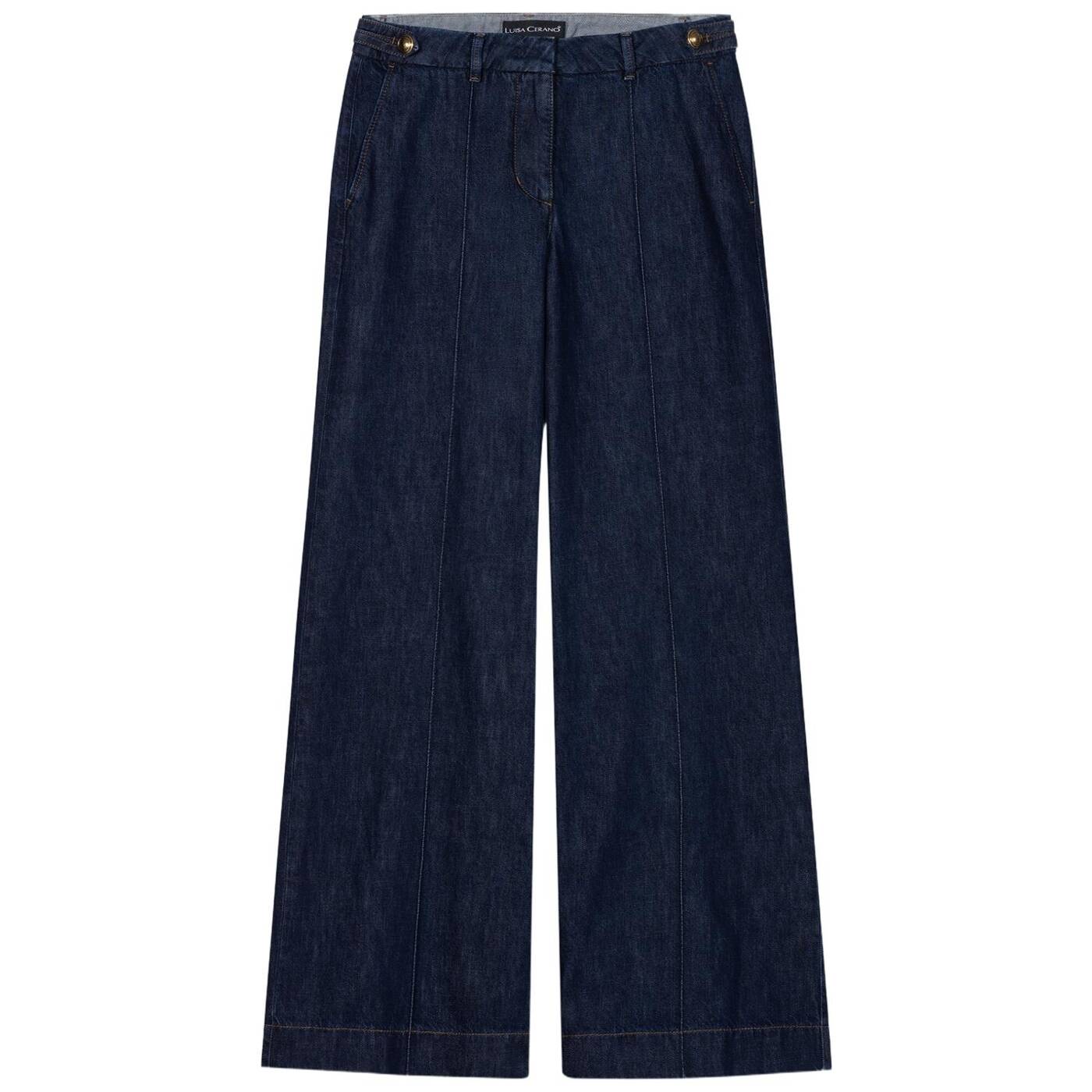 Leichte wideleg-jeans in authentischer denim-qualität mit weichem griff. seitliche knopfriegel mit schmuckknöpfen, zwei rückseitige chino-taschen und biesen auf der vorderseite prägen das design.
