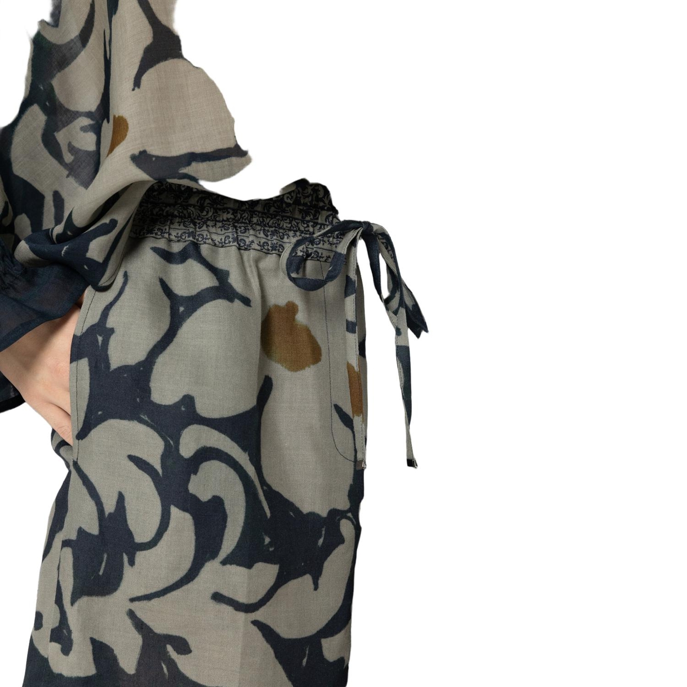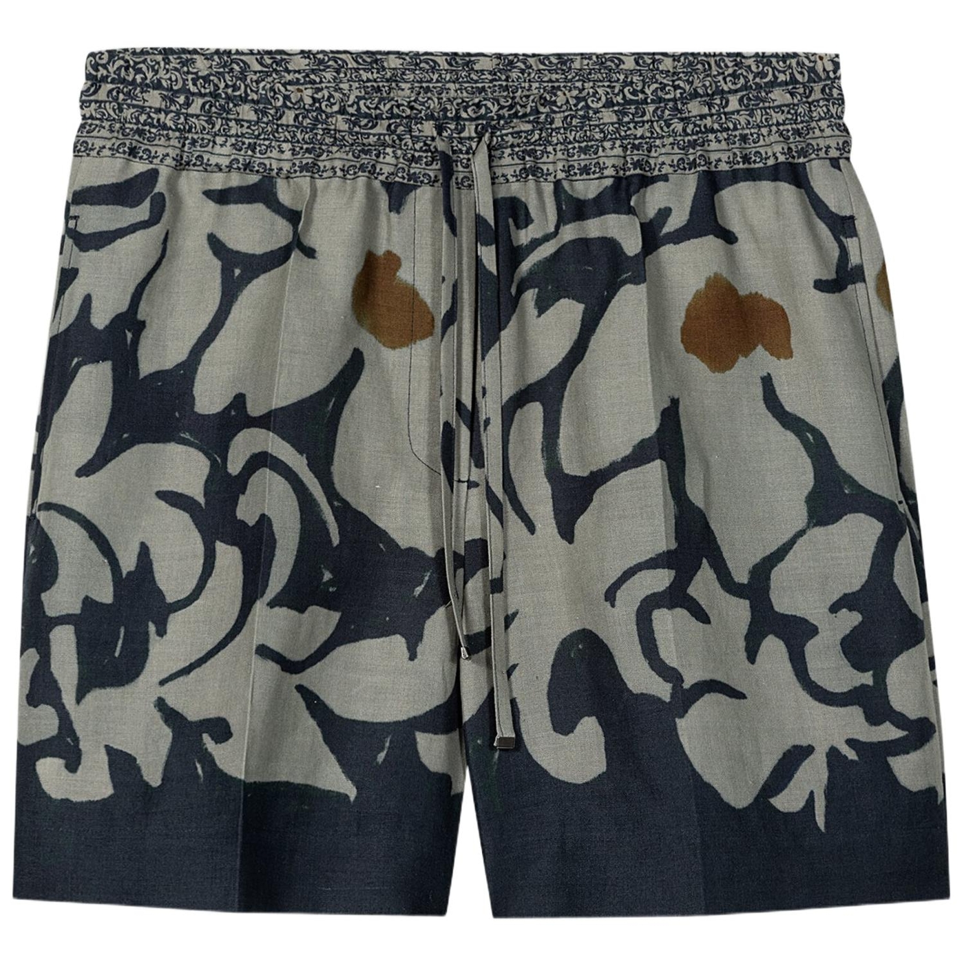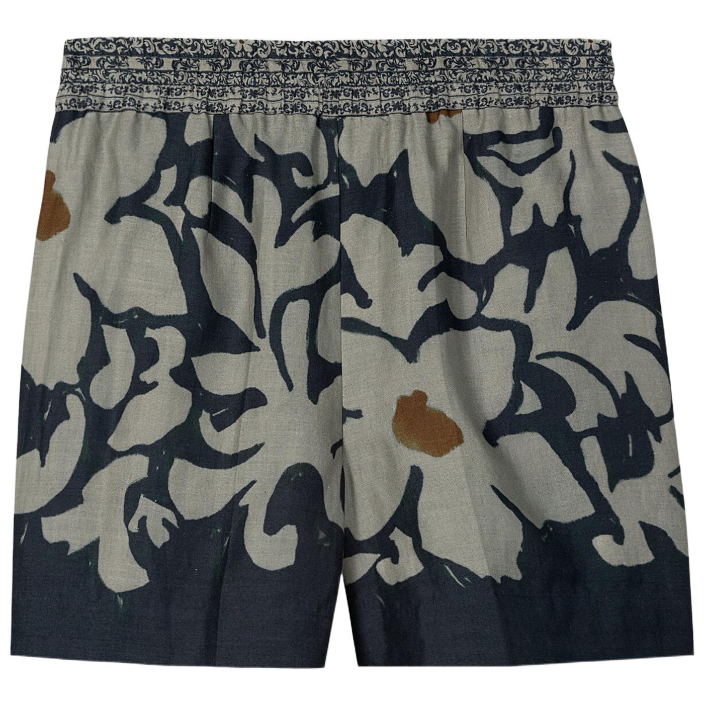 Weite shorts aus ramie-gewebe mit exklusivem, ornamentalem blumendessin und zwei taschen. der bund kann mit einem kordelzug in der weite reguliert werden.