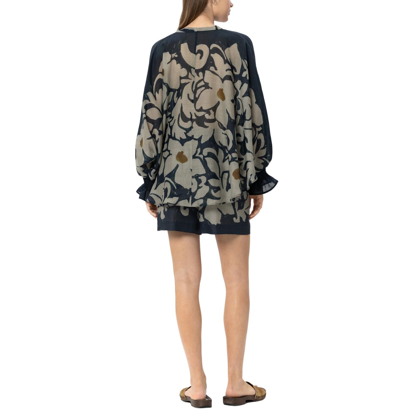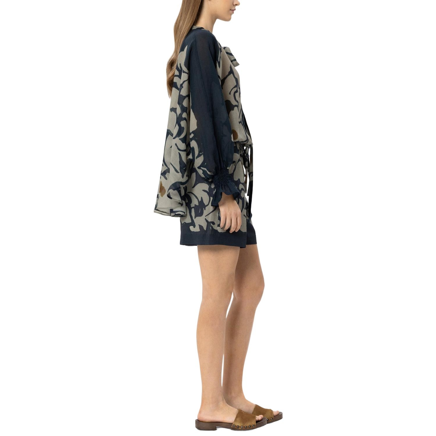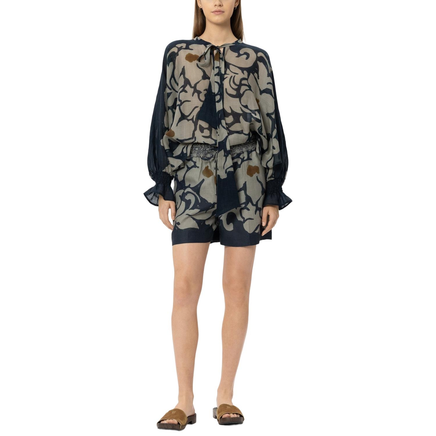 Weite shorts aus ramie-gewebe mit exklusivem, ornamentalem blumendessin und zwei taschen. der bund kann mit einem kordelzug in der weite reguliert werden.