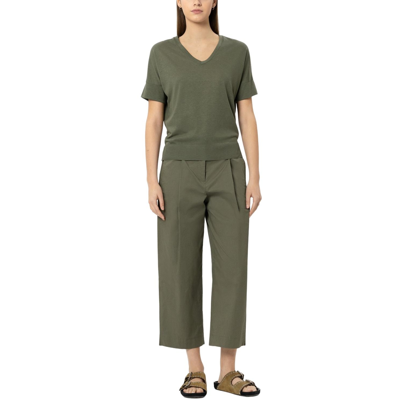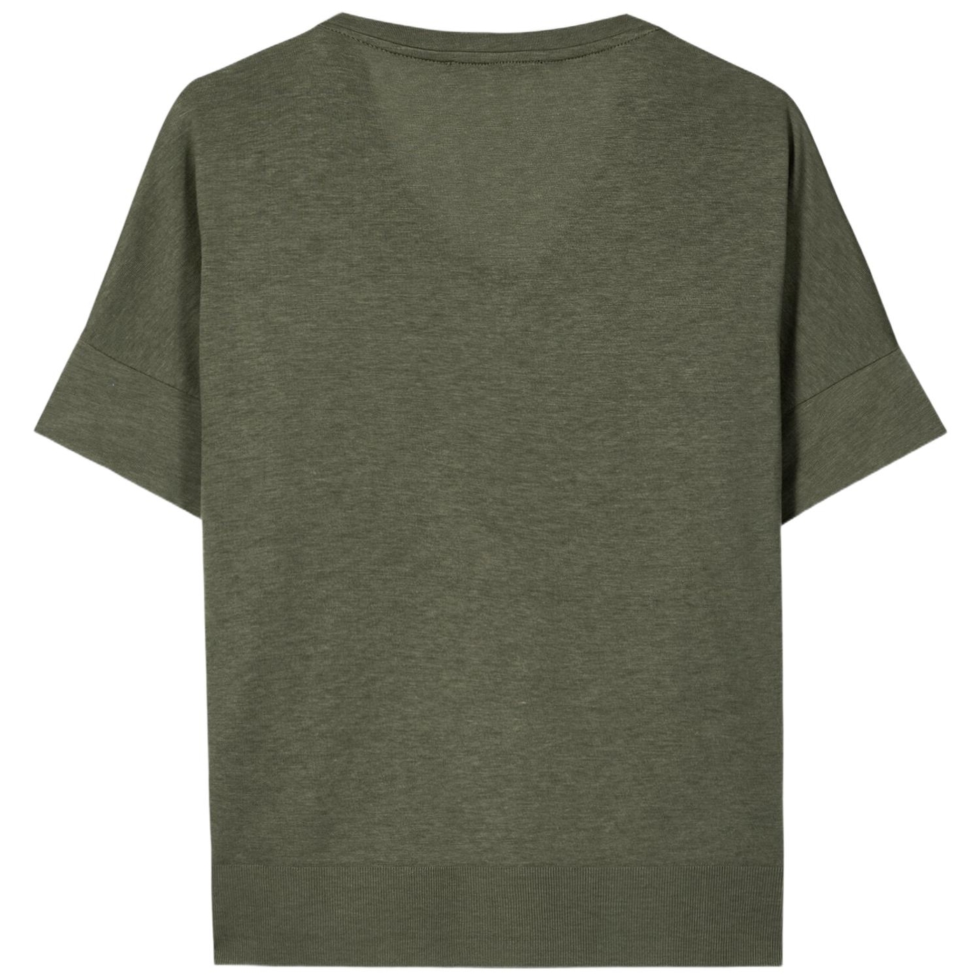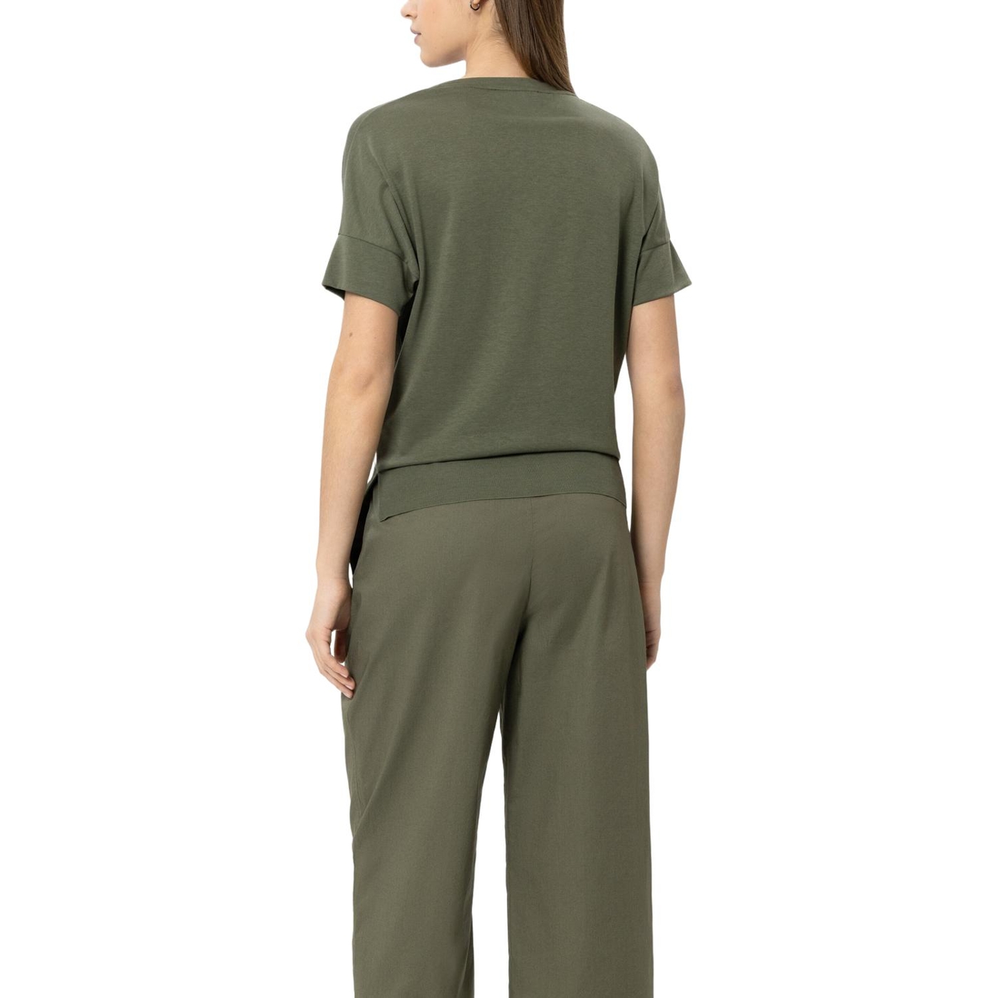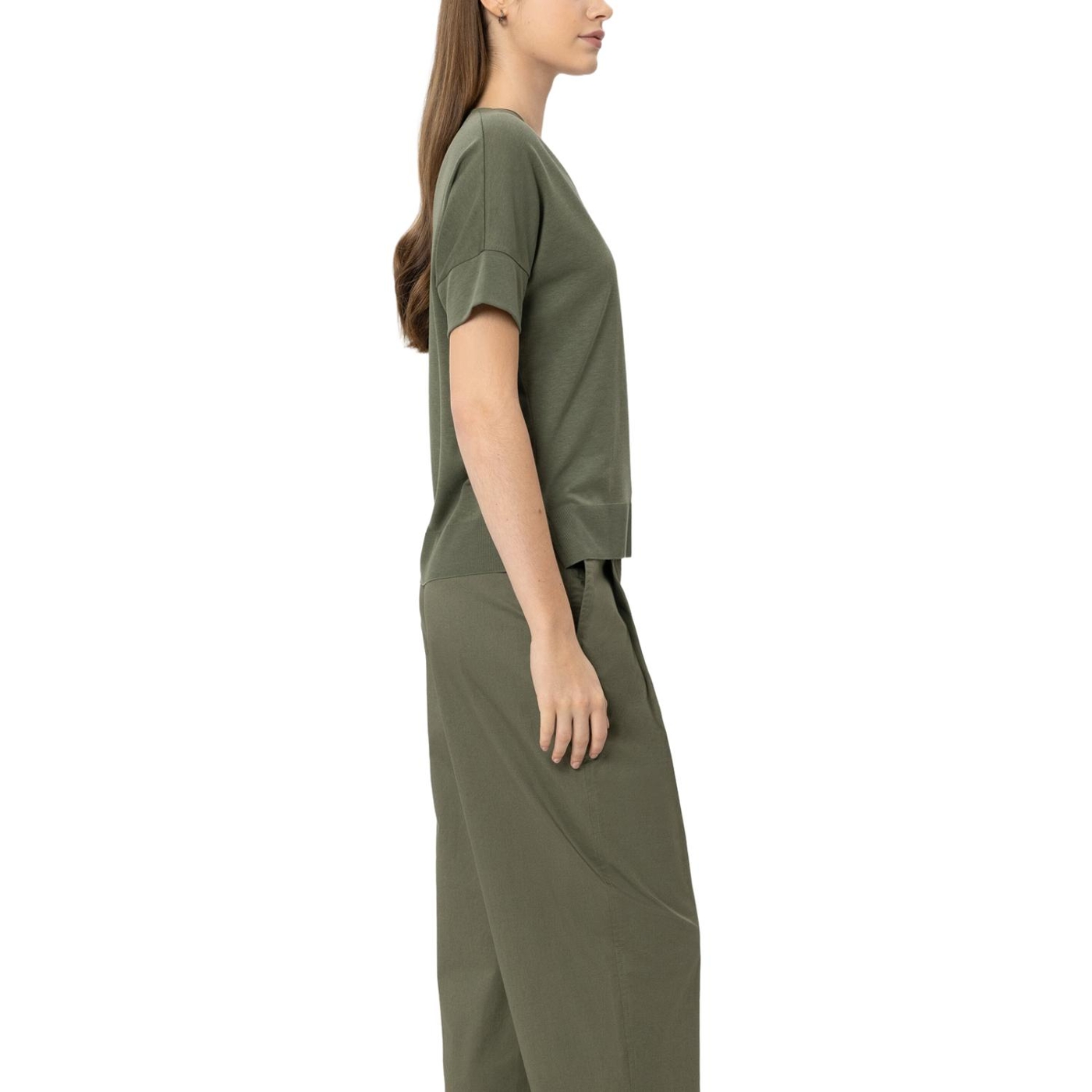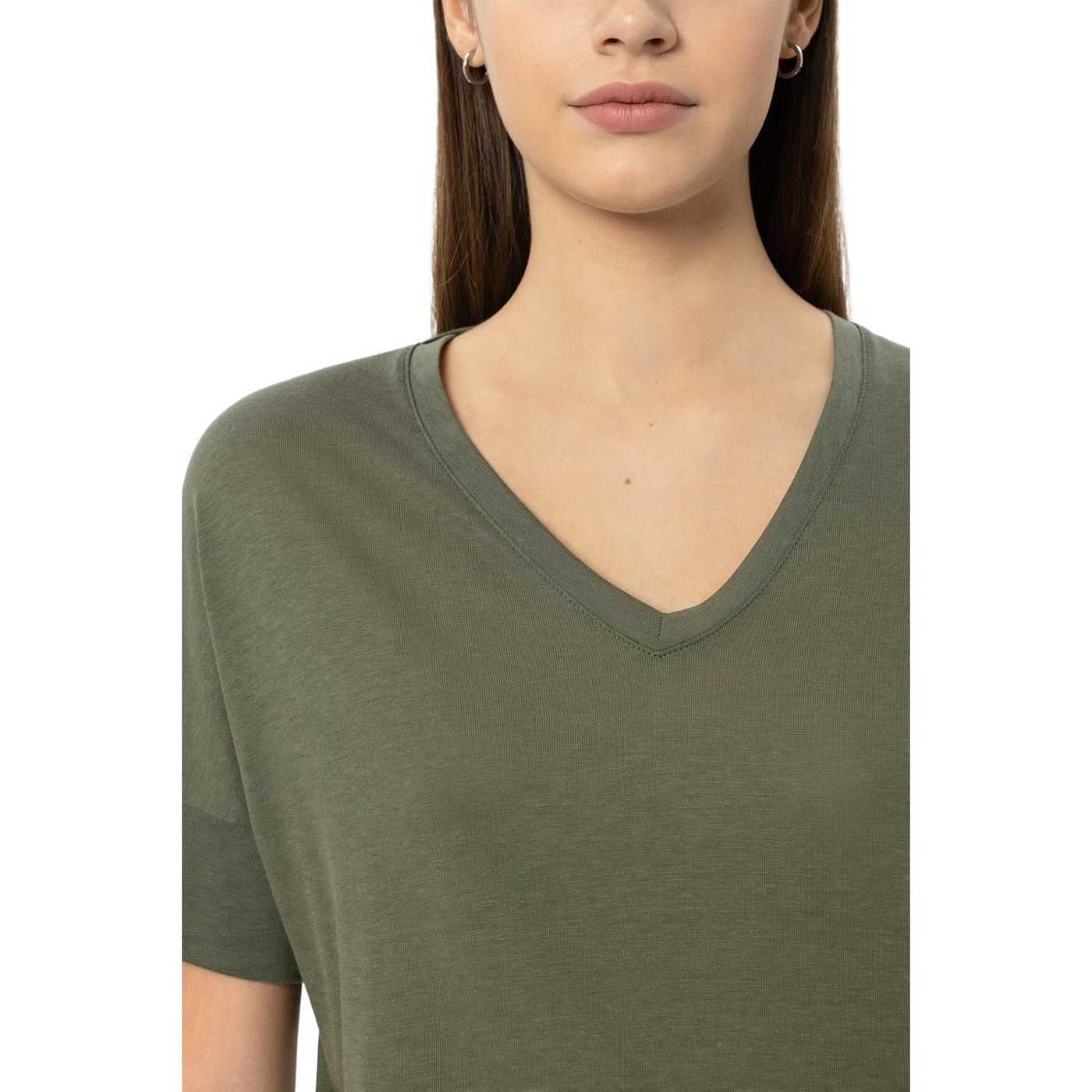 T-shirt aus hochwertiger baumwoll-mischung mit v-ausschnitt und überschnittener schulter. der saum zeigt eine gerippte kante und ist seitlich geschlitzt.