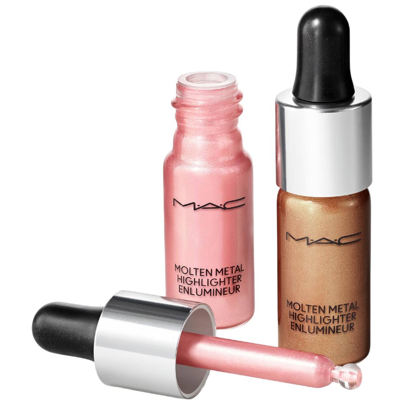 Für die Freundin, die es liebt, sich zu schmücken... Dieses Set in limitierter Auflage enthält zwei brandneue Farbtöne des Molten Metal Highlighter in schimmerndem Rosa und Bronzegold. Diese flüssigen Tropfen mit chromfarbenen Perlglanzpartikeln können allein für einen strahlenden, spiegelartigen Glanz aufgetragen oder mit Foundation oder Feuchtigkeitscreme gemischt werden, um ein schillerndes Finish zu erzielen. Bereit zum Verschenken in einer exklusiven Weihnachtsverpackung zu einem M·A·Cnificent-Preis.