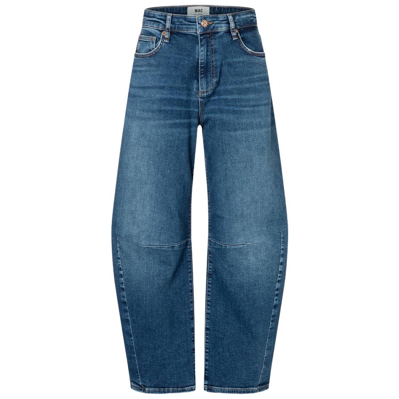 Barrel fit, barrel leg, relaxtes bein im o-shape, hohe leibhöhe, five pocket, bequemer, lockerer sitz an hüfte und oberschenkel, naht-detail auf kniehöhe, authentic comfort stretch denim, hochwertige, sehr elastische qualität, authentische, strukturierte optik, angenehmer griff, moderner vintage look, hervorragende passform, das model ist 1,75m groß und trägt die mac hosengröße 36, fußweite bei größe 36: 52cm