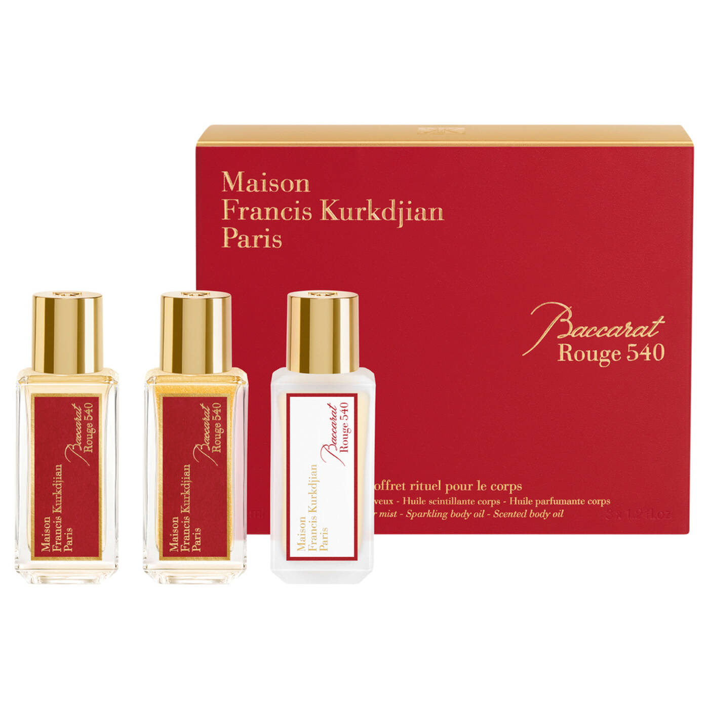 Dieses perfekte Body Ritual Set enthält ein duftendes Body Oil, ein schimmerndes Body Oil und ein Hair Mist. Das Body Oil hinterlässt die Haut seidig-glatt und dezent parfümiert, während das Baccarat Rouge 540 Shimmering Oil 24-karätiges Gold zum Strahlen bringt, inspiriert von den Geheimnissen des Rouge à l'or. Den krönenden Abschluss bildet der duftende Hair Mist, der für eine zarte und leuchtende Sillage sorgt.