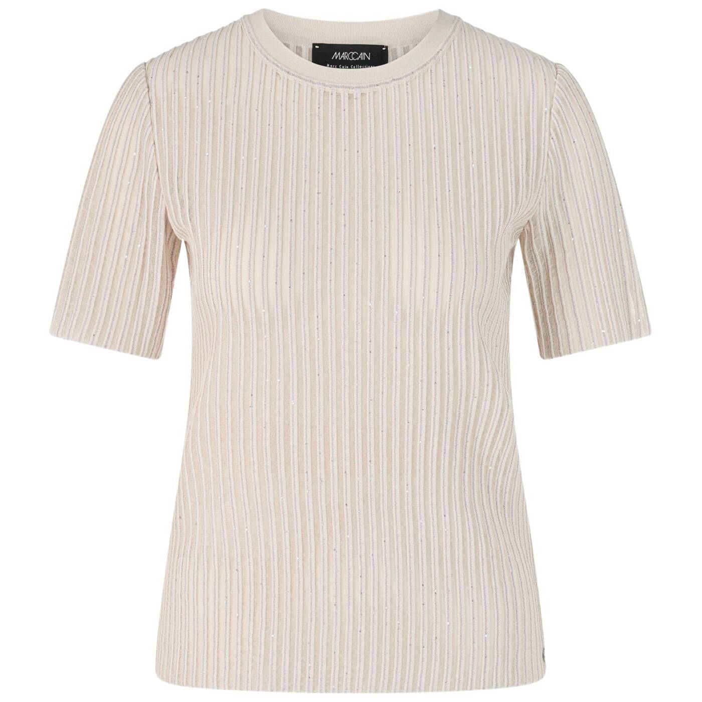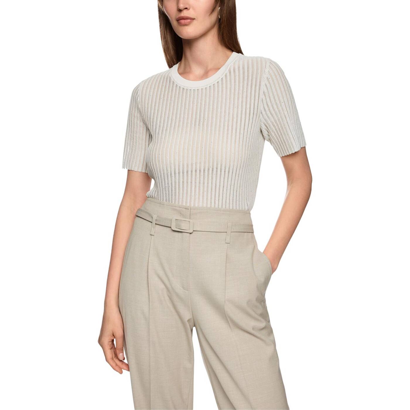 Kurzärmeliger Pullover aus softem Materialmix mit recycelter Viskose sowie Mini-Pailletten. Das feine Strukturmuster und der klassische Rundhalsausschnitt verleihen dem Design eine moderne, cleane Optik. Das Modell wird am Standort Deutschland gestrickt und auch veredelt. Die Weiterverarbeitung der einzelnen Teile erfolgt in europäischen Partnerbetrieben. Damit ist der Pullover „Knitted in Germany“.