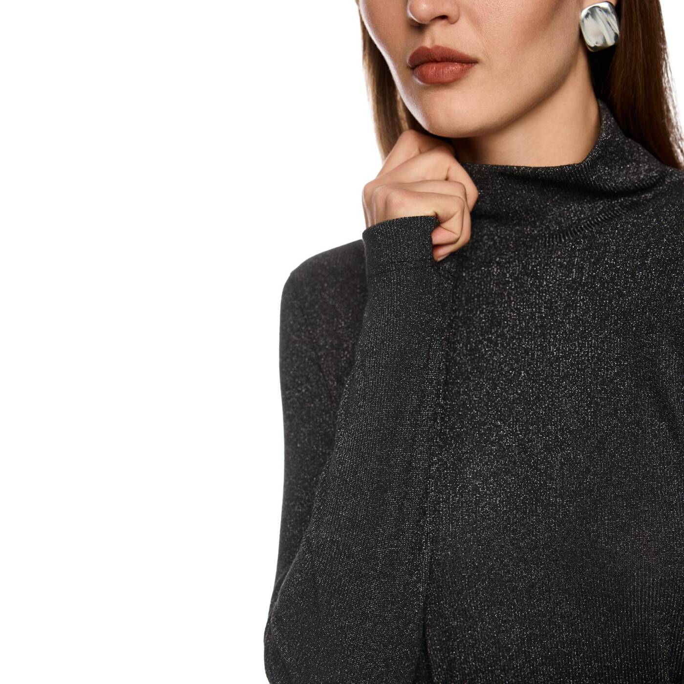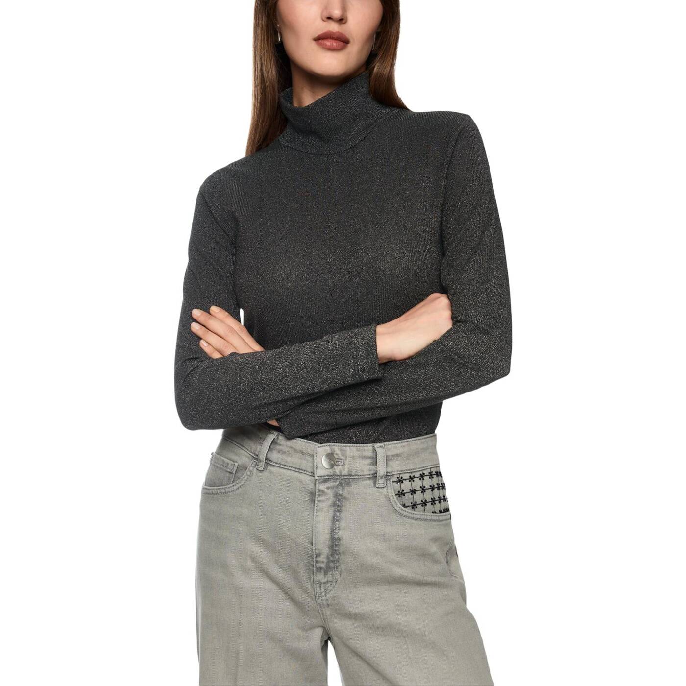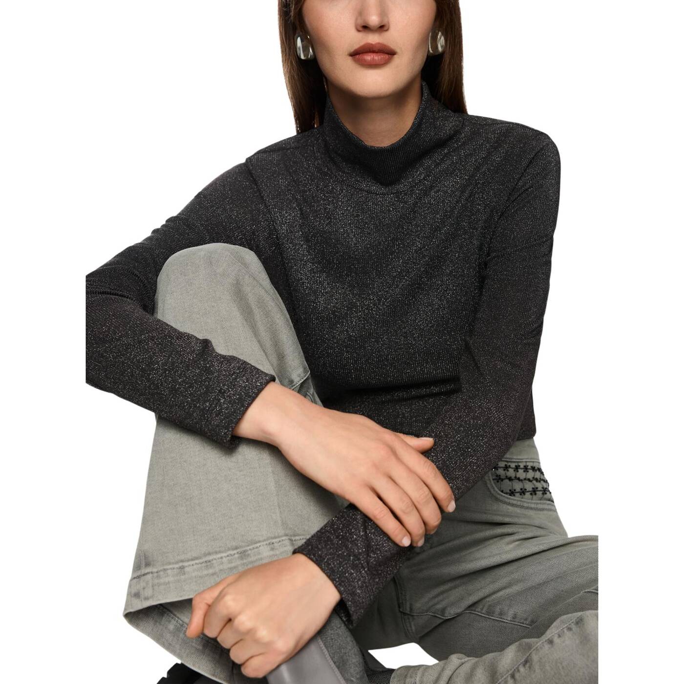 Eleganter Longsleeve mit schimmerndem Lurexgarn – schmal geschnitten für eine feminine Silhouette. Der Stehkragen verleiht dem Shirt eine moderne Note. Dank Elastananteil bietet es optimalen Tragekomfort. Perfekt für stilvolle Alltags-Looks oder abendliche Outfits.