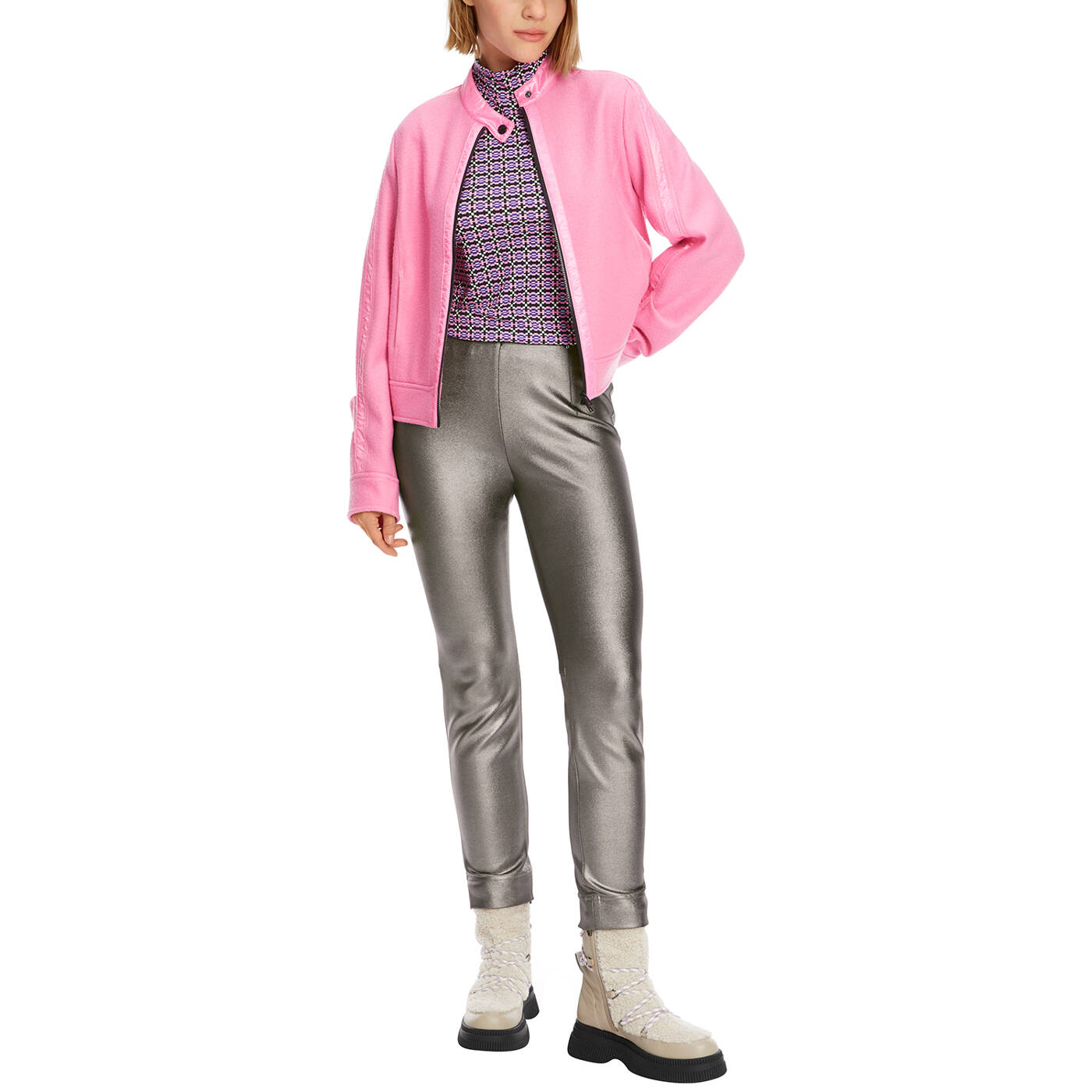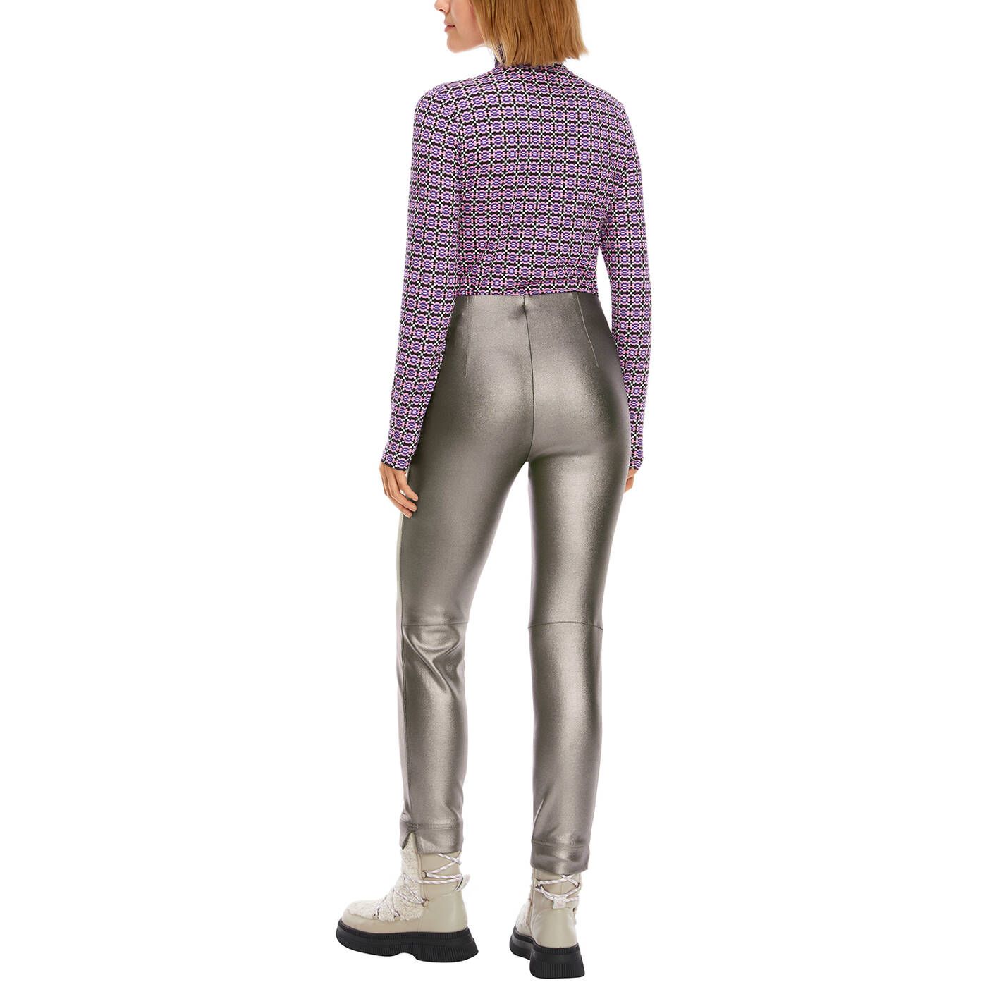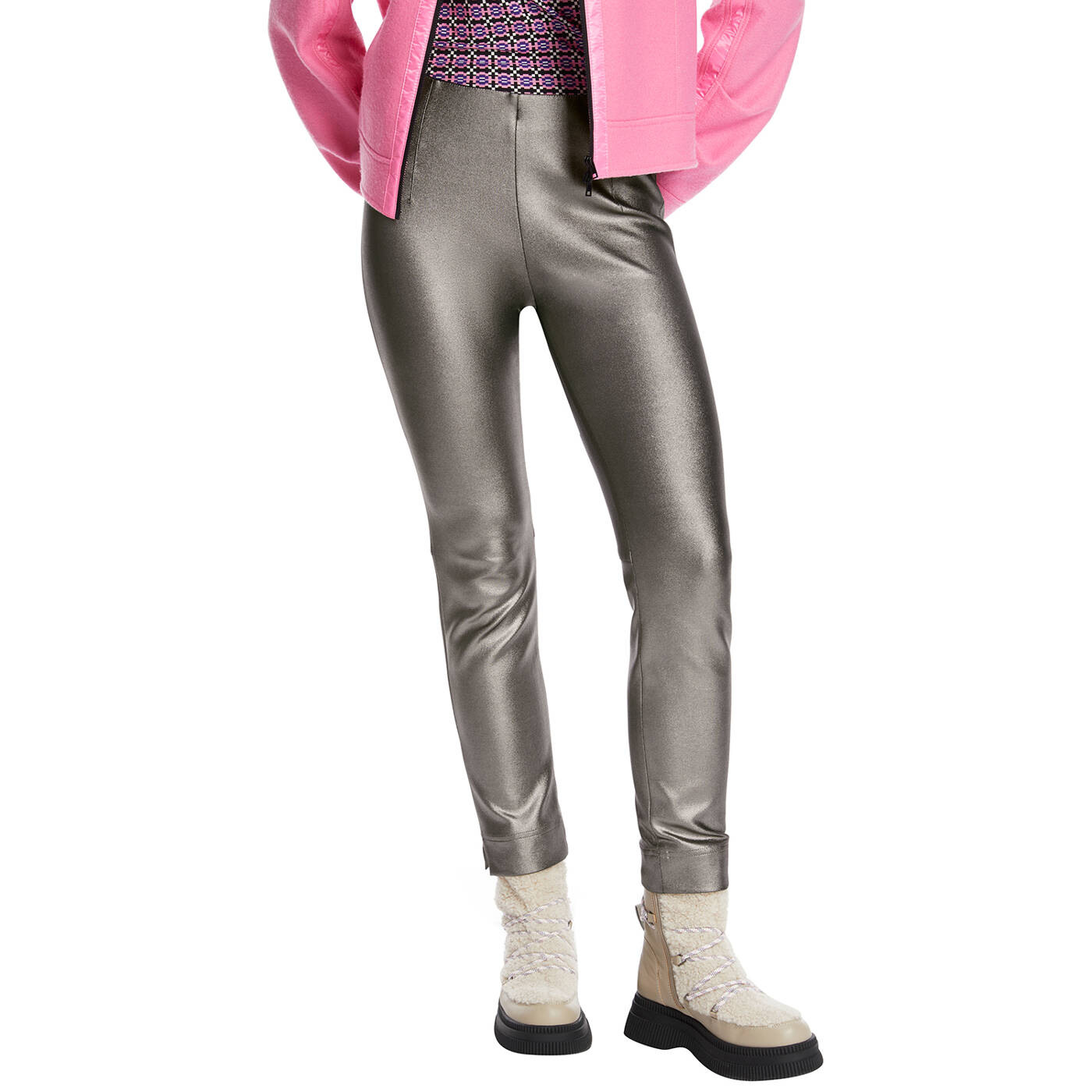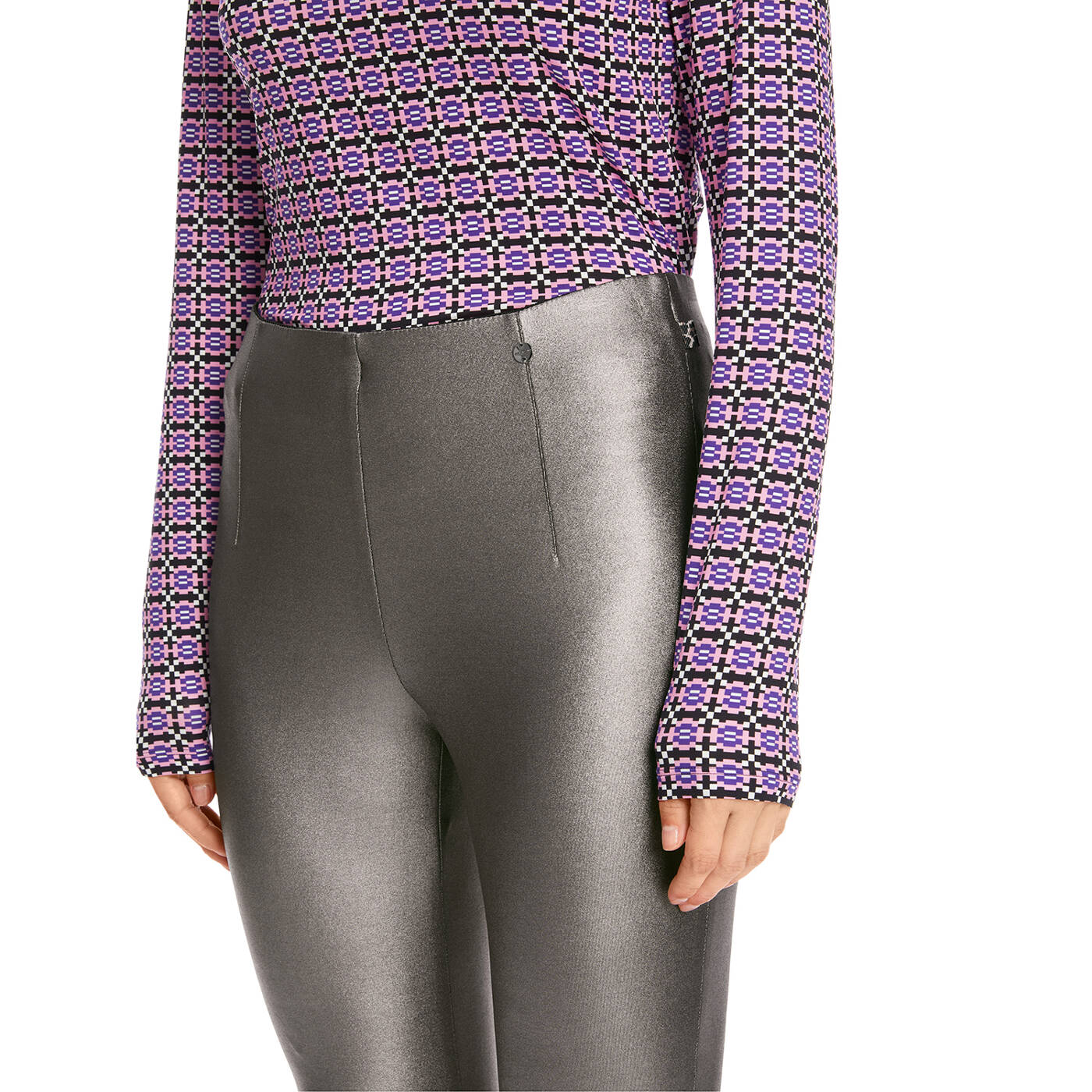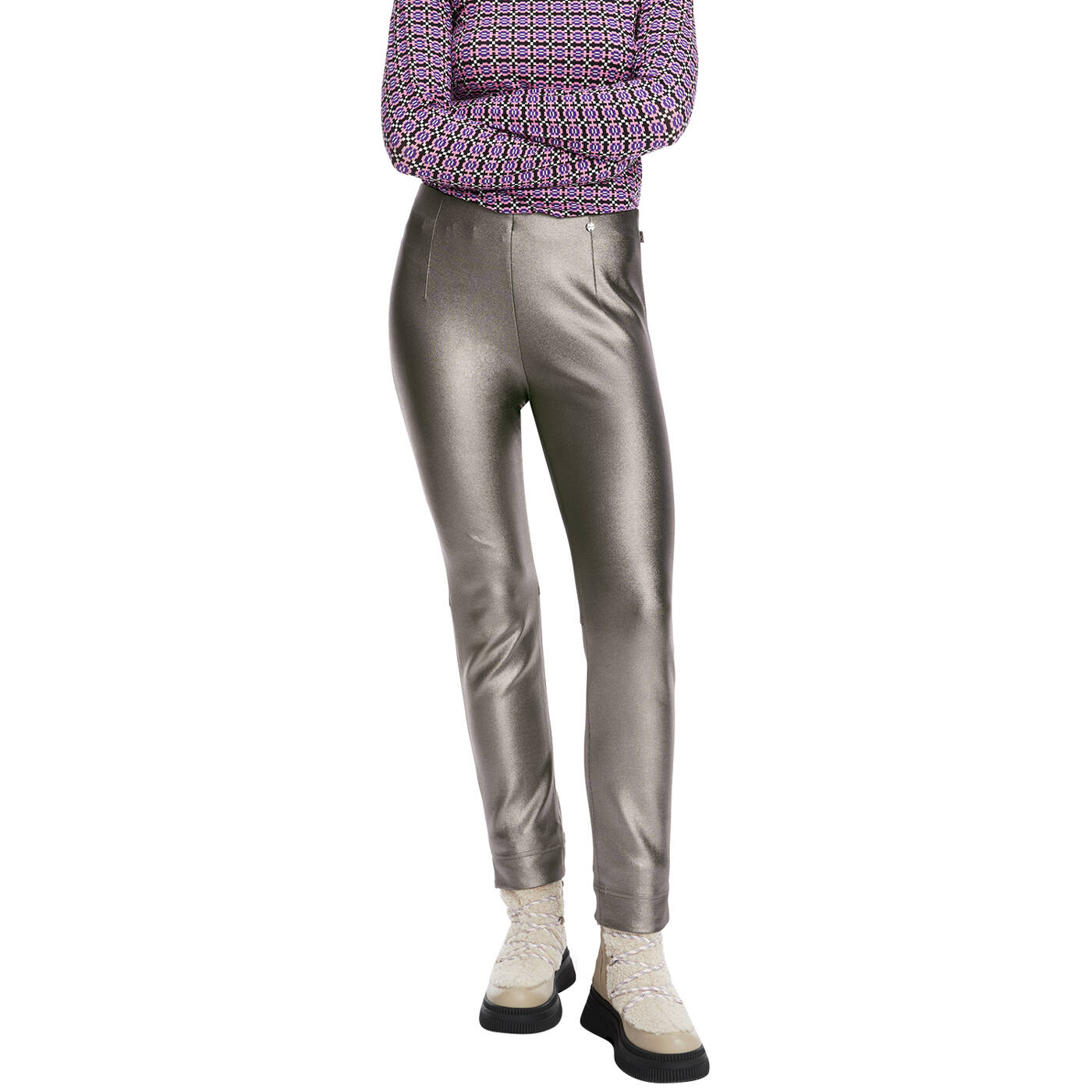 Hose SOFIA mit technischem Glanzeffekt. Modell SOFIA ist kurz und schmal geschnitten. Sie ist aus hochelastischem Jersey und hat einen super Tragekomfort und ausgezeichneten Rücksprung, d.h., sie behält ihre Form. Durch den innenliegenden Gummibund und die taschenlose Verarbeitung, verleiht sie eine harmonische Kontur