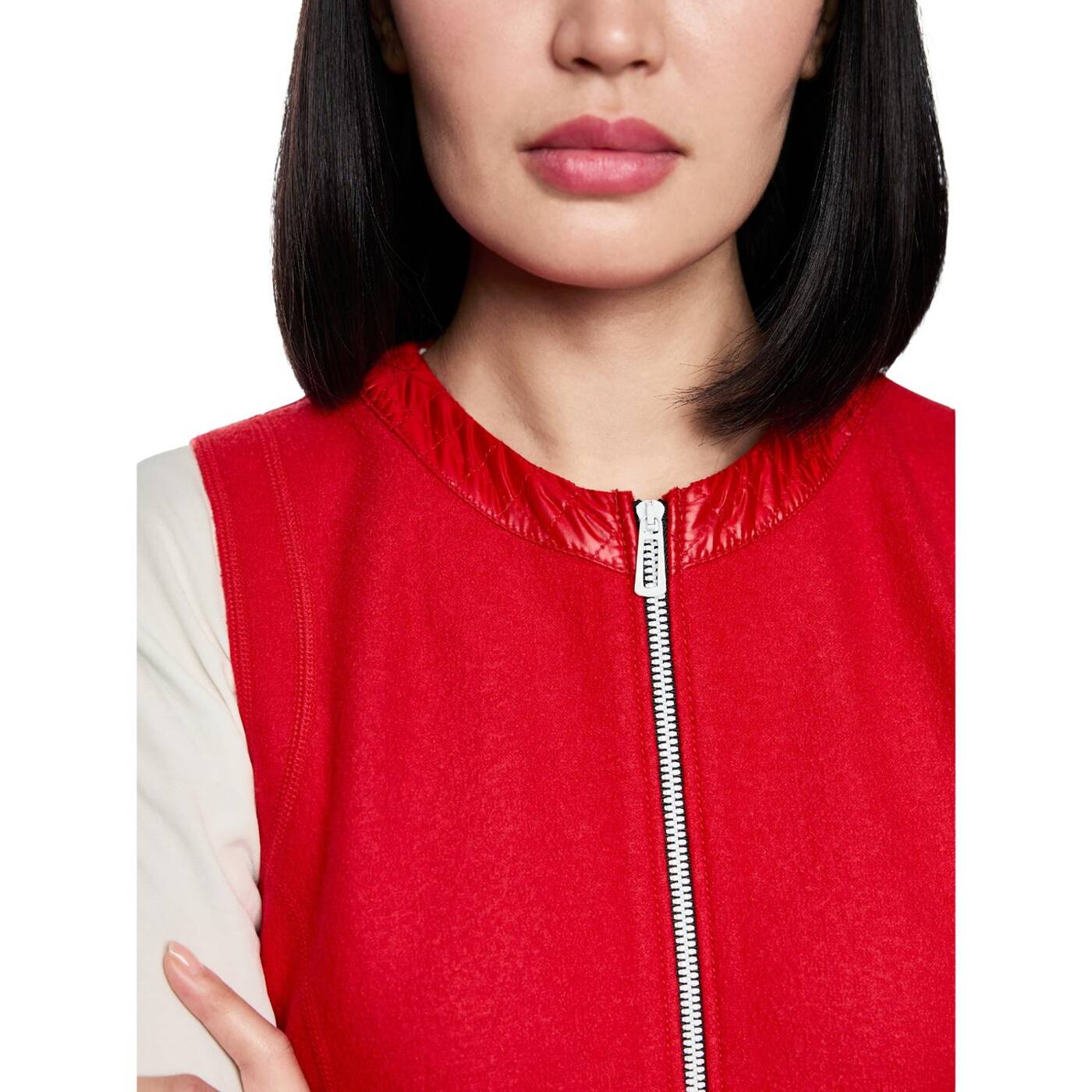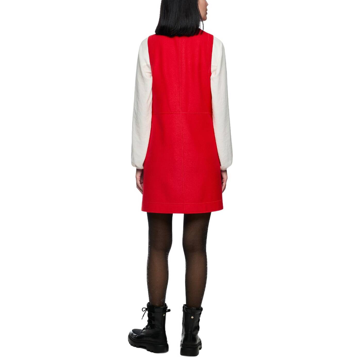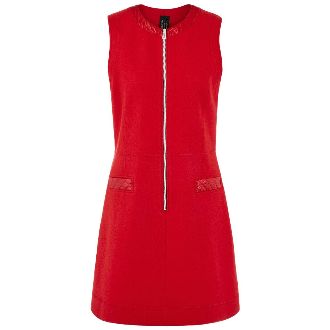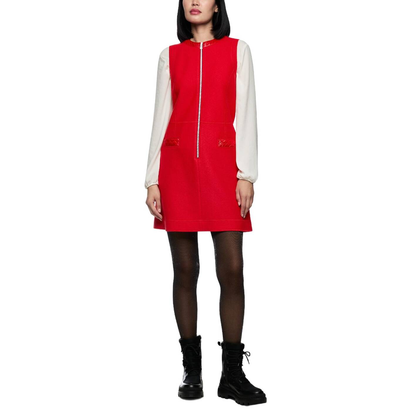 Modernes, ärmelloses Kleid aus reiner Schurwolle – „Knitted in Germany“. Der mittige Reißverschluss vorn reicht bis zur Hüfte und verleiht dem Look eine sportive Note. Kragen und Fake-Taschen setzen kontrastreiche Akzente.