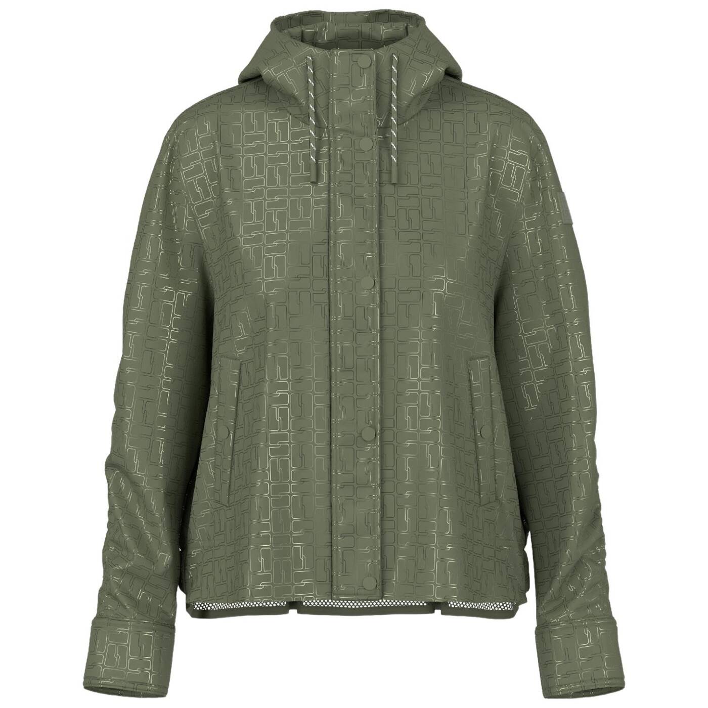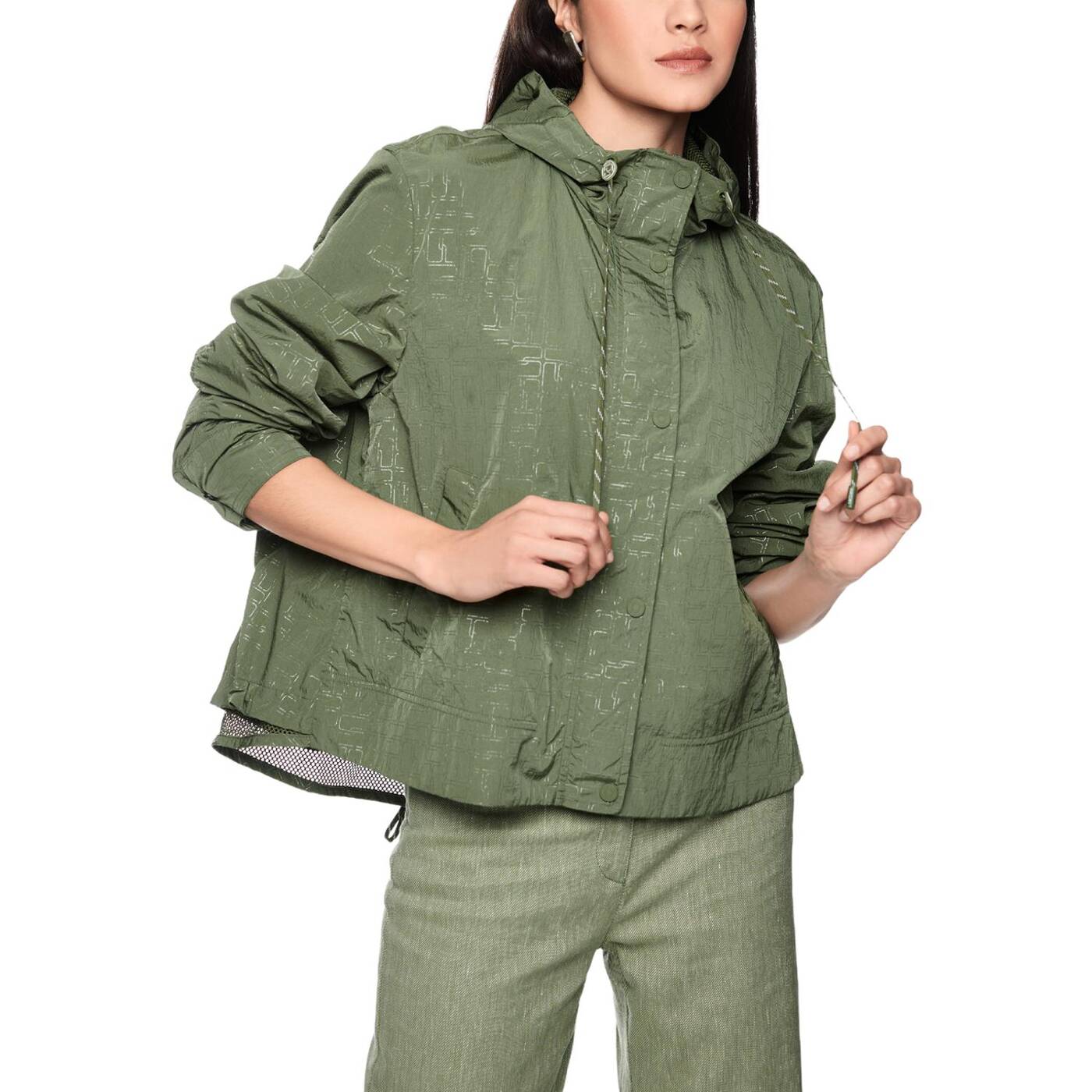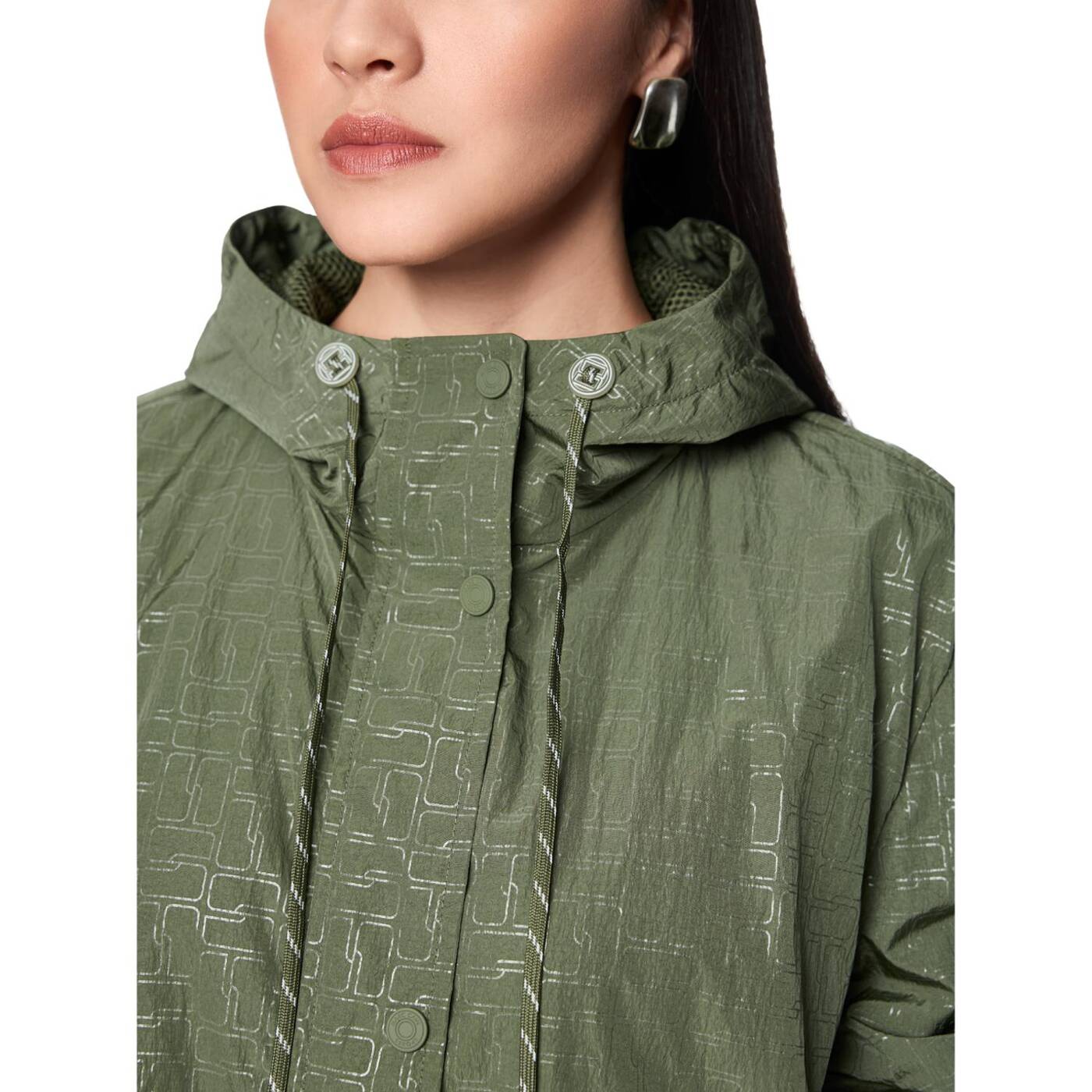 Diese leichte Outdoorjacke besticht durch viele besondere Details. Sie kommt im entspannten Schnitt und mit all-over bedrucktem Marc Cain Sports Logo. Das leichte Material ist angenehm zu tragen und die Kapuze sorgt für zusätzlichen Komfort bei schlechtem Wetter. Geschlossen wird die Jacke mit einem Reißverschluss und einer zusätzlichen Leiste mit Druckknöpfen. Seitliche Taschen und ein eingearbeitetes Netz-Futter im Inneren unterstreichen den sportlichen Touch.|Lockerer Schnitt|Mit Kapuze|Marc Cain Sports Logo|Reißverschluss|Das Model ist 179 cm groß und trägt N3/38.
