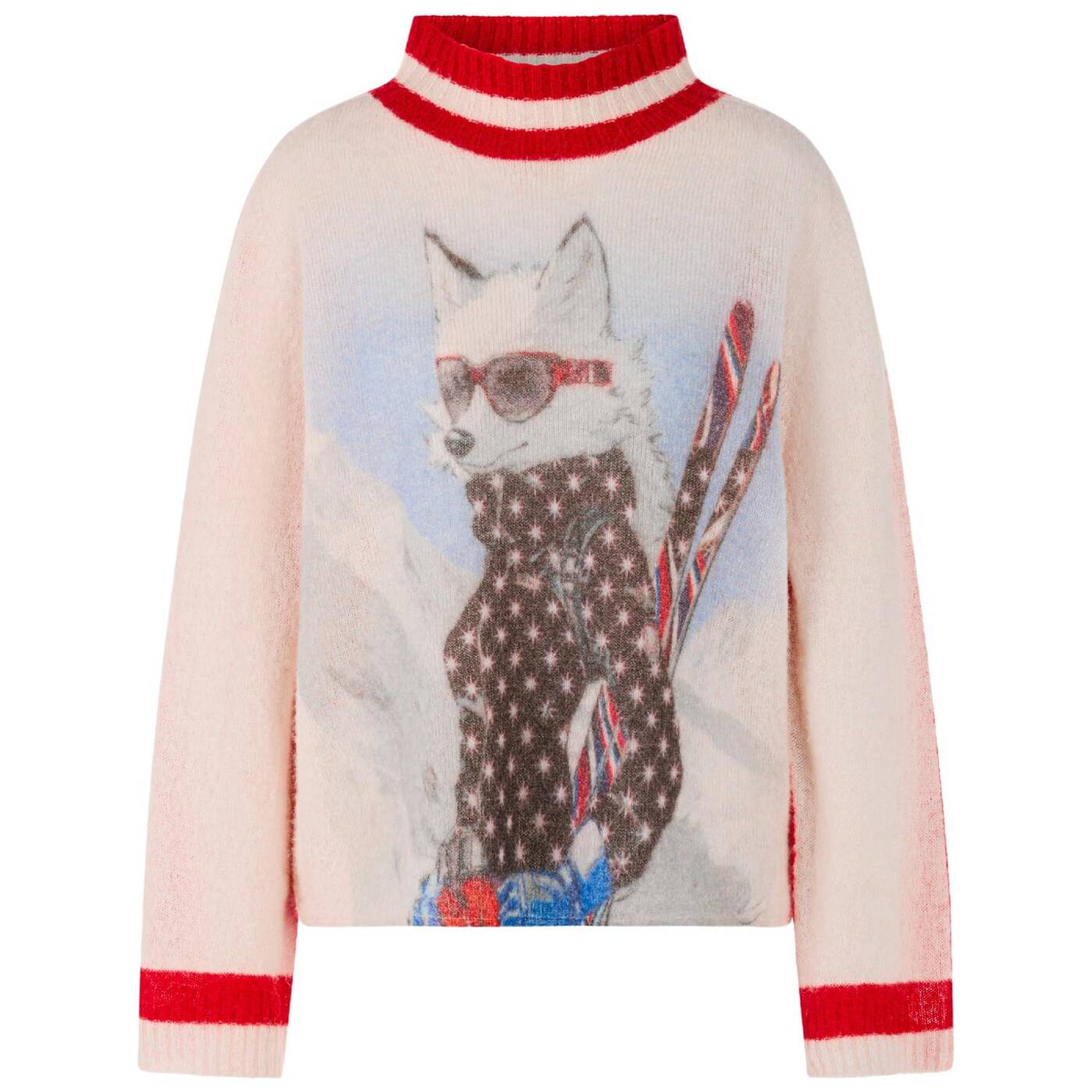 Feinstrickpullover mit weitem Stehkragen in Rippstrick. Die Vorderseite zeigt einen auffälligen Print mit Polarfuchs-Motiv. Das Rückenteil ist farblich kontrastierend gestaltet.
