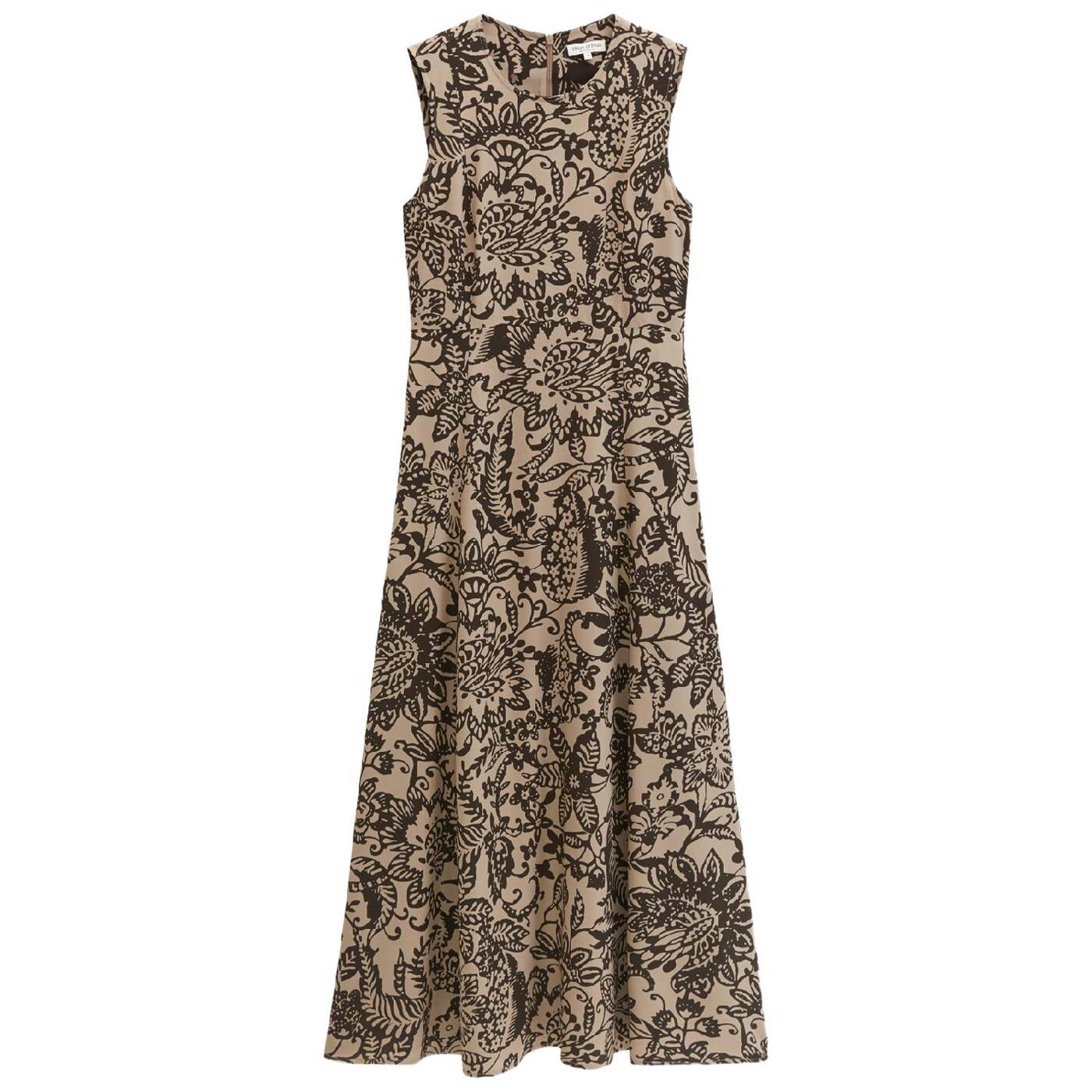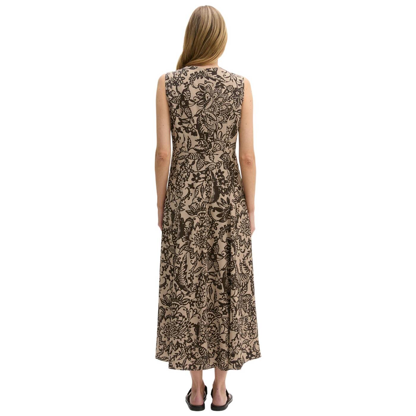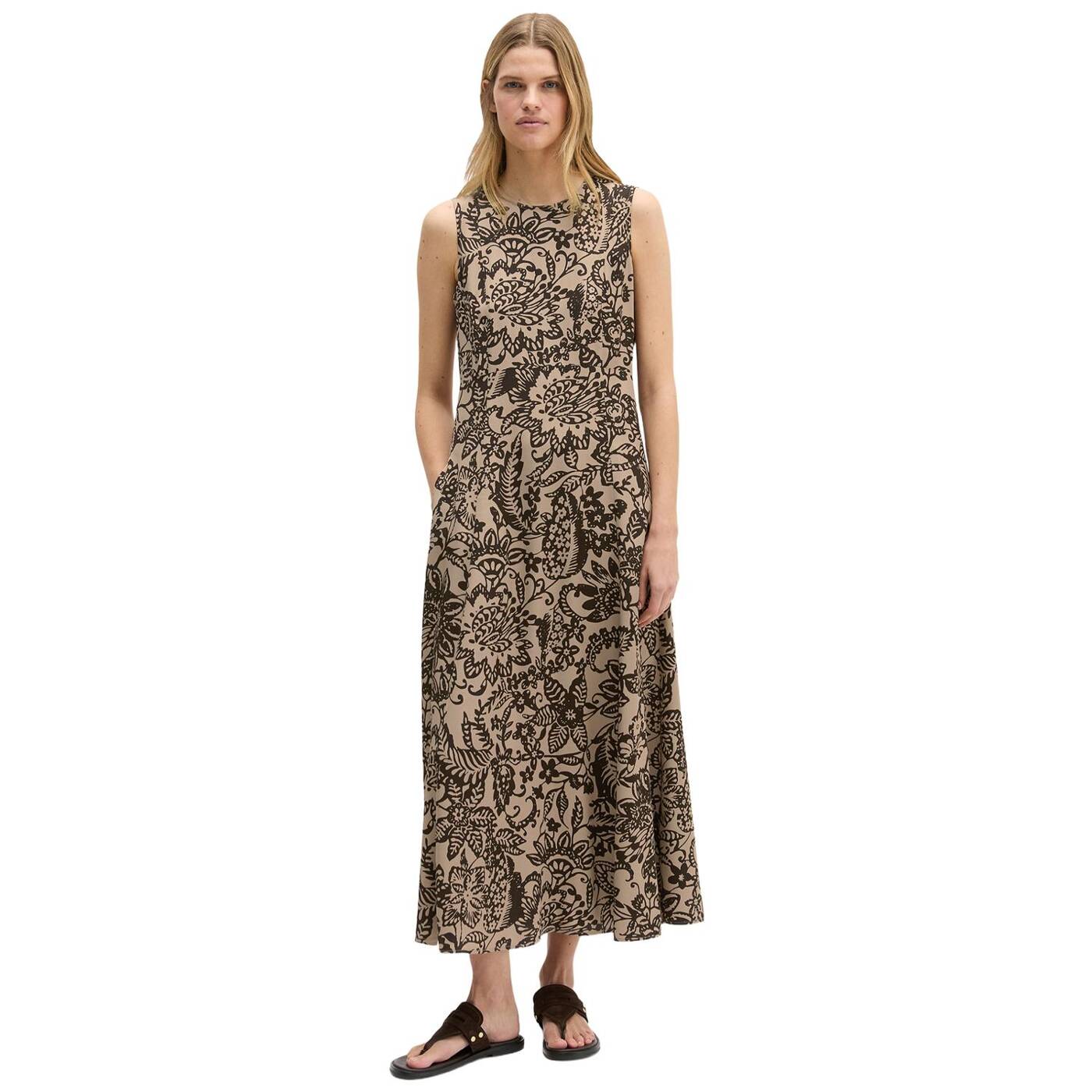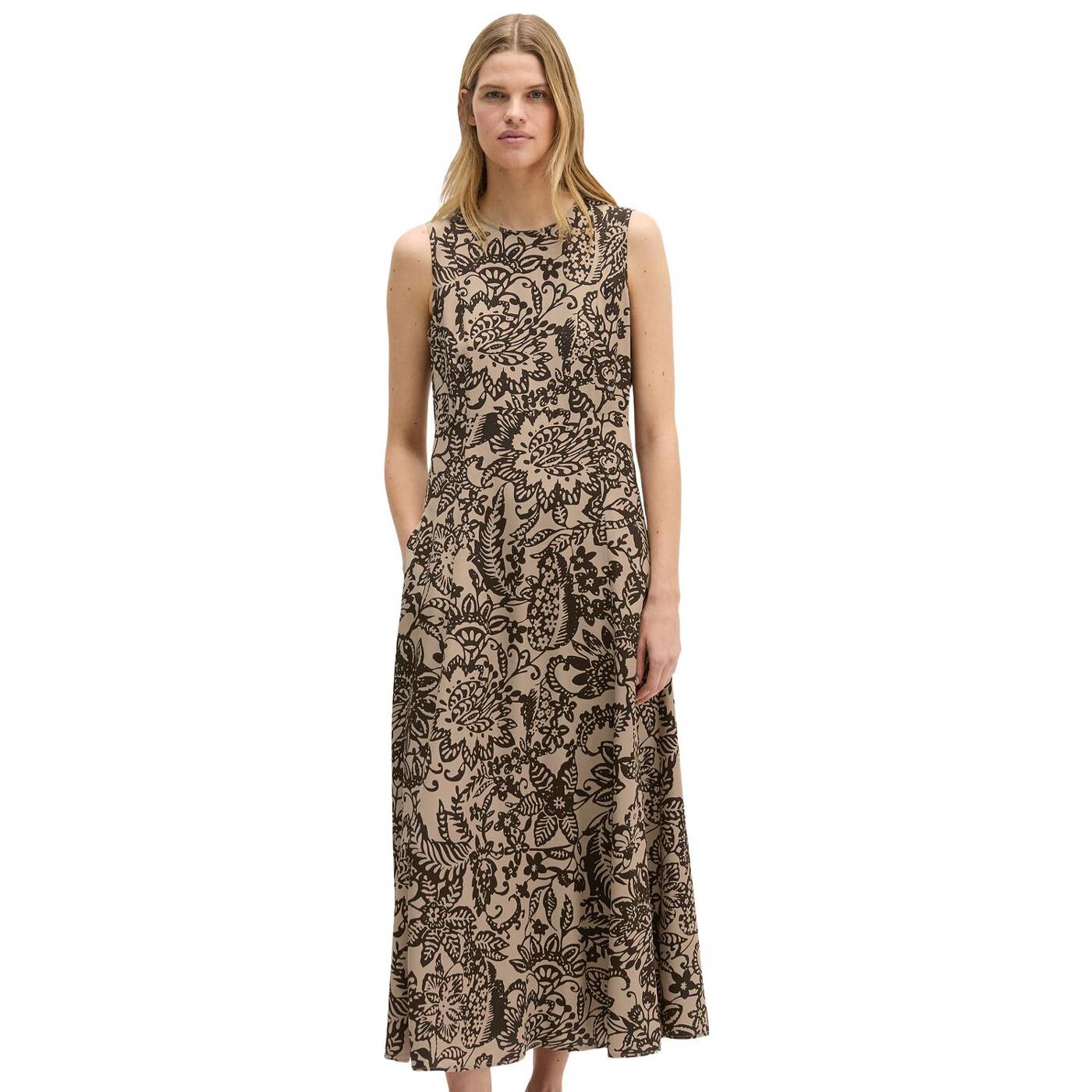 Best dressed: schickes, langes und ärmelloses kleid aus hochwertigem, fließendem viskose-twill mit markantem allover-print. das kleid hat eine elegante, feminine silhouette und wird in der hinteren mitte mit einem nahtfeinen reißverschluss geschlossen. das oberteil sitzt figurbetont, der rock ist weit und ausgestellt und hat seitlich zwei praktische naht-eingrifftaschen. das kleid ist nicht gefüttert.