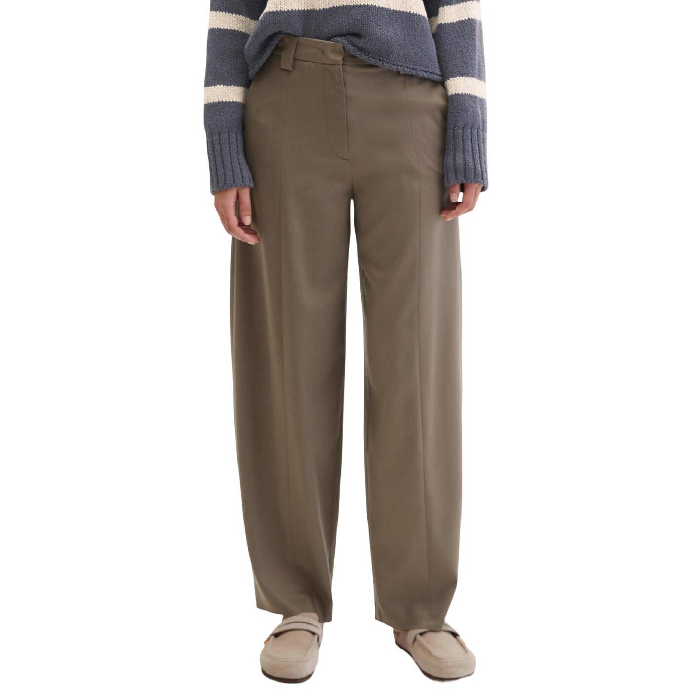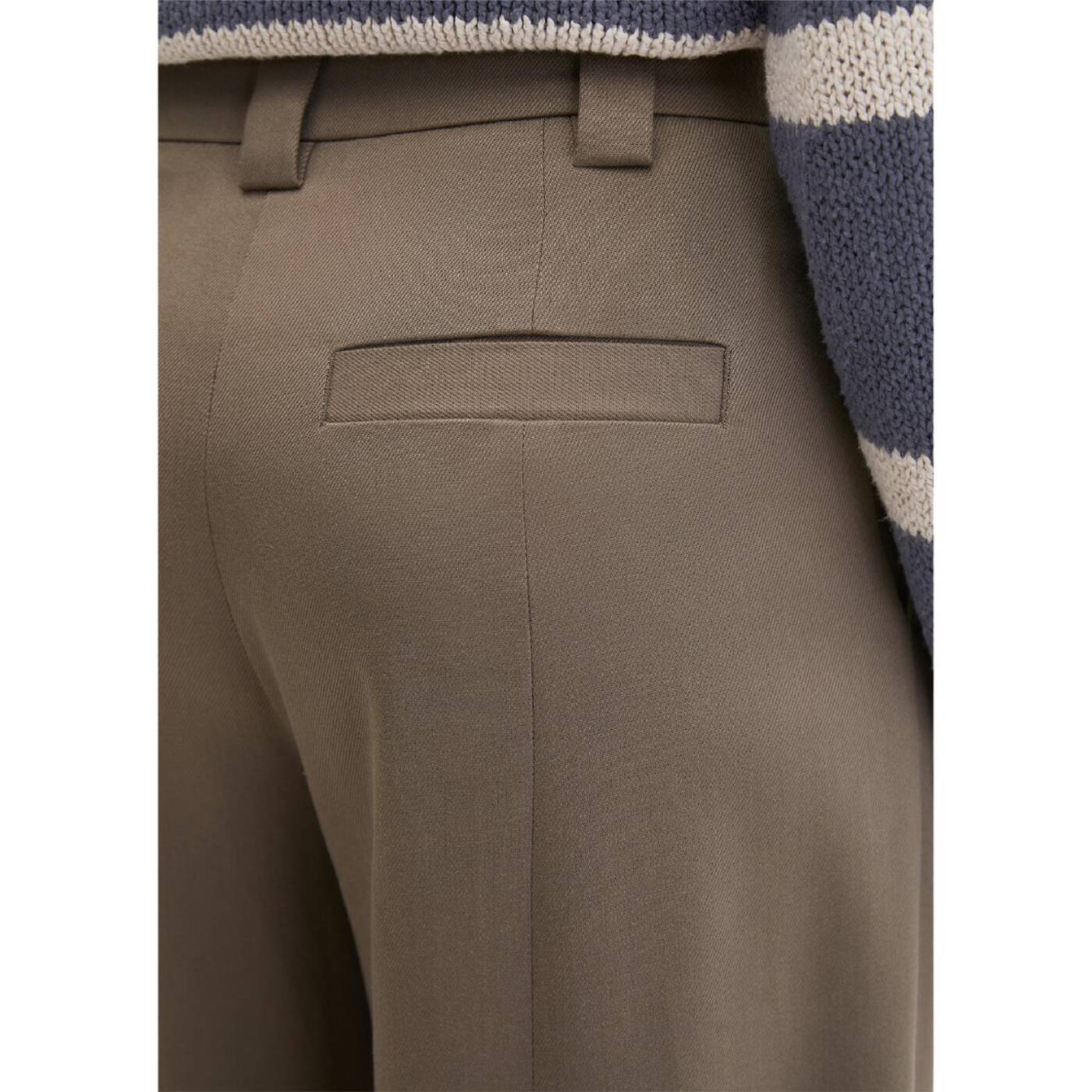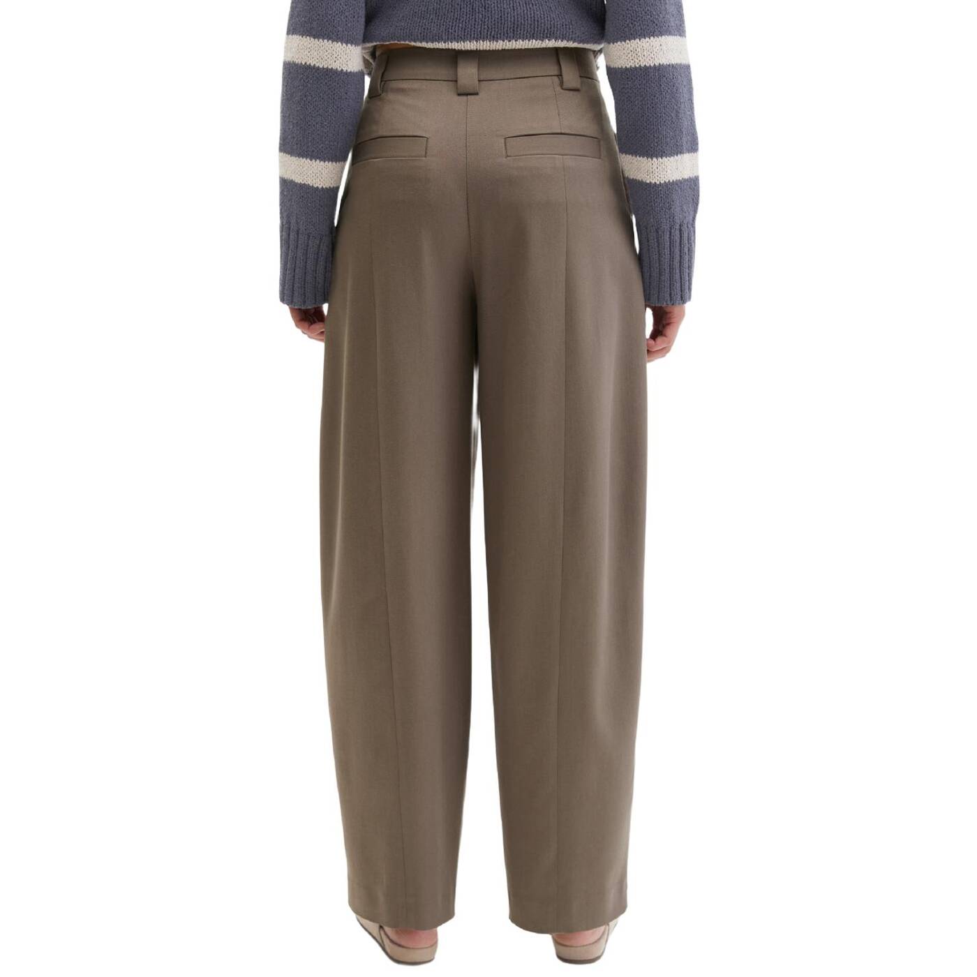 Barrel-hosen sind derzeit der absolute trend. allen voran die jeans. wer auf der suche nach einer edlen alternative fürs büro ist, wird jetzt mit der lässigen barrel-pants im anzug-stil fündig. die hose ist im bereich der oberschenkel weit und voluminös geschnitten, verläuft dann mit einer sanften „biegung” und wird zum knöchel hin schmaler und kürzer. die klassische bundverarbeitung mit verdecktem hakenverschluss und „fishtail“-design erinnert an traditionelle merkmale aus der herrenbekleidung. beides verleiht der hose eine elegante, formelle ästhetik. die hose verfügt vorne über schräge eingrifftaschen und auf der rückseite über zwei schmale paspeltaschen.
