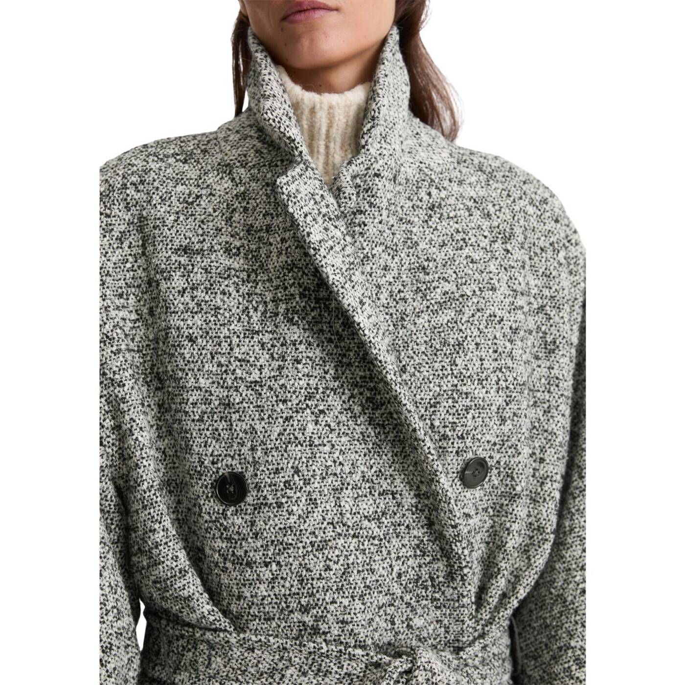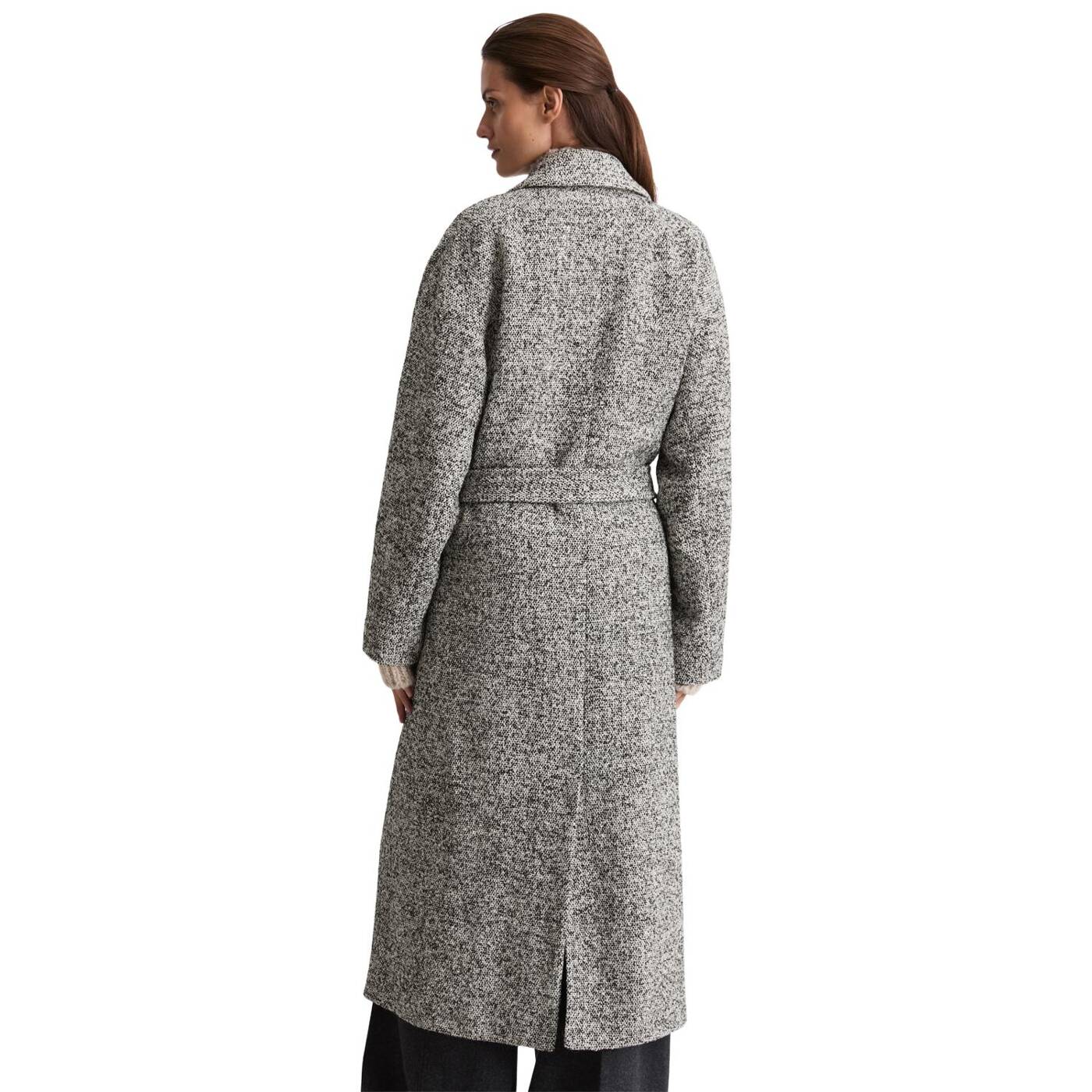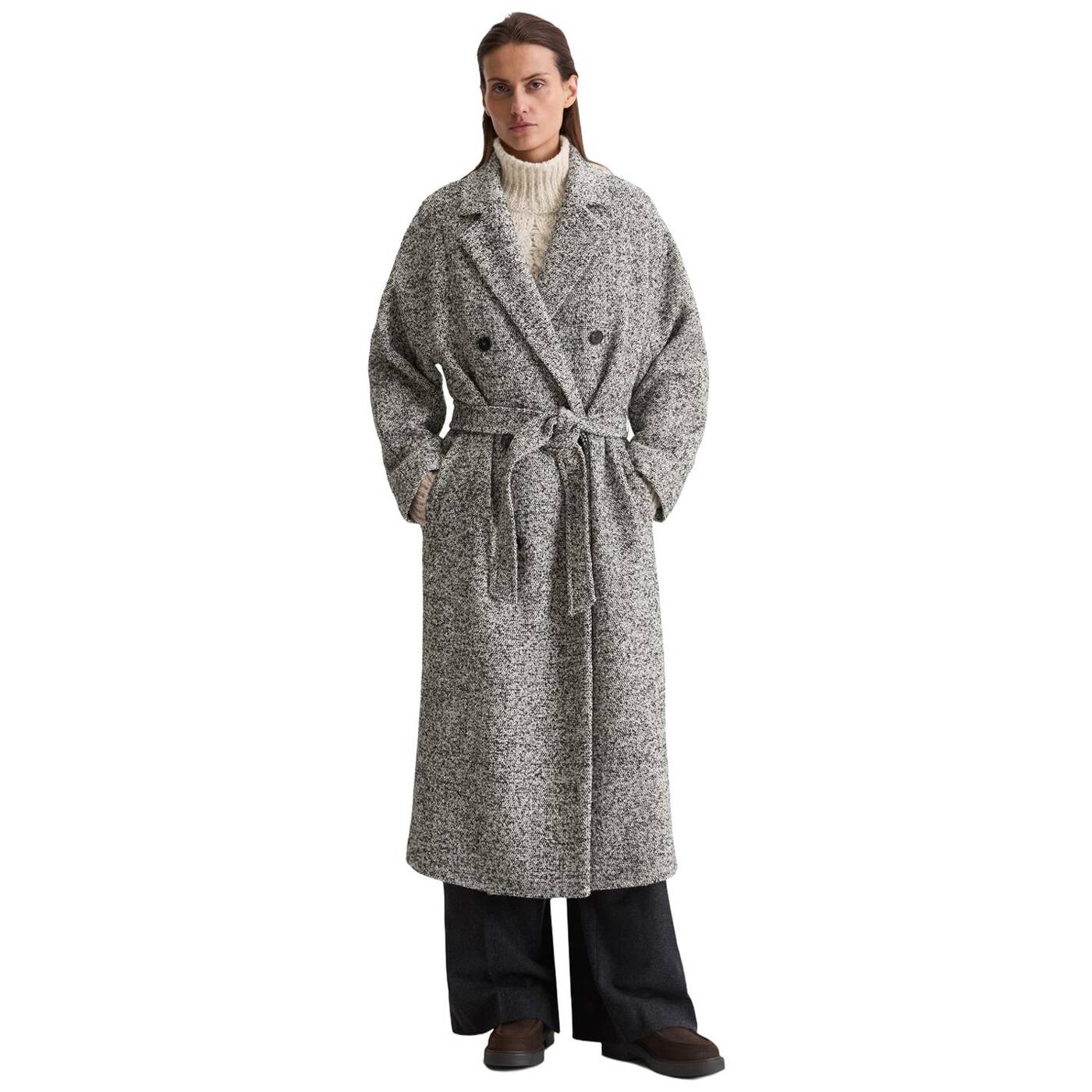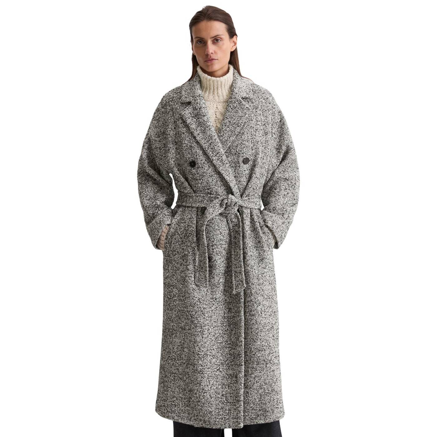 Ein wollmantel ist die perfekte basis für ein elegantes winter-outfit und setzt ein echtes statement. er ist klassisch, zeitlos und gleichzeitig modern. er schützt uns vor wind und wetter und verleiht schlichten outfits im handumdrehen das gewisse etwas. unser sportiv-elegantes modell mit doppelreihiger knopfleiste besteht aus einem exklusiven, recycelten italienischen wollgemisch in bouclé-qualität, hat einen lässigen, entspannten schnitt und ärmel in dezentem fledermaus-shape. der mantel ist komplett gefüttert und verfügt über einen reverskragen, zwei praktische seitliche eingrifftaschen und einen abnehmbaren taillengürtel. besonders gefällt uns der schlitz in der hinteren mitte, der nicht nur für bewegungsfreiheit sorgt, sondern auch für eine coole dynamik beim gehen.