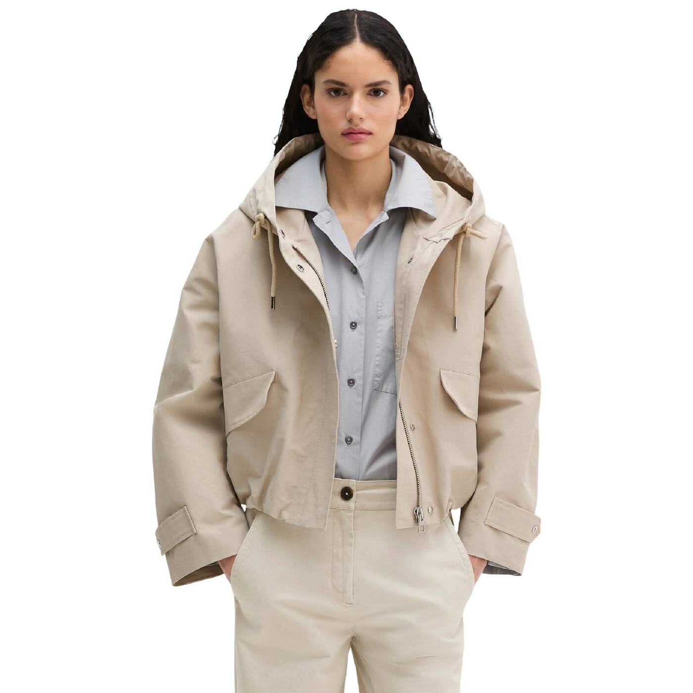 Die lässige, kurze canvasjacke mit kapuze im angesagten egg-shape-design ist das perfekte übergangsstück. das modell ist aus wasserabweisendem cotton-nylon gefertigt und hat ein weiches futter mit baumwoll-touch. sie verfügt über eine innovative schnittführung mit großer, verstellbarer kapuze, überschnittenen schultern, weiten ärmeln mit verstellbaren laschen, einem verdeckten frontreißverschluss mit darüberliegender knopfleiste sowie großen klappentaschen. die jacke ist komplett gefüttert und hat einen verstellbaren kordelzug am saum, mit dem sich die silhouette nach belieben verändern lässt.
