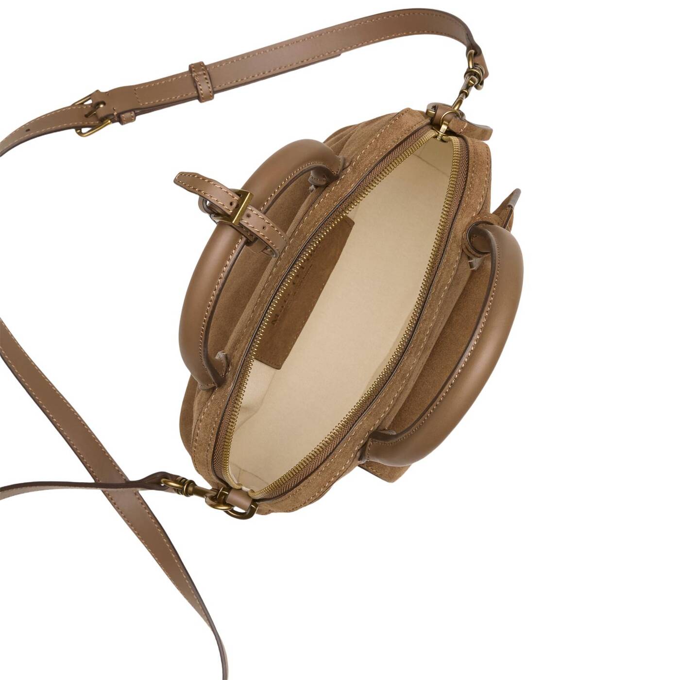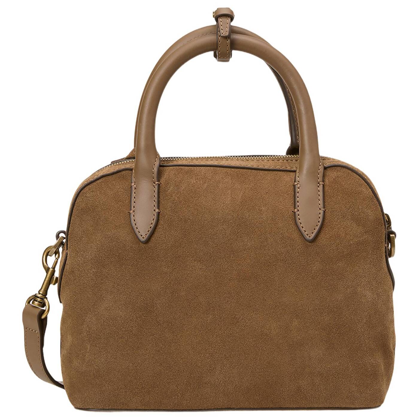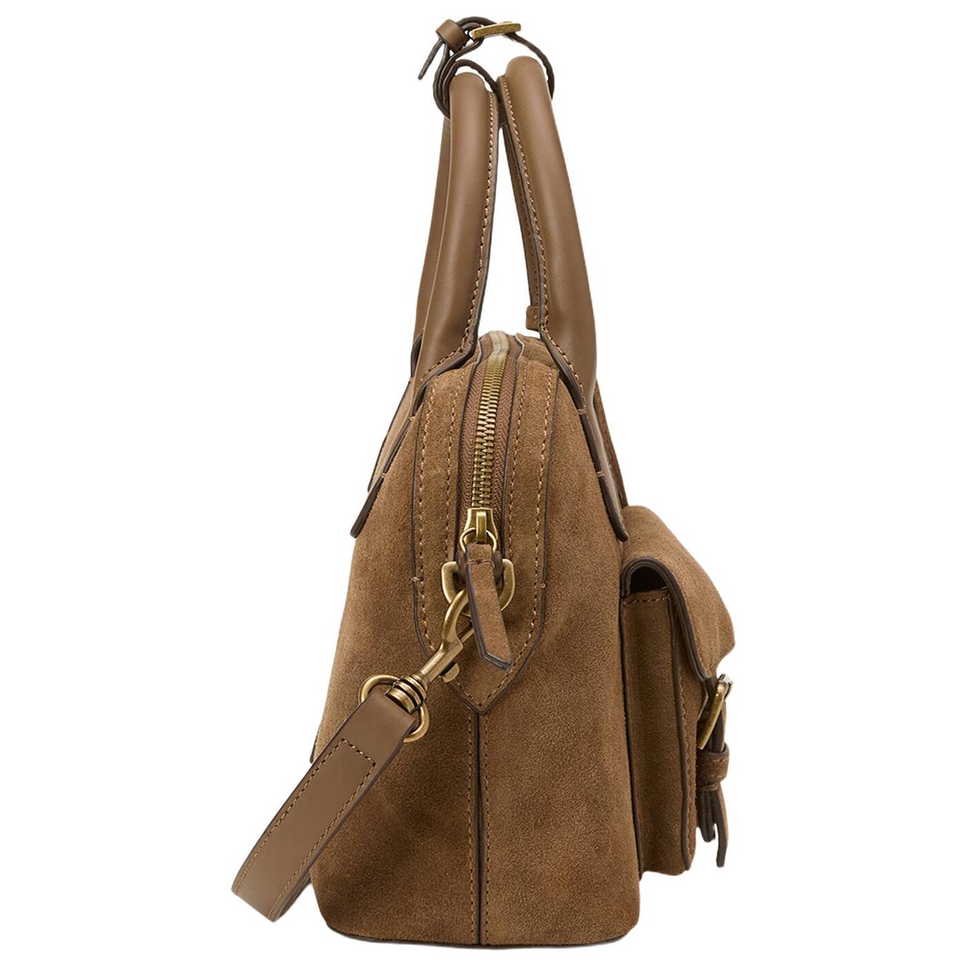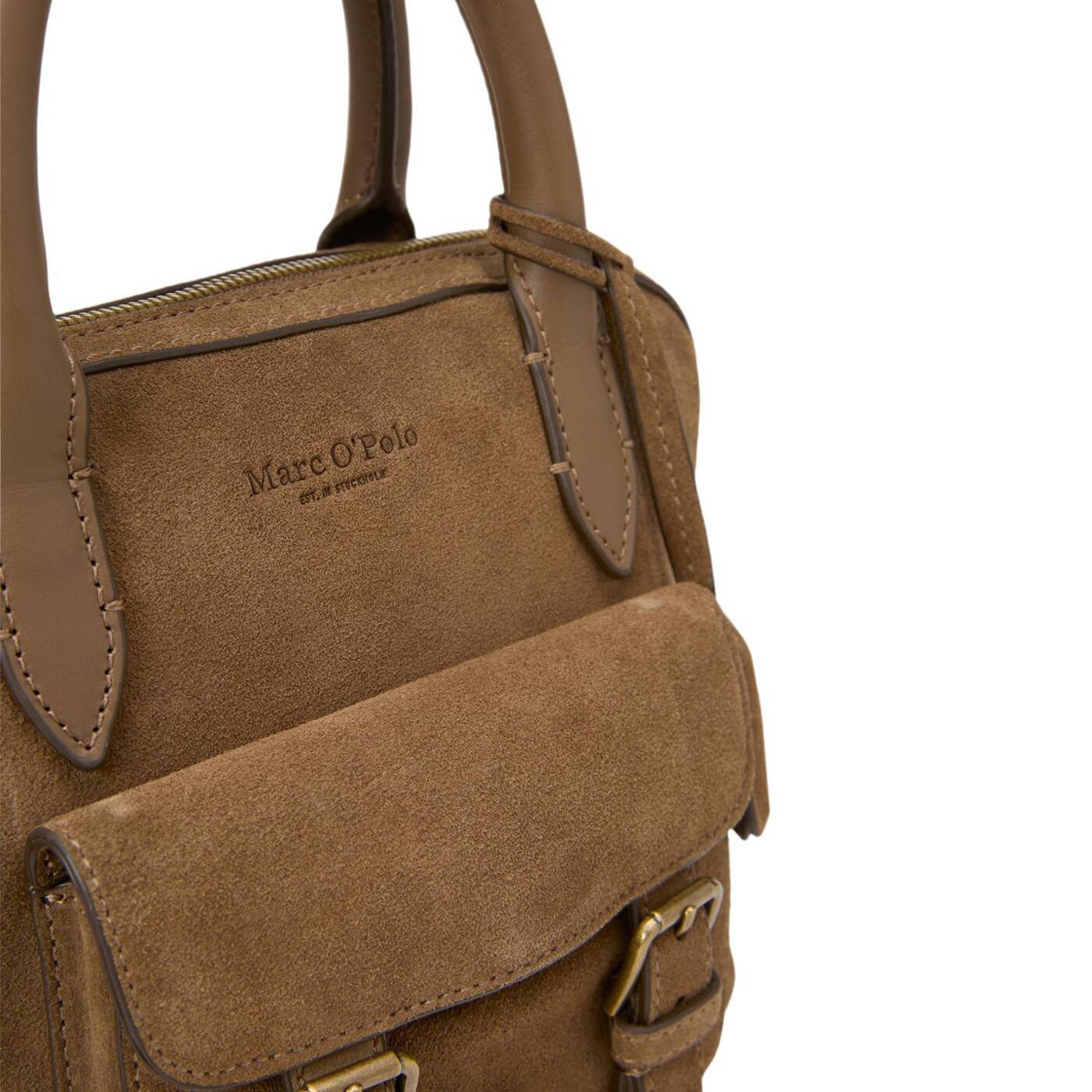 Lässiger Begleiter für jeden Tag: kompakte Crossbody Bag aus weichem Velours-Rindleder in harmonischer Form mit weich abgerundeten Ecken und edlen Messing-Details. Das mit Organic Cotton gefütterte Hauptfach bietet ein Münzfach innen, außen ergänzt durch ein kleineres Fach mit Schnallenverschluss. Feste Tragegriffe und ein abnehmbarer, verstellbarer Schulterriemen mit Karabinerhaken verbinden Funktion und Stil. Der stabile Boden verleiht Struktur, während ein schmaler Lederriemen die Griffe zusammenhält. Abgerundet durch einen abnehmbaren Lederanhänger mit integrierter Münze – ein feines Detail mit praktischem Nutzen.