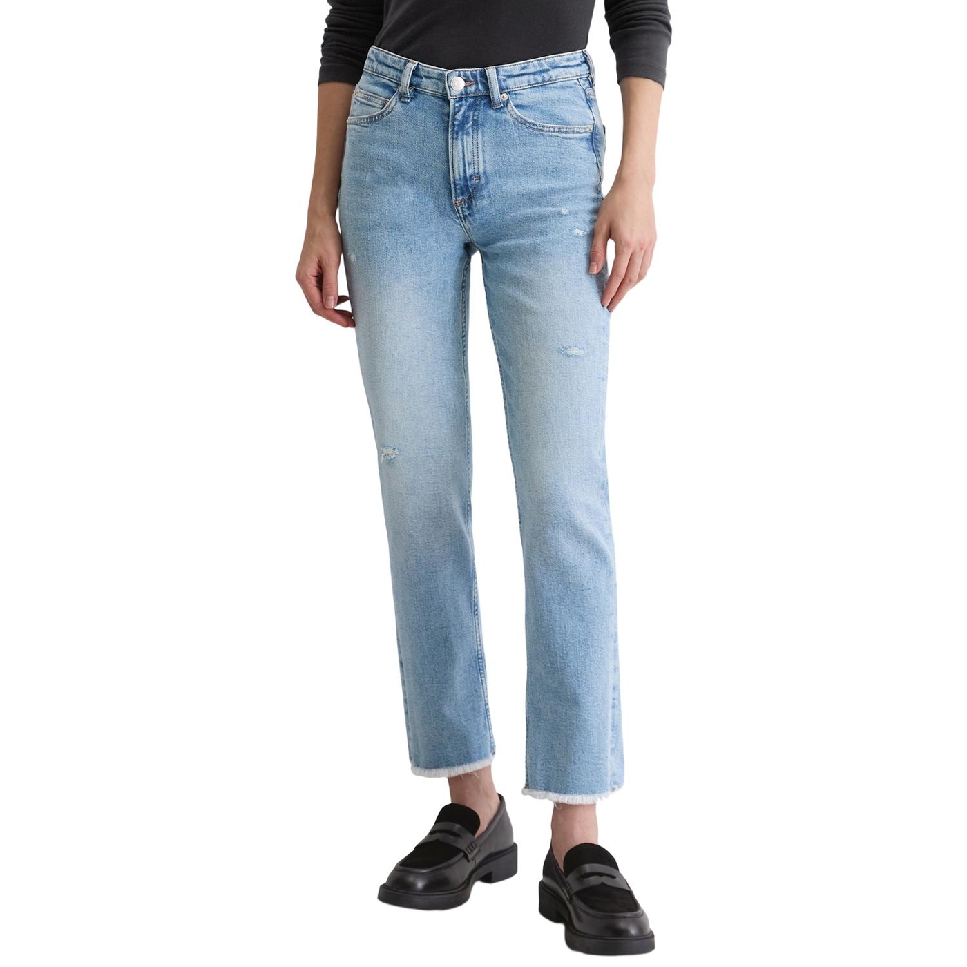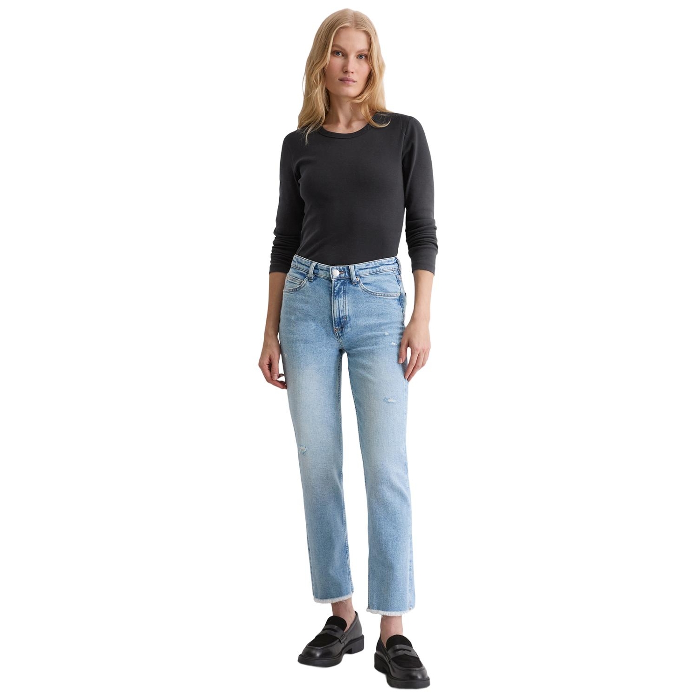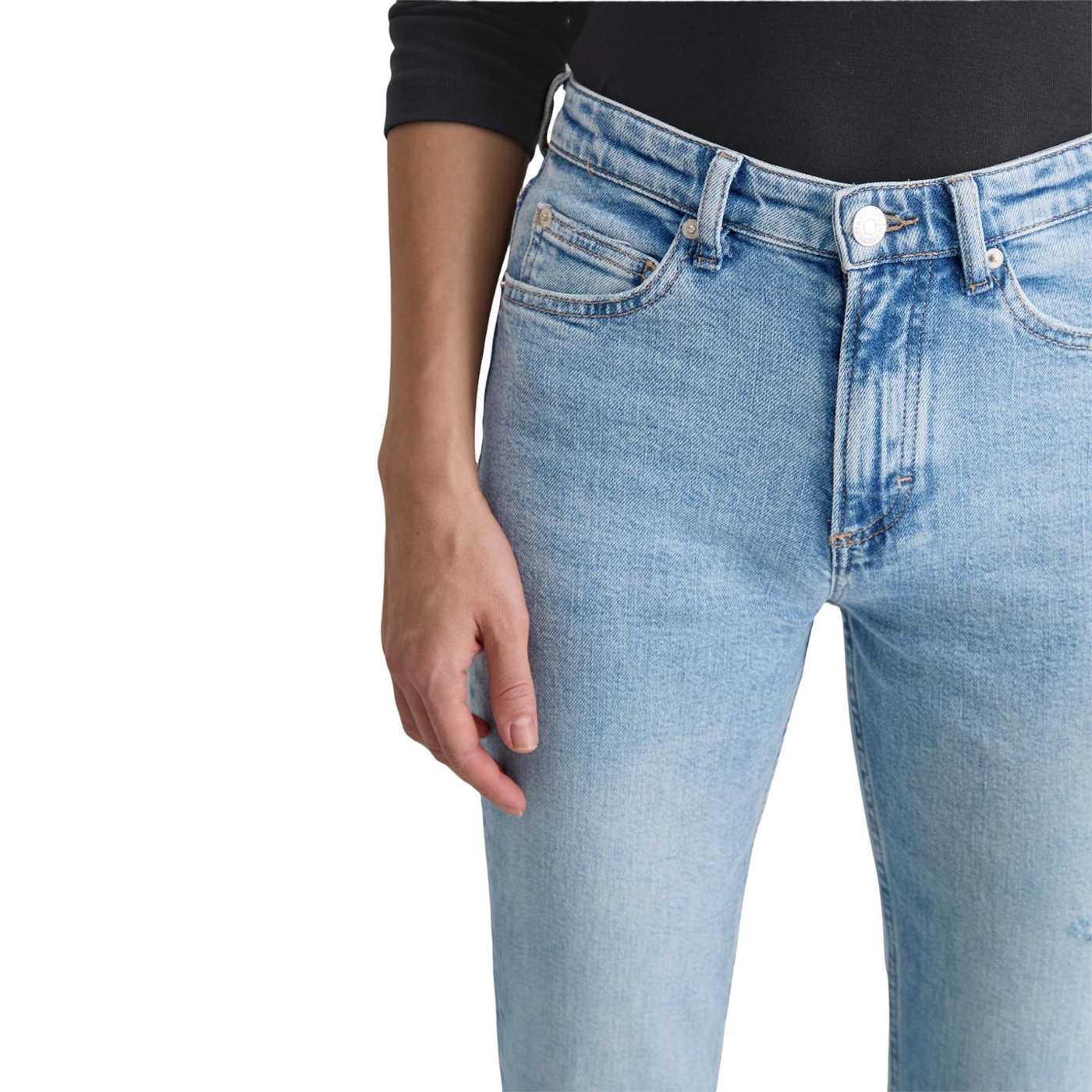 Sie betont die Taille und schmeichelt der Figur: die Jeans - Model Linde - mit geradem, verkürztem Beinverlauf und hoher Leibhöhe. Sie besteht aus einer elastischen Bio-Baumwollmischung mit Elasthan. Letzteres sorgt für Stabilität im Gewebe, hohe Reißfestigkeit sowie Flexibilität und Komfort. Als moderne Interpretation des klassischen Schnitts kommt sie im lässigen Five-Pocket-Style. Coolness-Faktor Farbe: stark ausgewaschen, lässiger Used-Look mit Destroy-Details, gefranste Saumkante und den charakteristischen tabakfarbenen Nähten. Unser Ziel ist es, unser bestes Jeans-Produkt herzustellen. Von den Rohstoffen bis hin zu den Färbeprozessen und Waschverfahren. Verfolgen Sie unseren Weg zu einer verantwortungsvolleren Produktion. It’s on us.