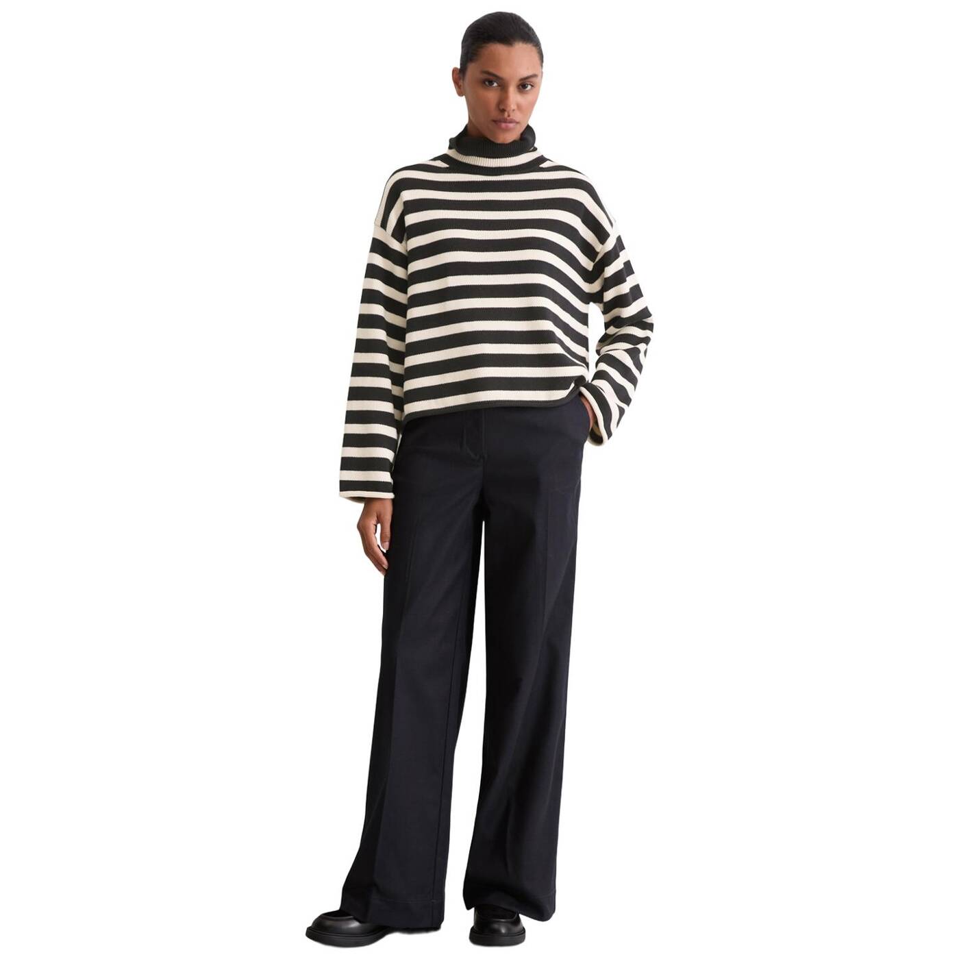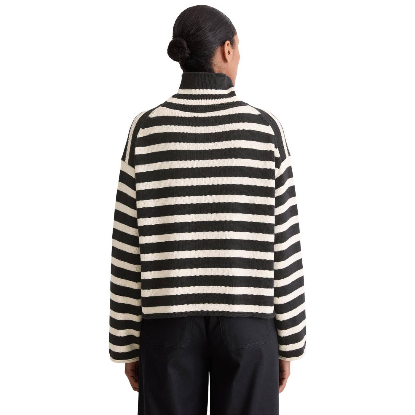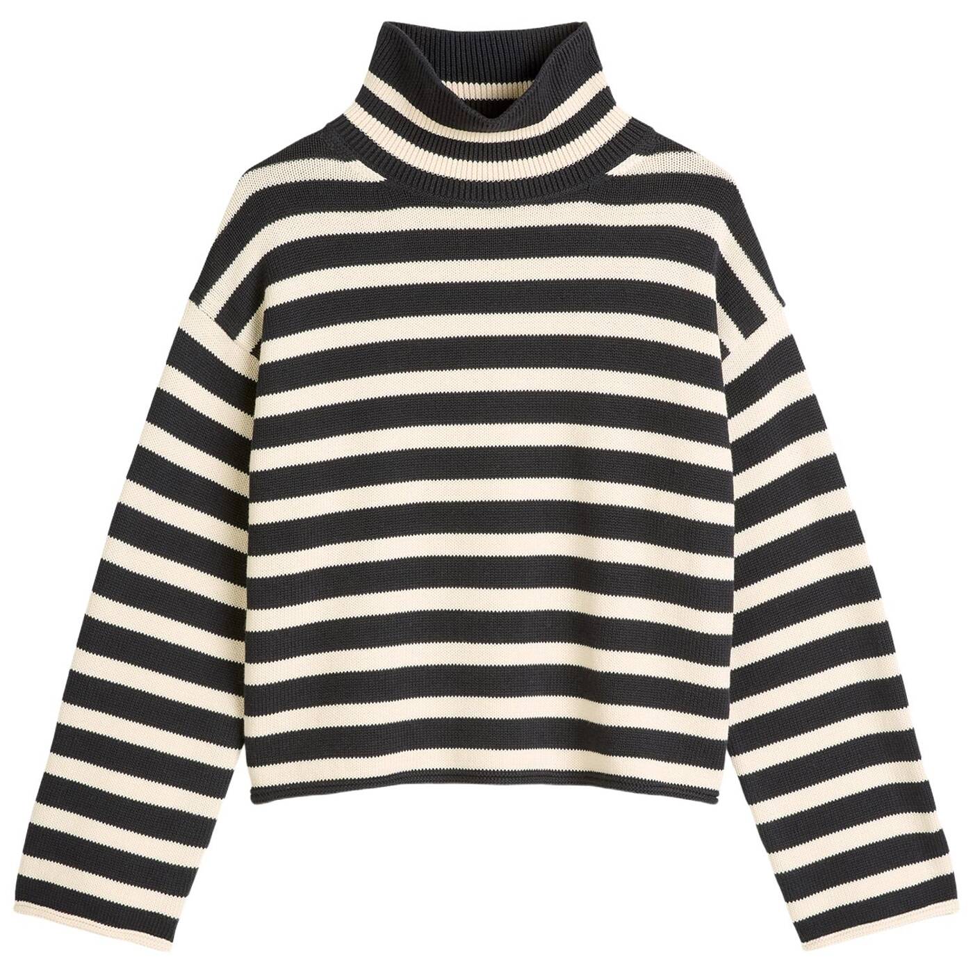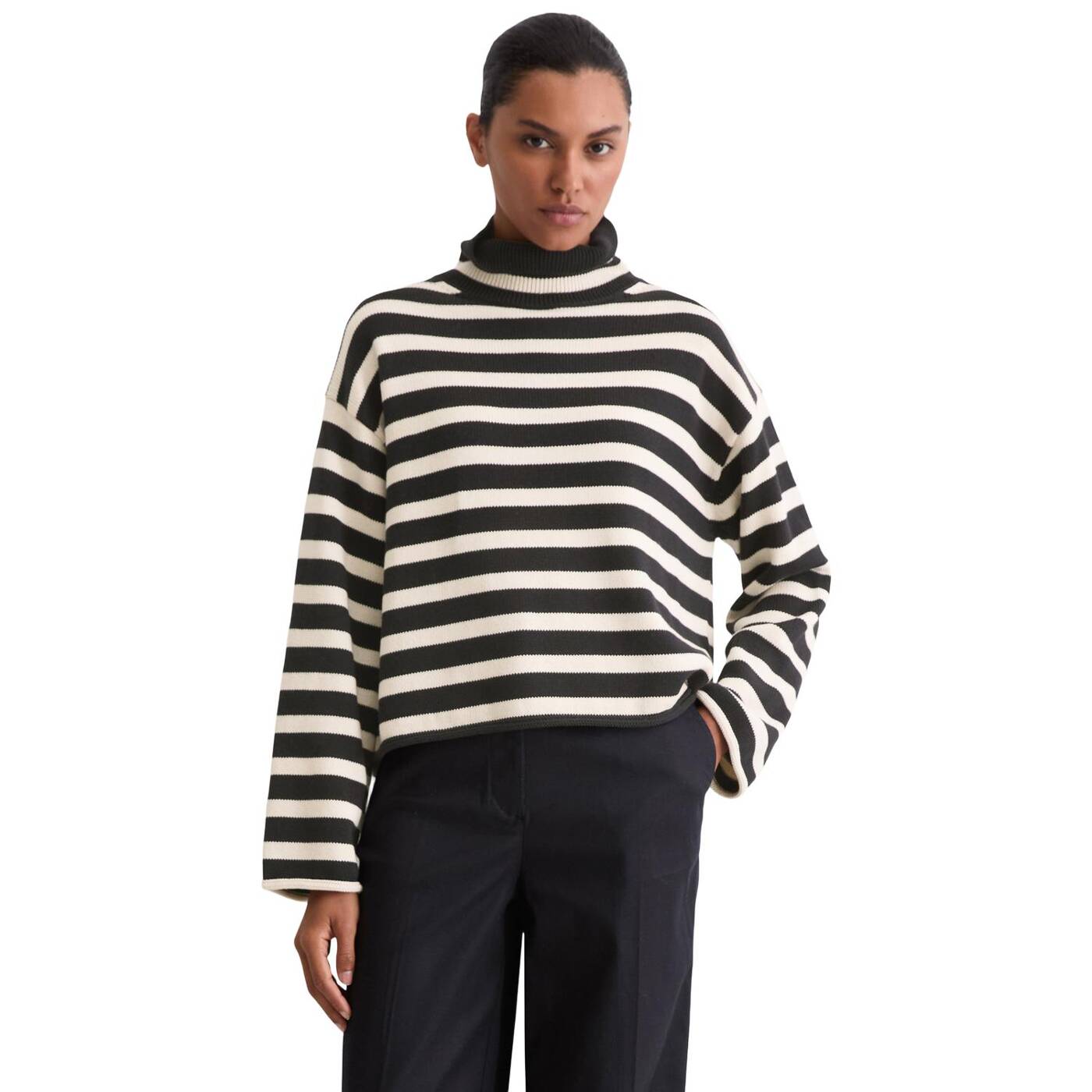 Classy, lässig und ein täglicher Favorit: der locker geschnittene Rollkragenpullover mit markantem, garngefärbtem Streifenmuster. Das Modell ist aus hochwertigem, schwerem Bio-Baumwollgarn gefertigt und verfügt über einen hohen, gerippten Kragen zum Umschlagen, stark überschnittene Schultern und gerollte Säume. Unser Styling-Tipp: mit schmalen Hosen, Röcken oder Straight-Leg-Jeans kombinieren