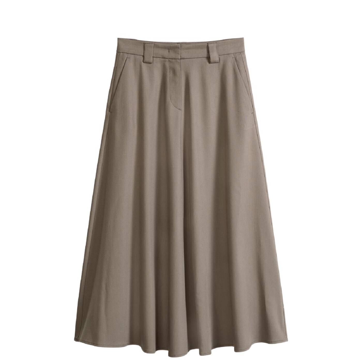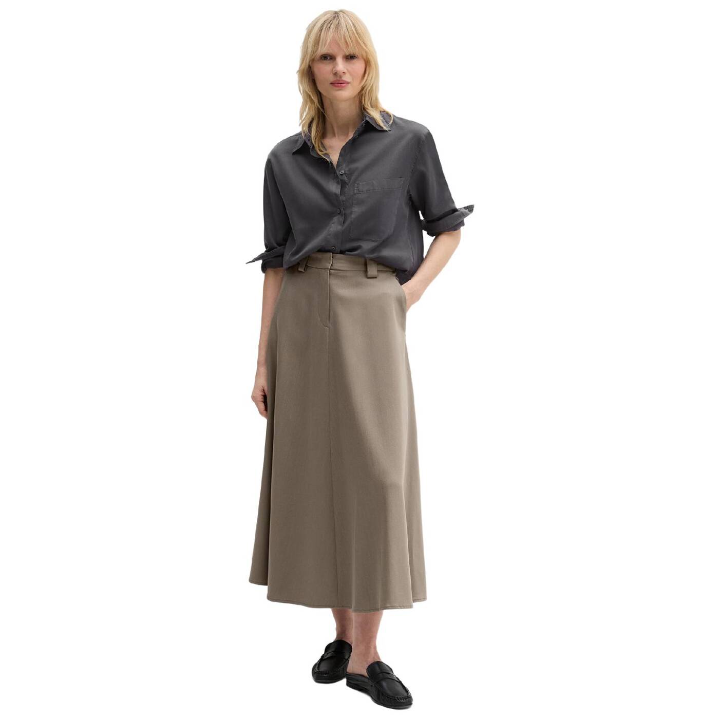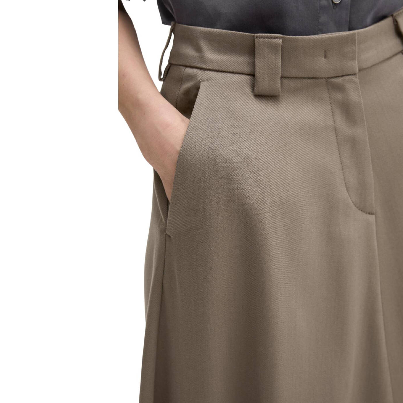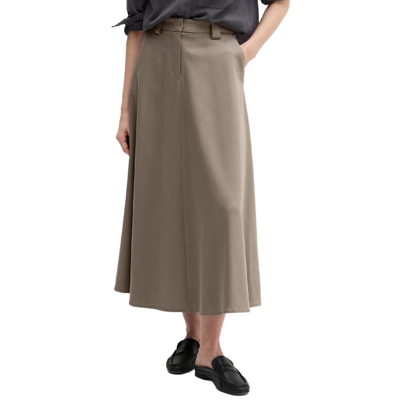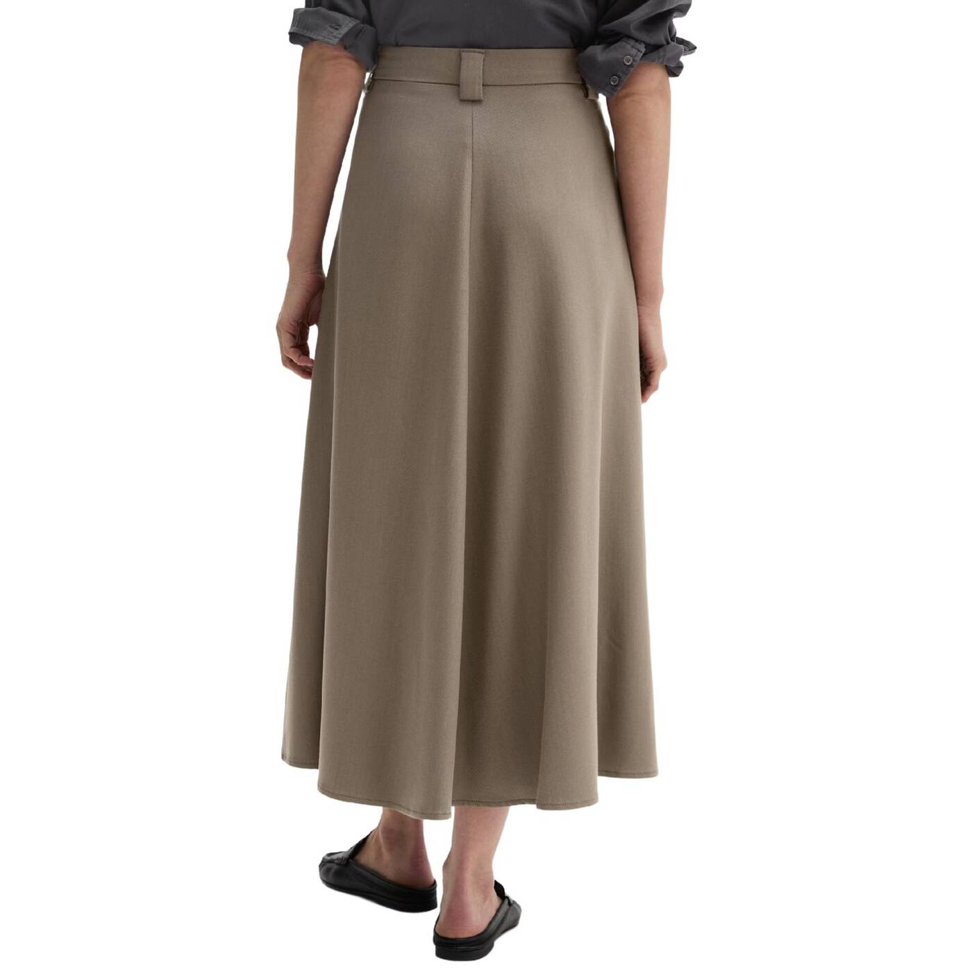 Röcke sind derzeit absolut angesagt. wer auf der suche nach dem perfekten kleidungsstück für büro und alltag ist, wird jetzt mit dem wadenlangen, ausgestellten modell im anzugstil fündig. die klassische bundverarbeitung mit verdecktem hakenverschluss und „fishtail“-design erinnert an traditionelle merkmale der herrenbekleidung. beides verleiht dem rock eine elegante, formelle ästhetik. er hat schräge eingrifftaschen, gürtelschlaufen und mittige teilungsnähte auf vorder- und rückenteil.