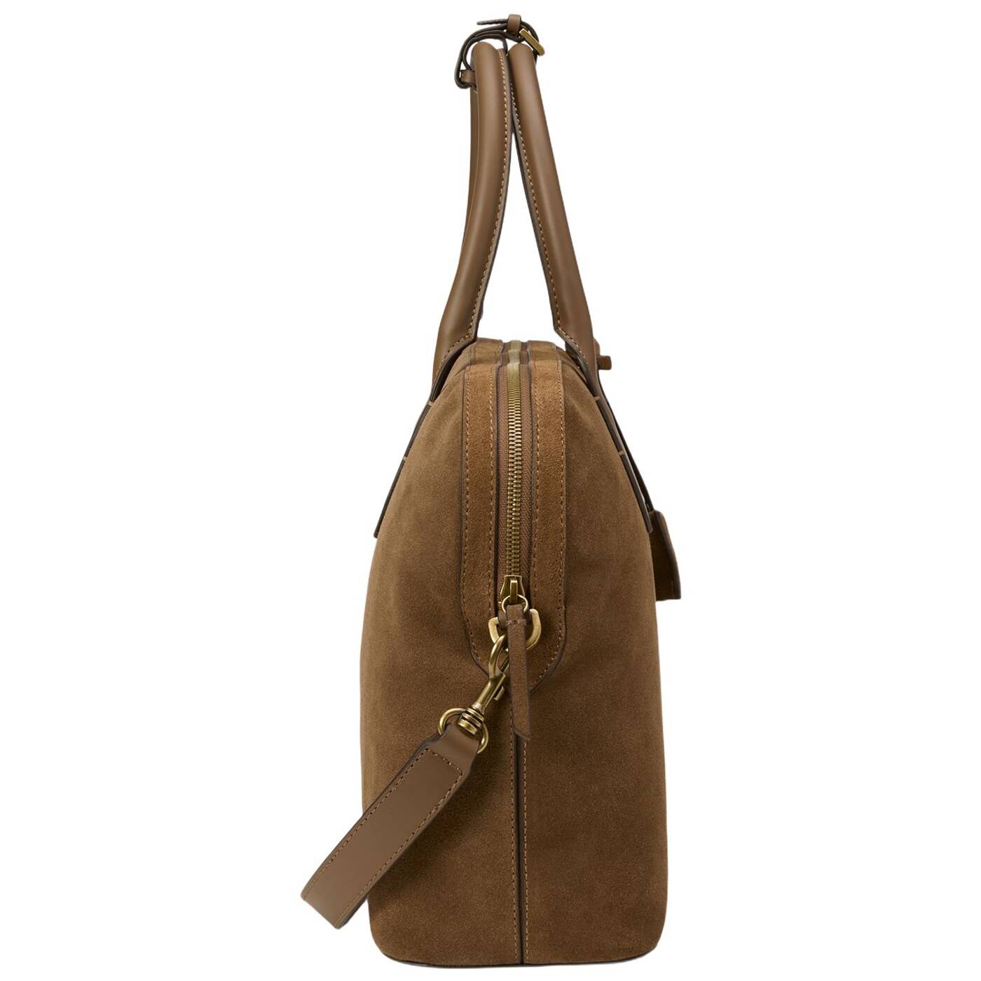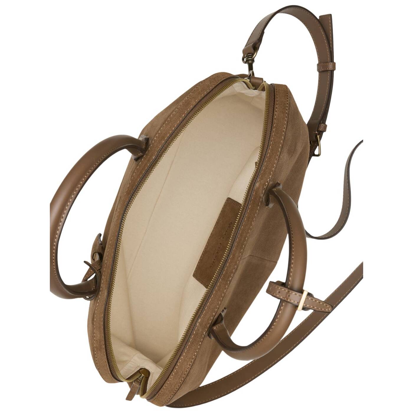 Shopper aus softem Velours-Rindleder in harmonischer Form mit weich abgerundeten Ecken und hochwertigen Messing-Details. Das Hauptfach ist mit Organic Cotton gefüttert und verfügt über ein Zipperfach sowie einen Reißverschluss. Feste Tragegriffe treffen auf einen abnehmbaren, verstellbaren Schulterriemen mit Karabinerhaken – funktional und stilvoll zugleich. Der stabile Boden sorgt für sicheren Stand. Ein feiner Lederriemen verbindet die Griffe, der abnehmbare Lederanhänger mit integrierter Münze setzt ein charmantes, praktisches Detail.