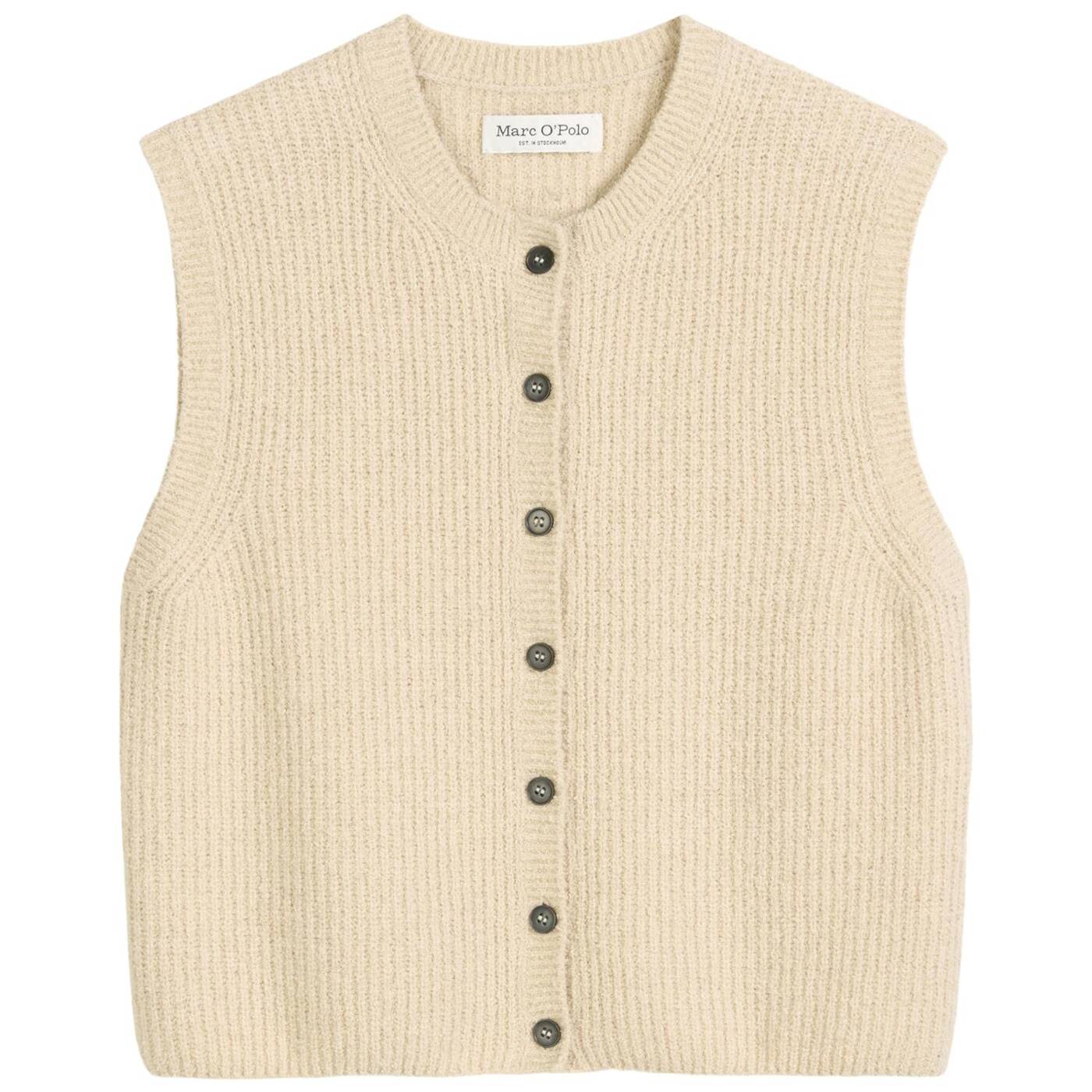 Die lässige, ärmellose Strickweste ist vielseitig kombinierbar. Entweder offen über einem Tanktop oder einem schlichten T-Shirt, geschlossen im Lagenlook über Kleidern und Blusen oder pur auf nackter Haut. Die Weste ist aus einem weichen Bouclégarn gestrickt und hat die charakteristische unregelmäßige Oberfläche mit feinen Knoten und Schlingen. Die Passform ist normal mit Rippdetails an Rundhalsausschnitt, Ärmelbündchen und Saum. Geschlossen wird die Weste mit farblich kontrastierenden Knöpfen.