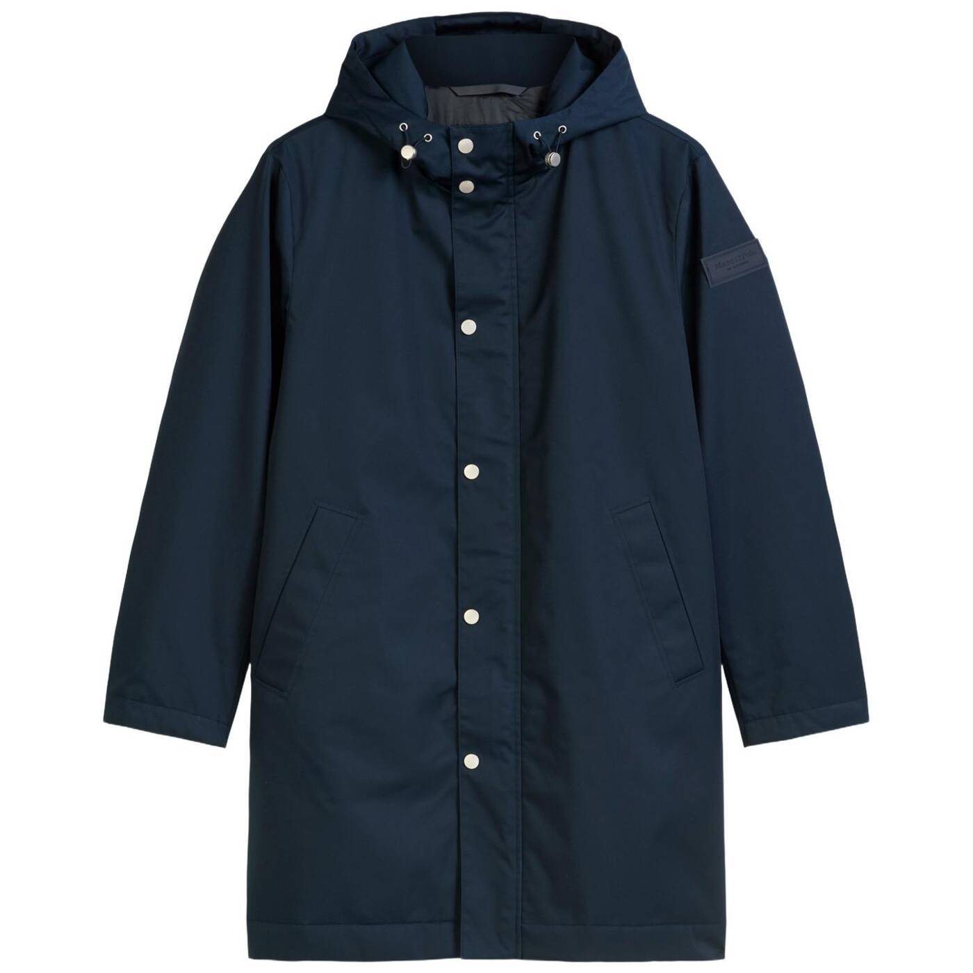 Mittellanger Mantel mit hohem Kragen, Frontverschluss durch Knopfschnürung. Lange, eng anliegende Ärmel und seitliche Taschen. Abgesetzte Schulterpartie für modernes Design.