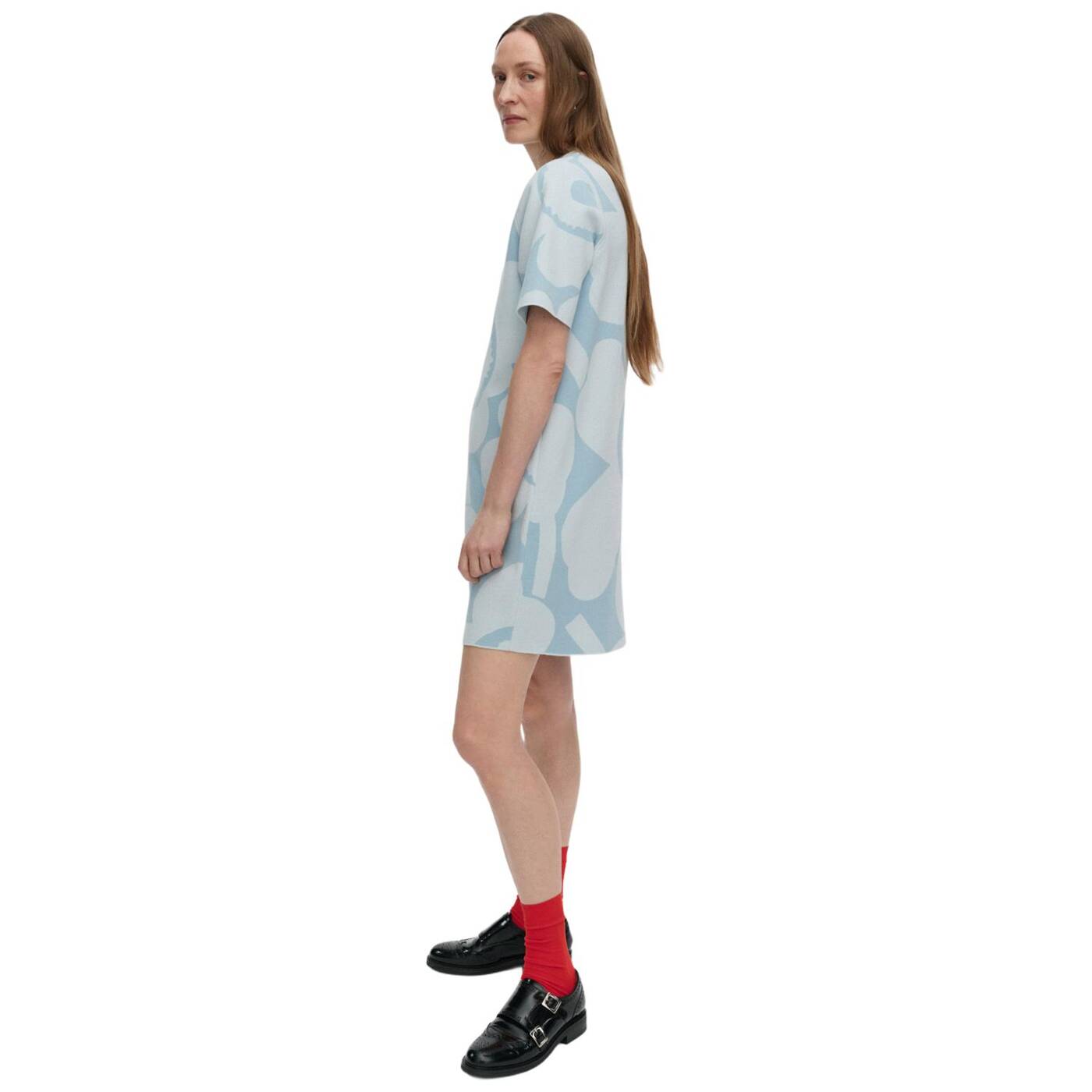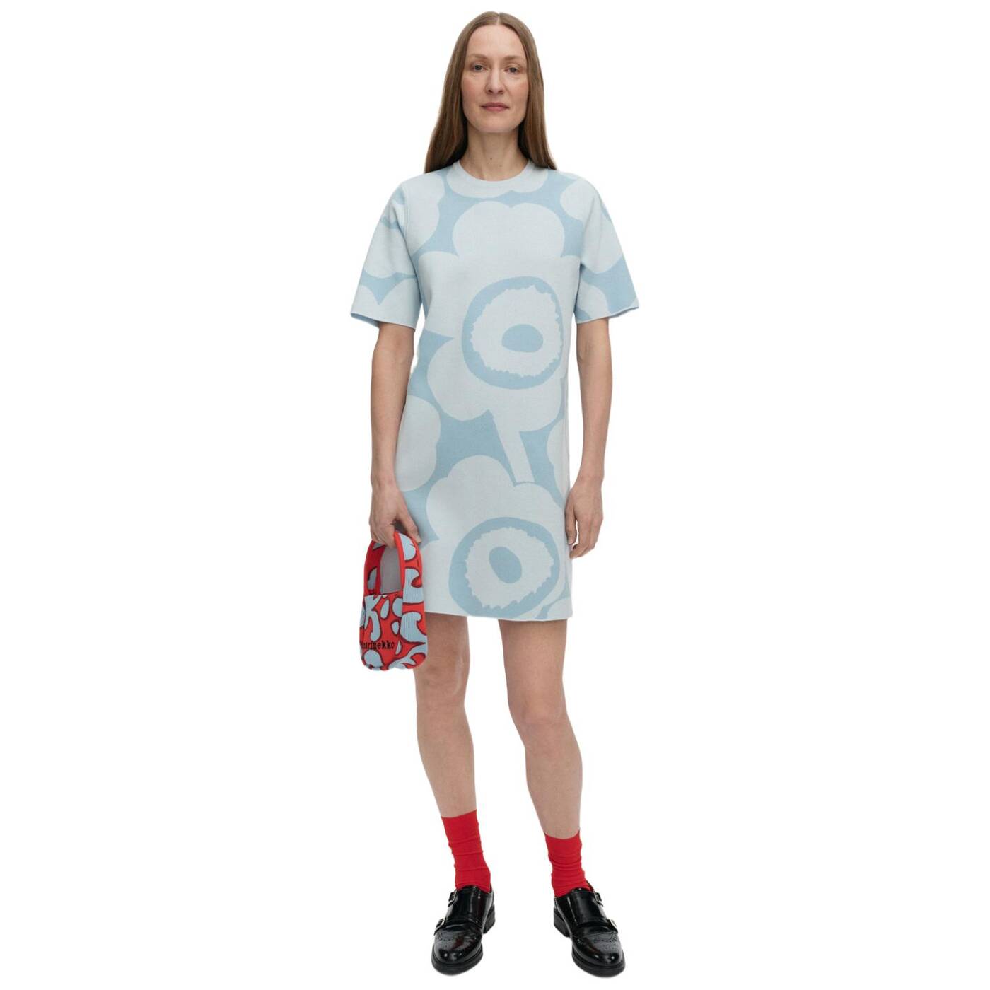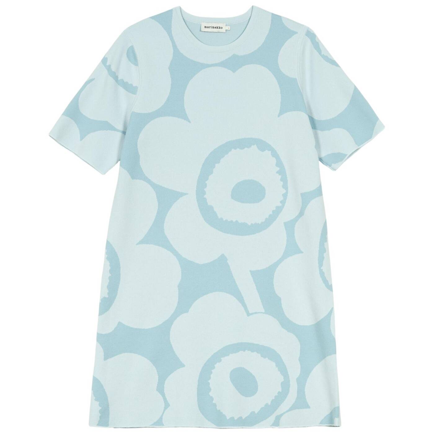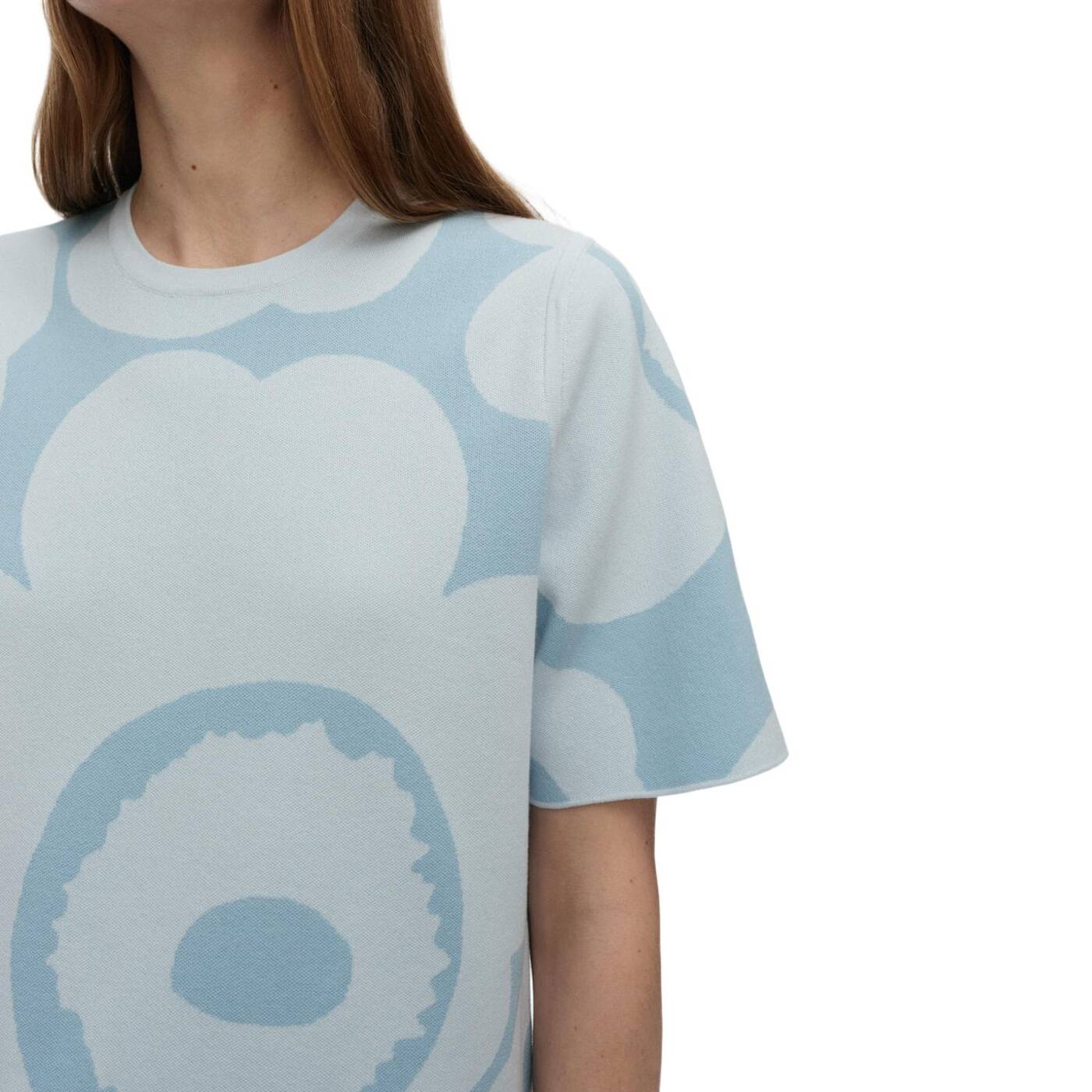 besteht aus dem Jacquard-Strickmuster Unikko, hat einen Rundhalsausschnitt und kurze Ärmel mit