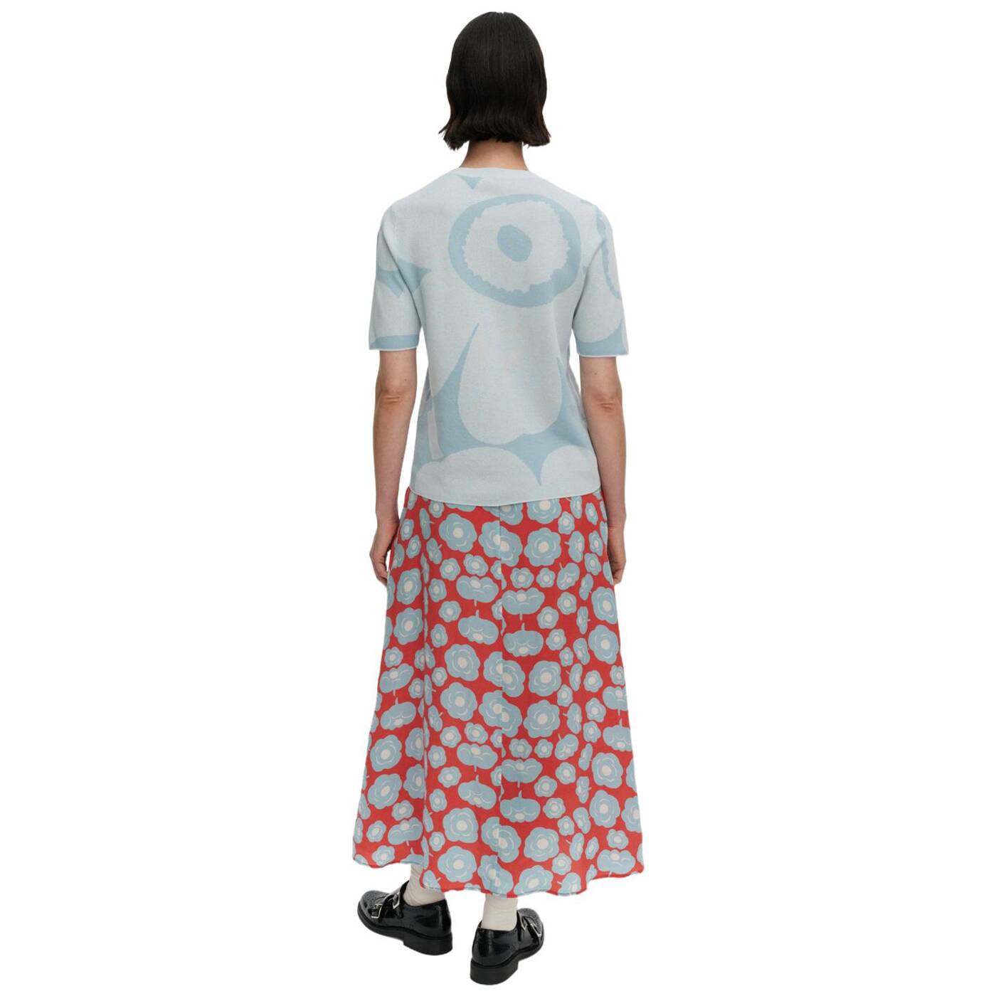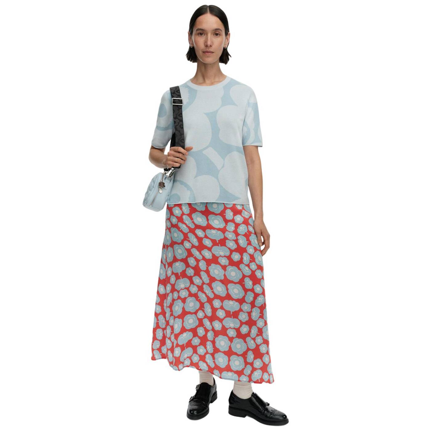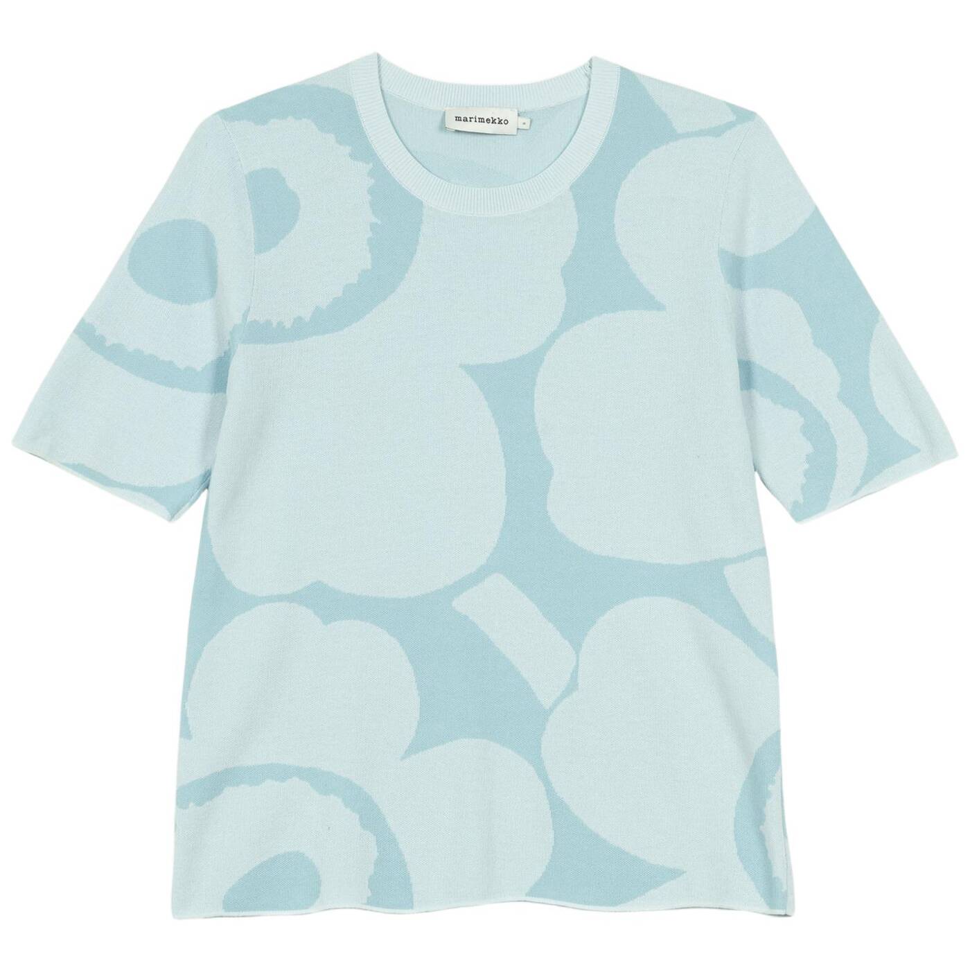 Das Stricktop Oletus hat eine schmale, gerade Passform. Es besticht durch das Jacquard-Strickmuster Unikko, einen Rundhalsausschnitt mit schmalem Rippstrick und kurze, schmale Ärmel.